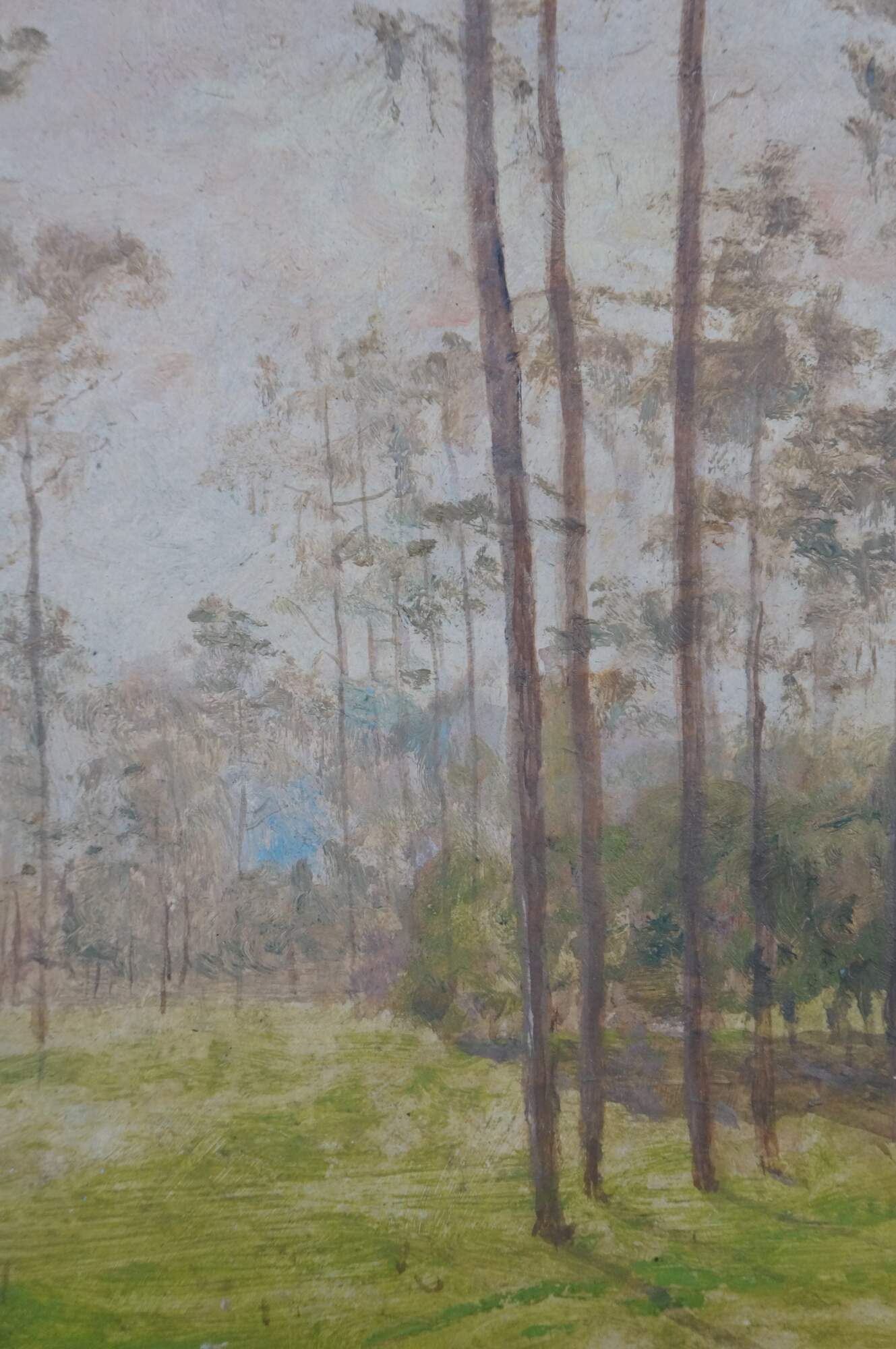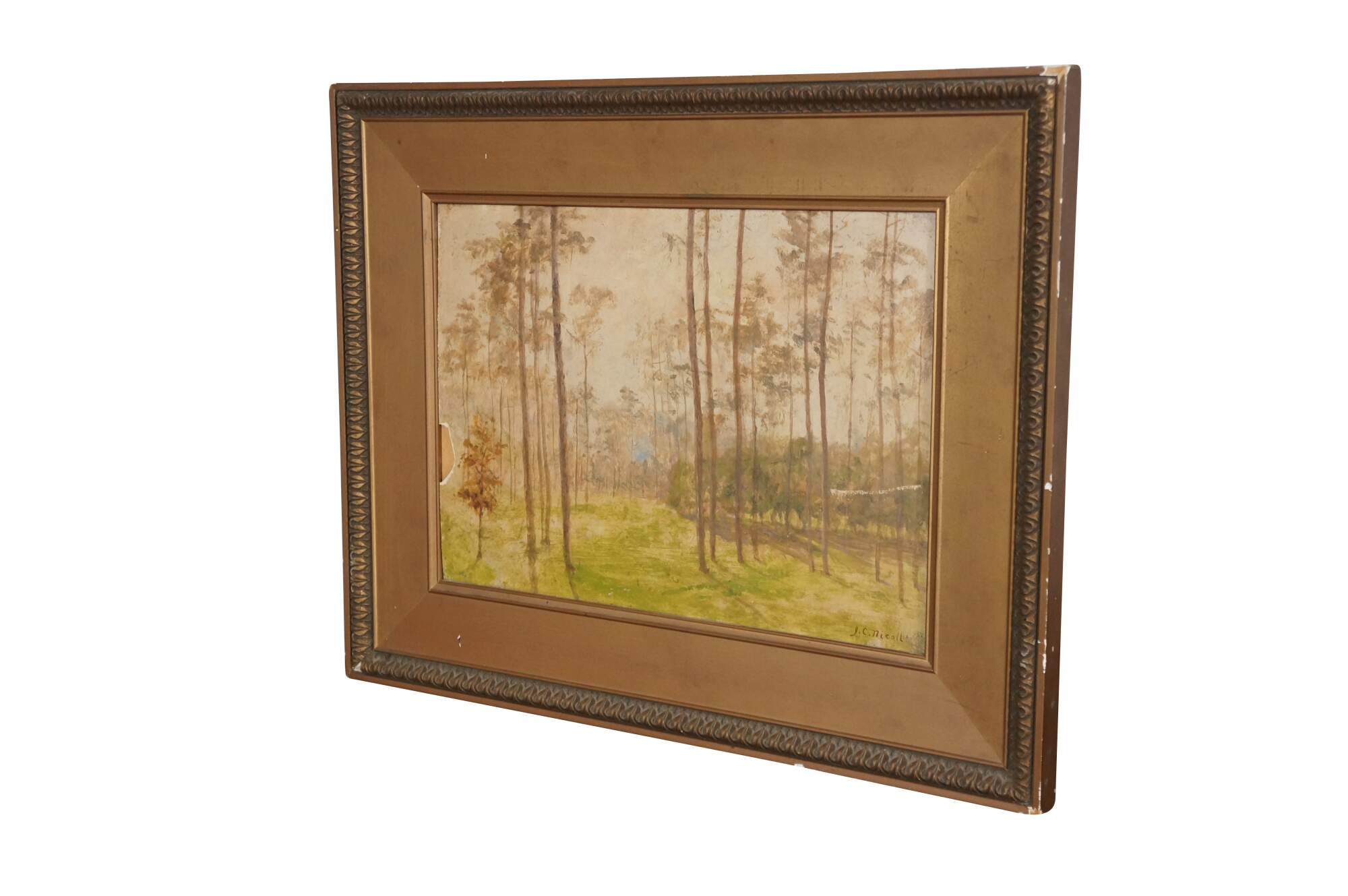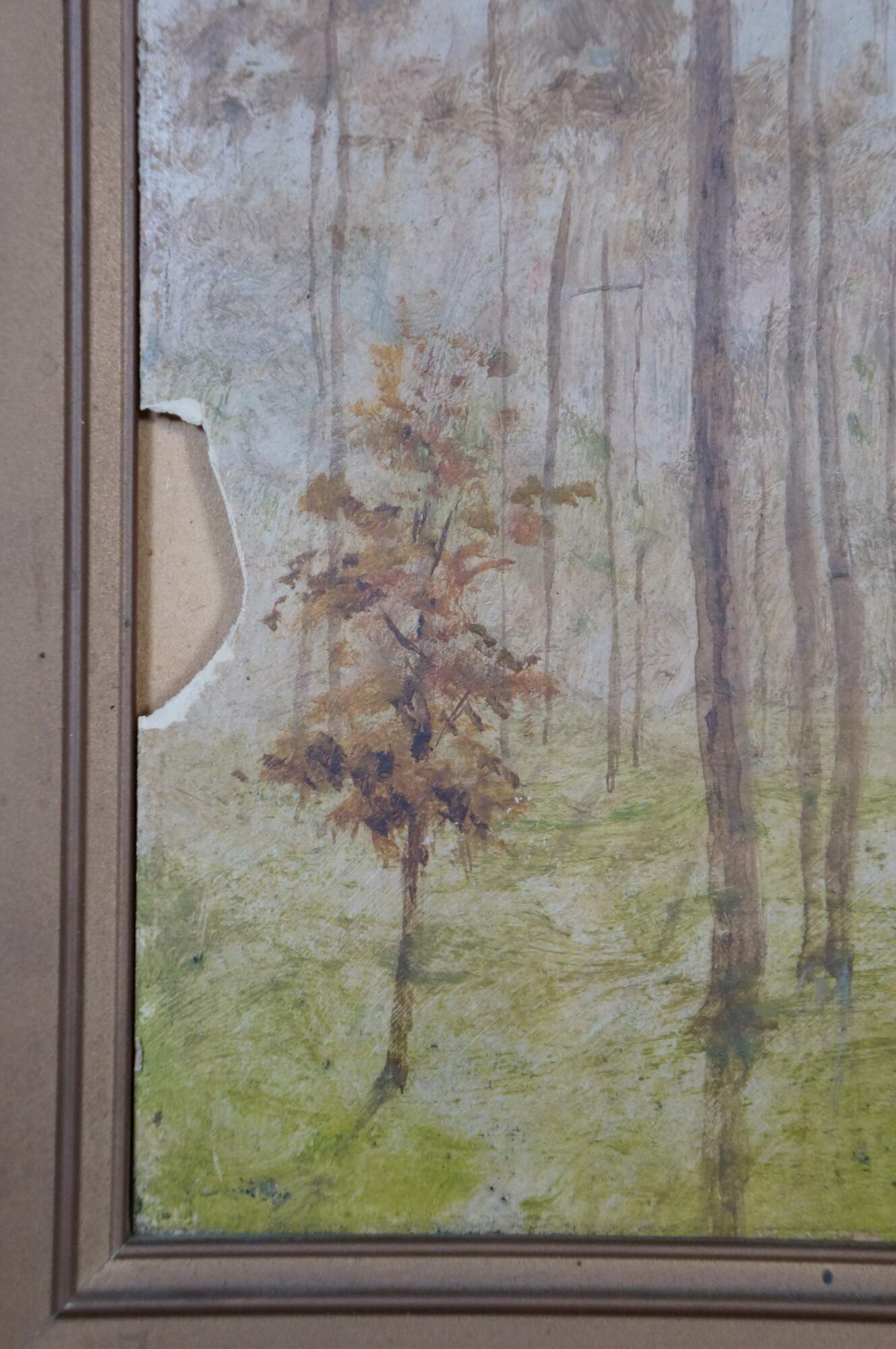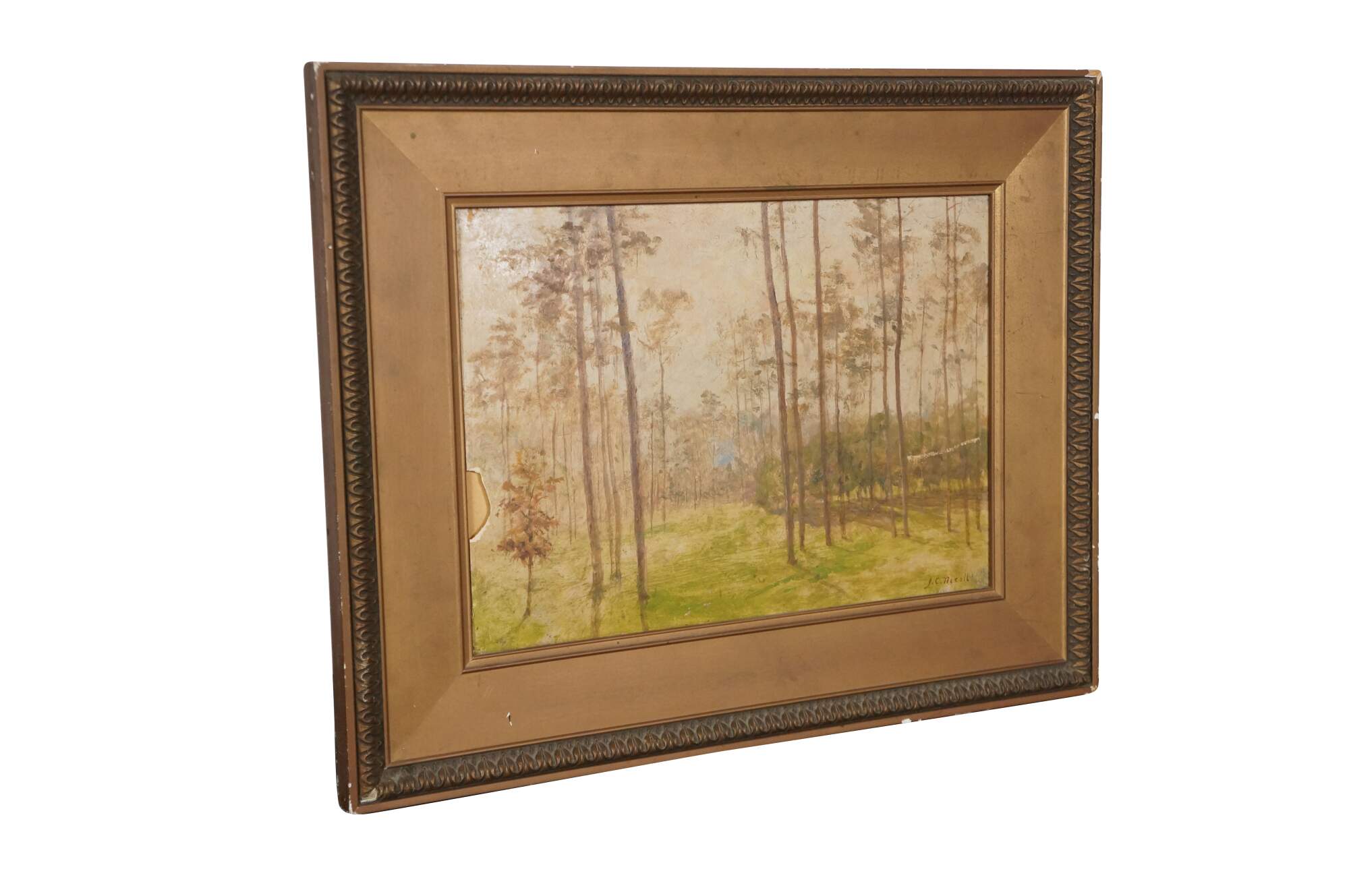 Circa early 20th century oil painting on paper, depicting an autumn forest landscape by James Craig Nicoll. Signed lower right. Beveled giltwood frame with carved detail; no mat.