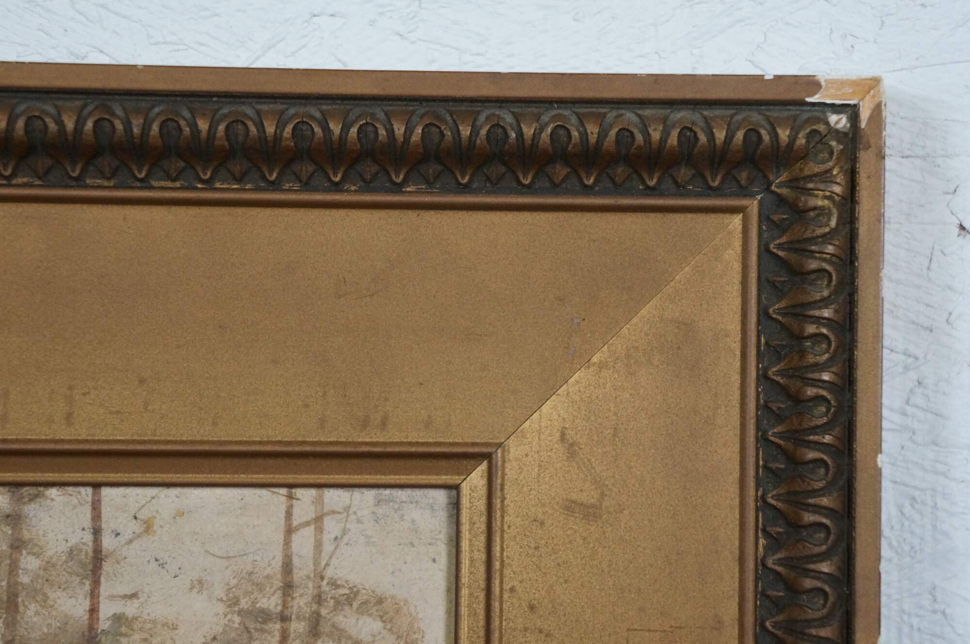 Wear and distressing, some chips to frame; no glass; tear to edge of art, scuff on right.
