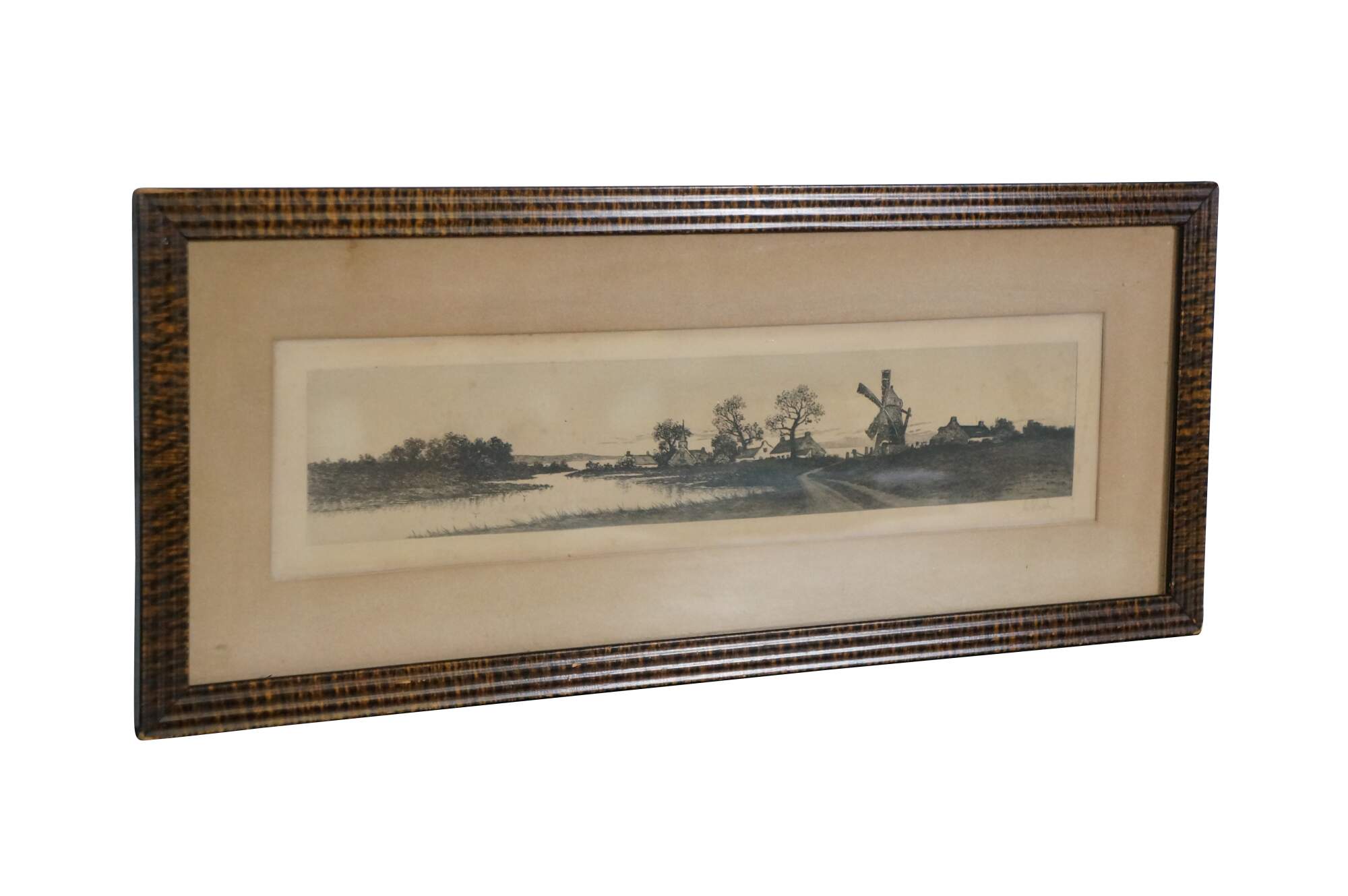 Late 19th-early 20th century black and white etching by Henri Le Riche. Panoramic riverscape / landscape showing a country village and windmill by a river. Pencil signed, lower right. Painted tigerwood frame; white mat.