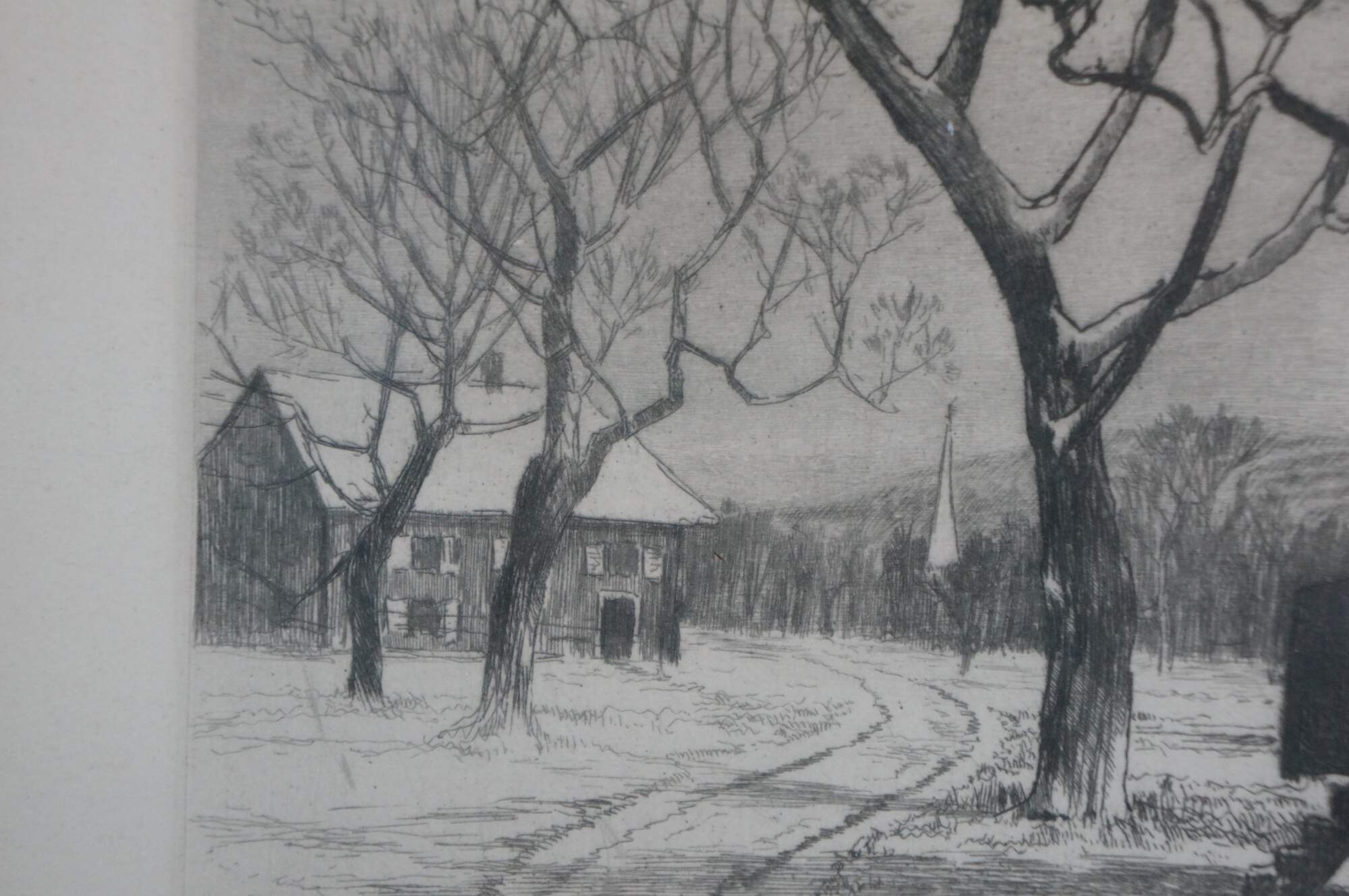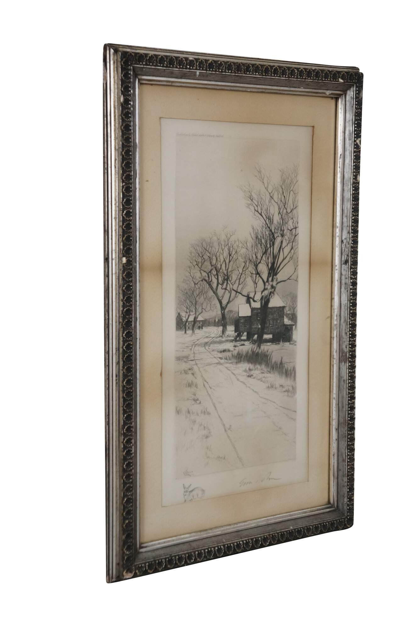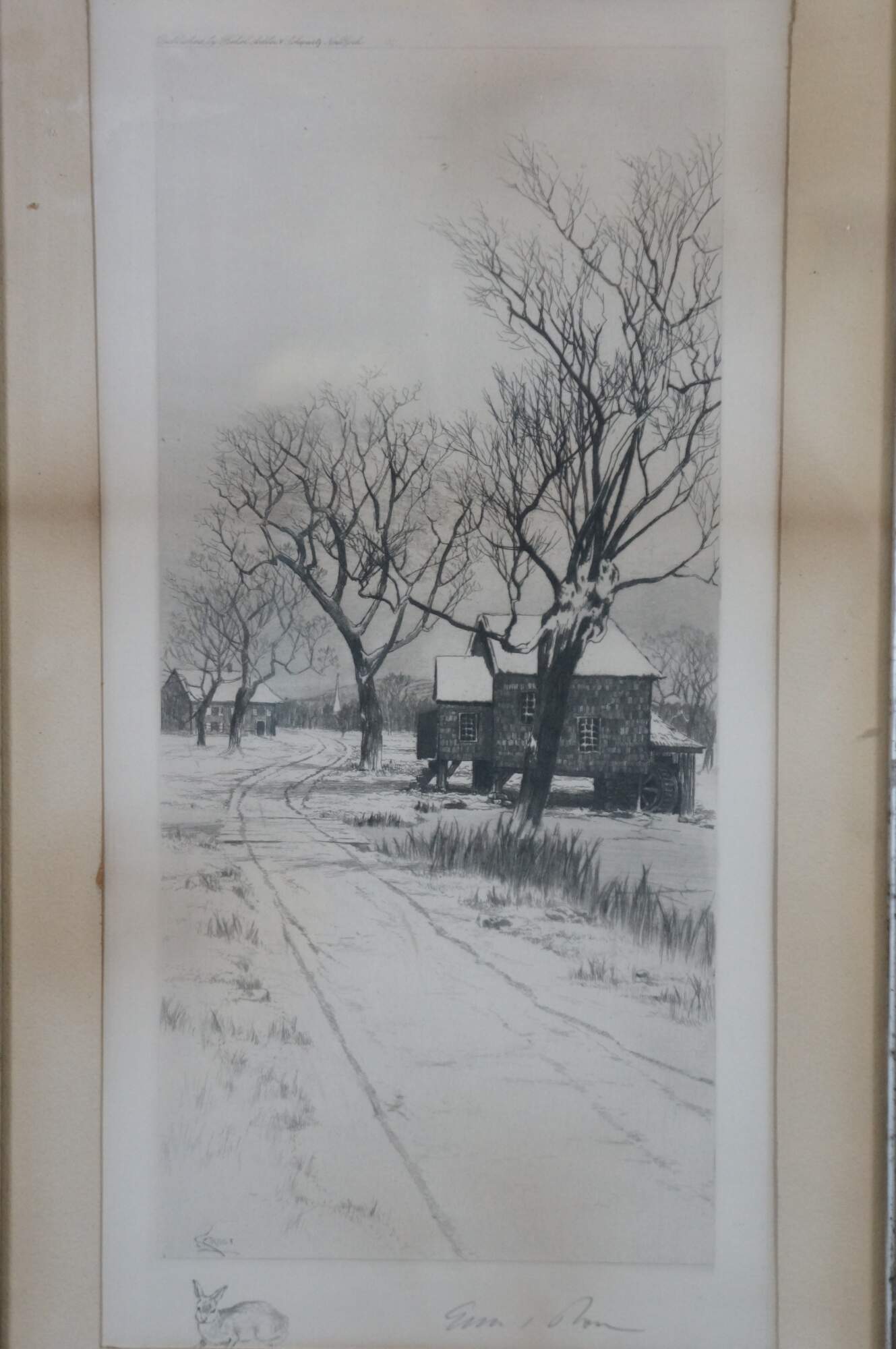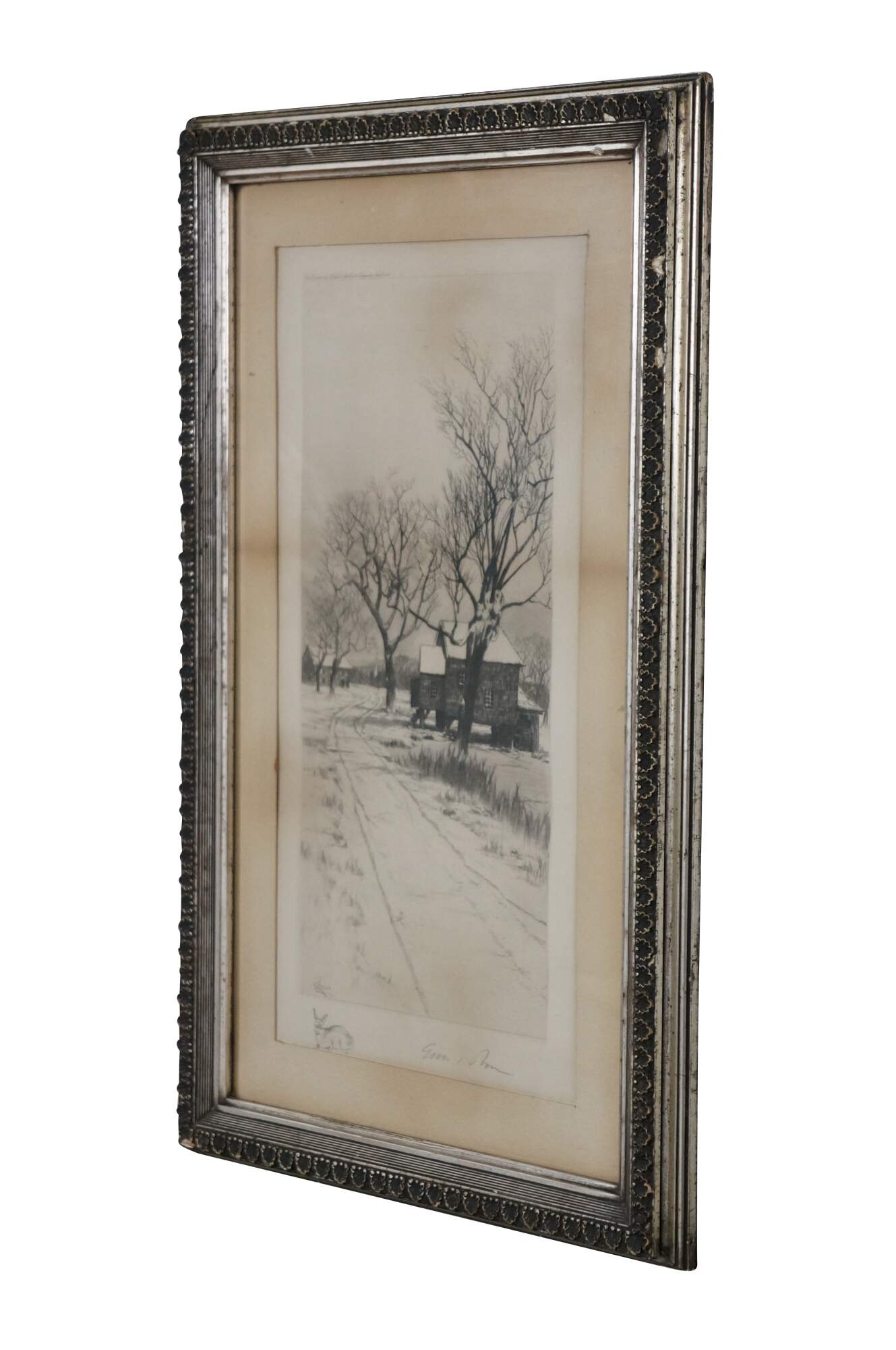Late 19th century black and white etching by Ernest C. Rost. Vertical landscape showing a snow covered road curving past a small watermill. Published by Fishel Adler & Schwartz, New York. Signed in plate EC Rost, lower right. Remarke of a rabbit, lower right edge. Pencil signed, lower left edge. Scallop shell carved silver giltwood frame; white mat.