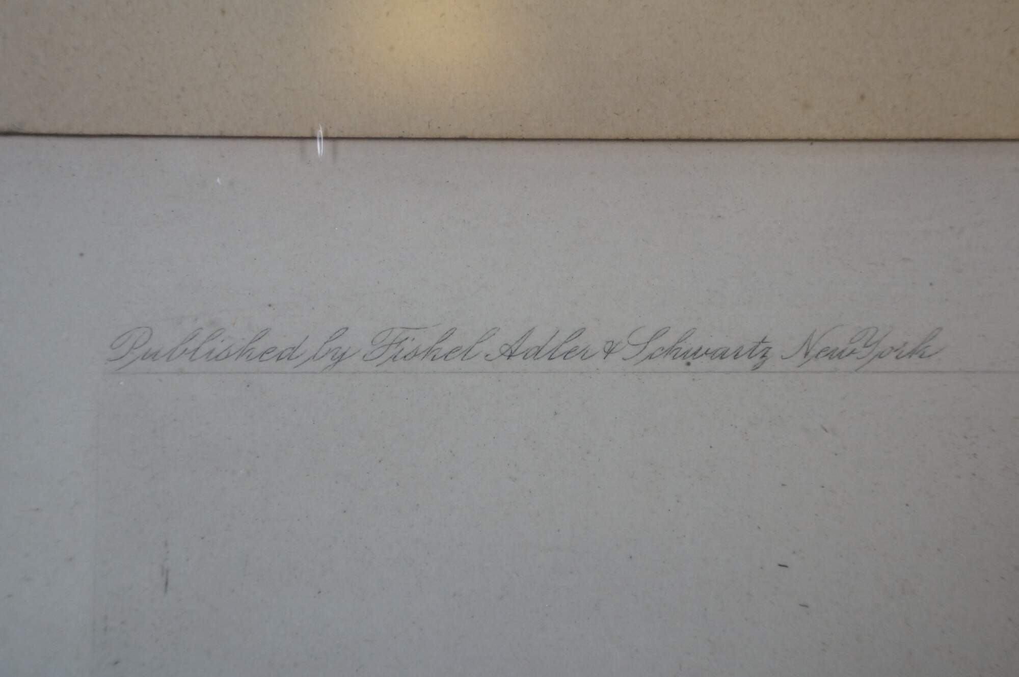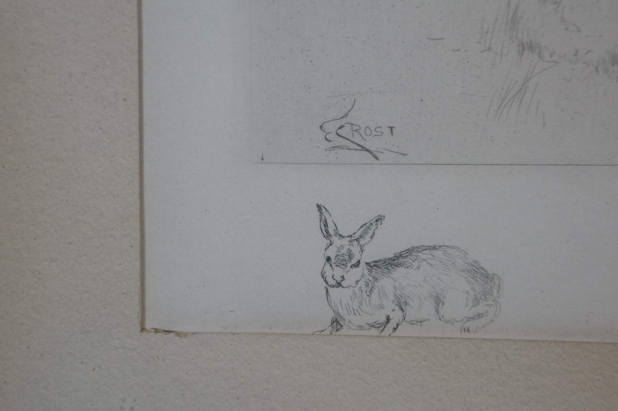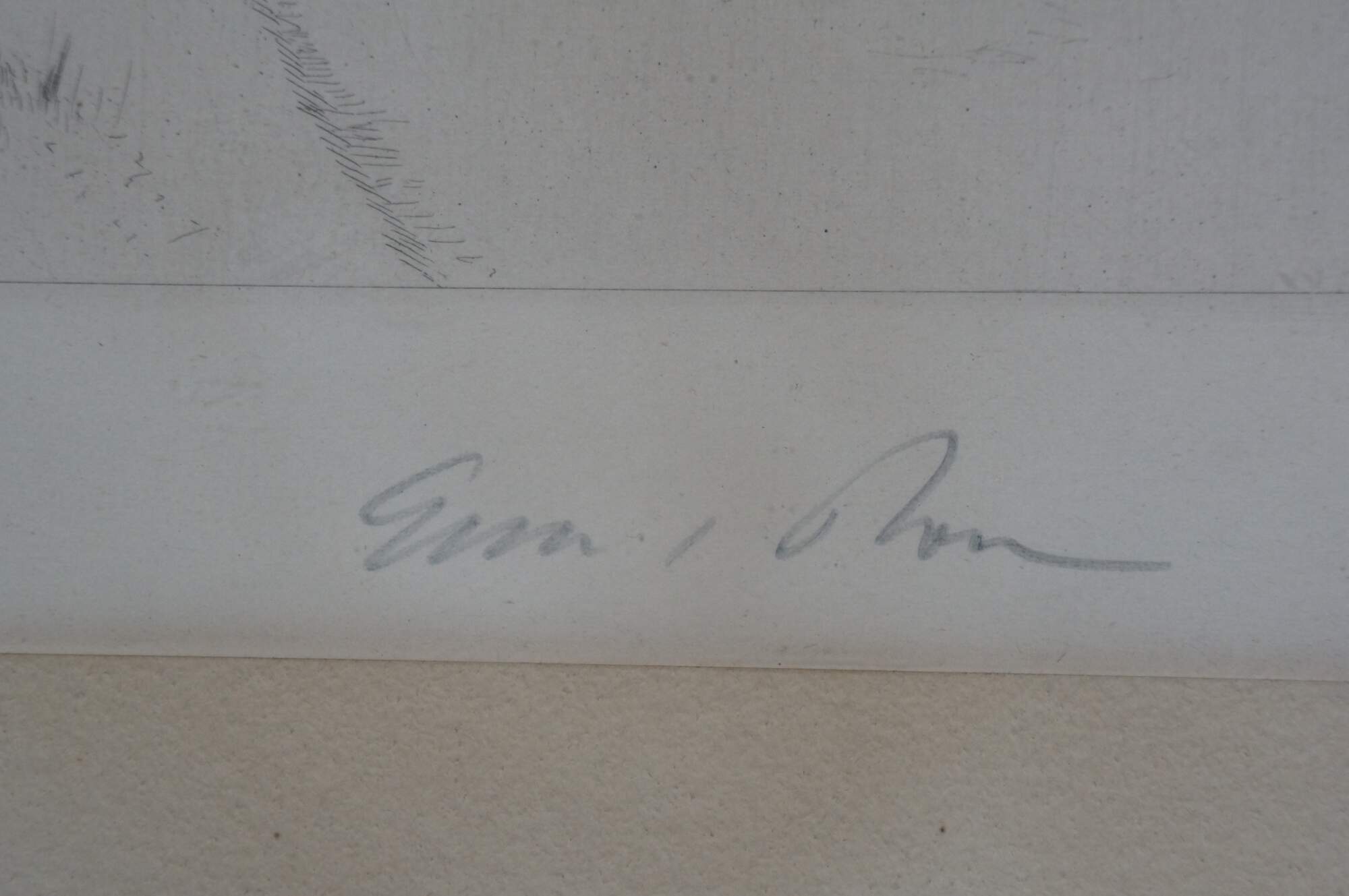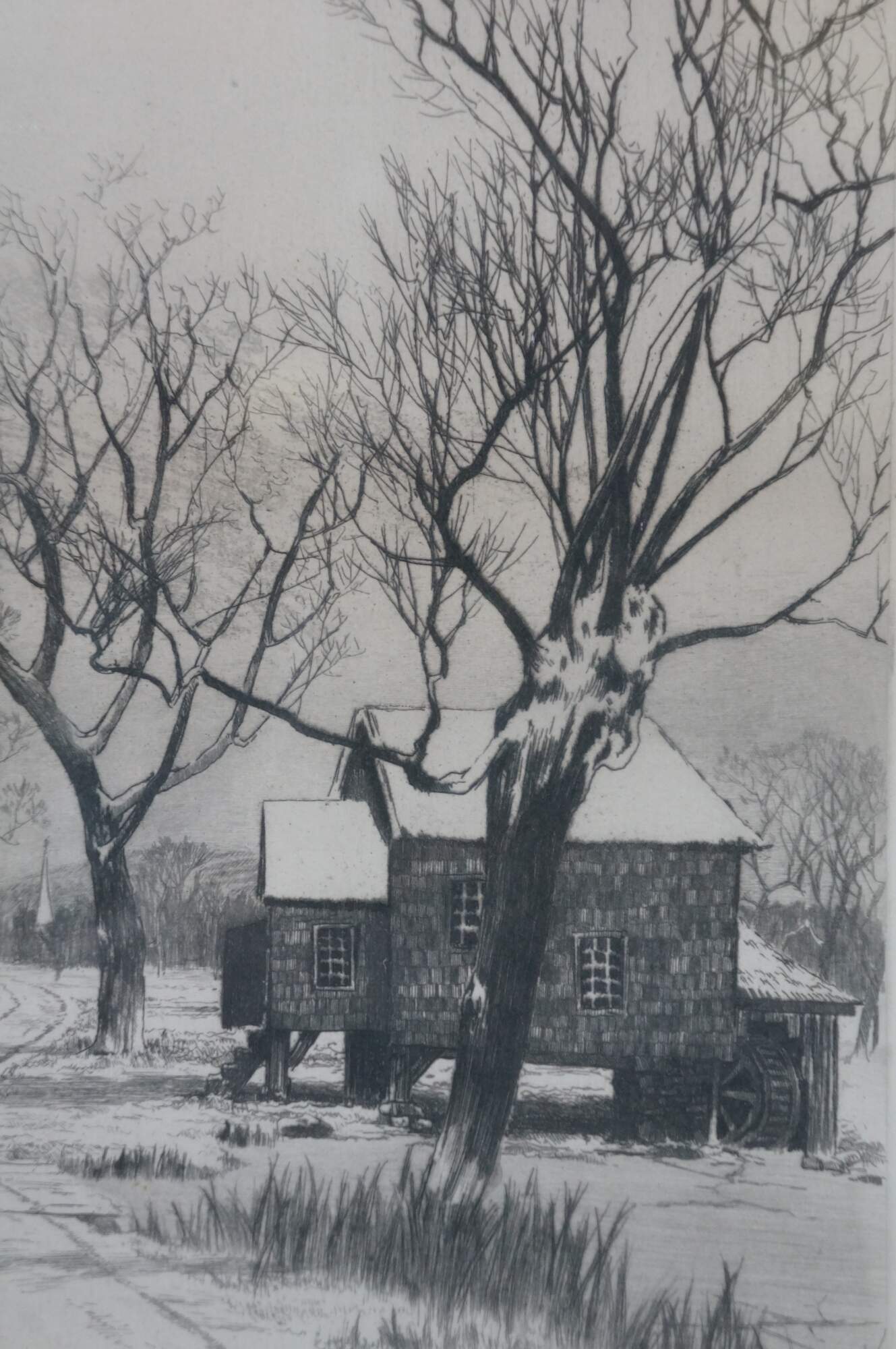 Late 19th century black and white etching by Ernest C. Rost. Vertical landscape showing a snow covered road curving past a small watermill. Published by Fishel Adler & Schwartz, New York. Signed in plate EC Rost, lower right. Remarke of a rabbit, lower right edge. Pencil signed, lower left edge. Scallop shell carved silver giltwood frame; white mat.