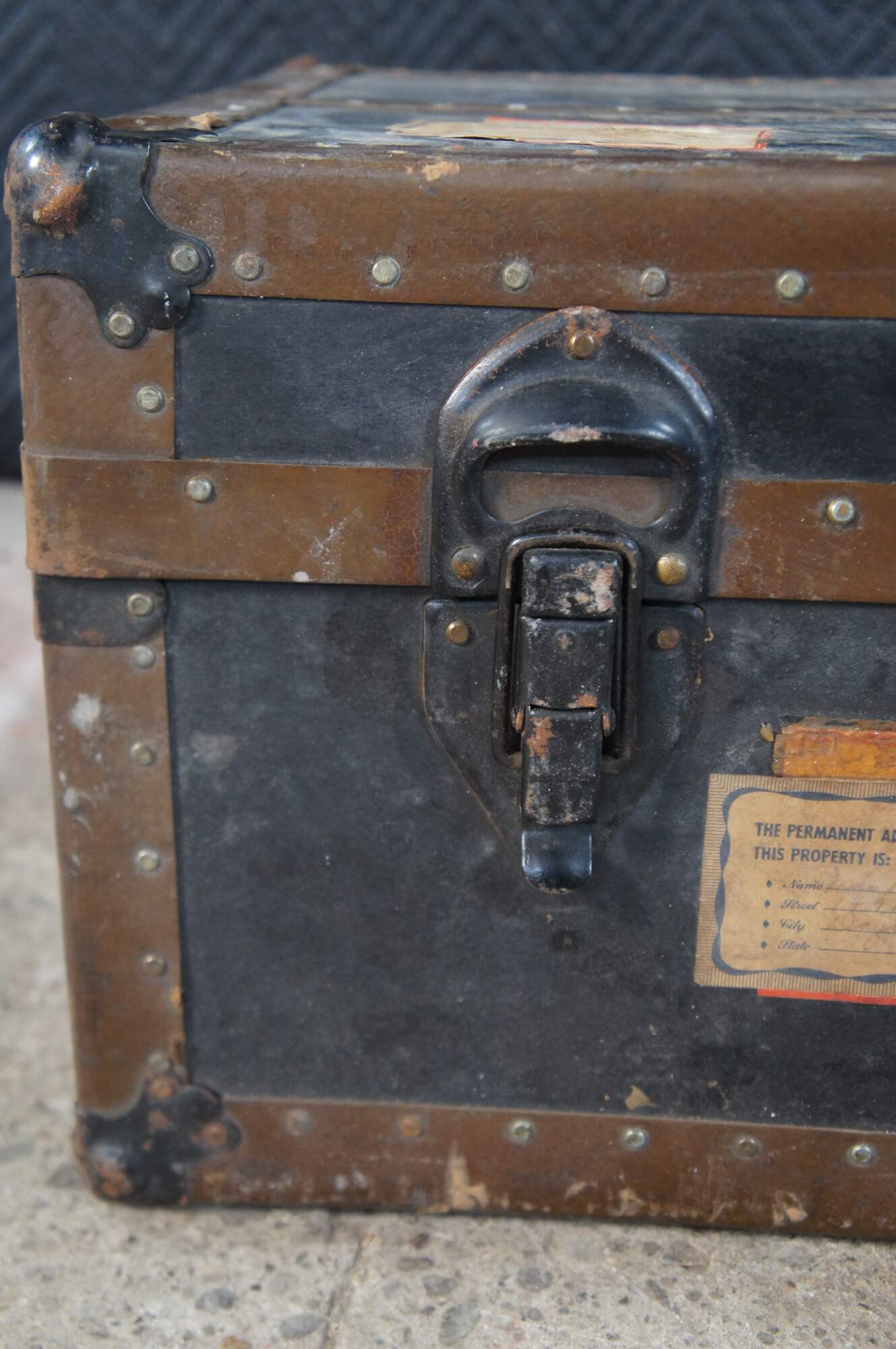 Antique steamer trunk / chest / suitcase featuring brown and black metal banding, nailhead trim, and leather handle.