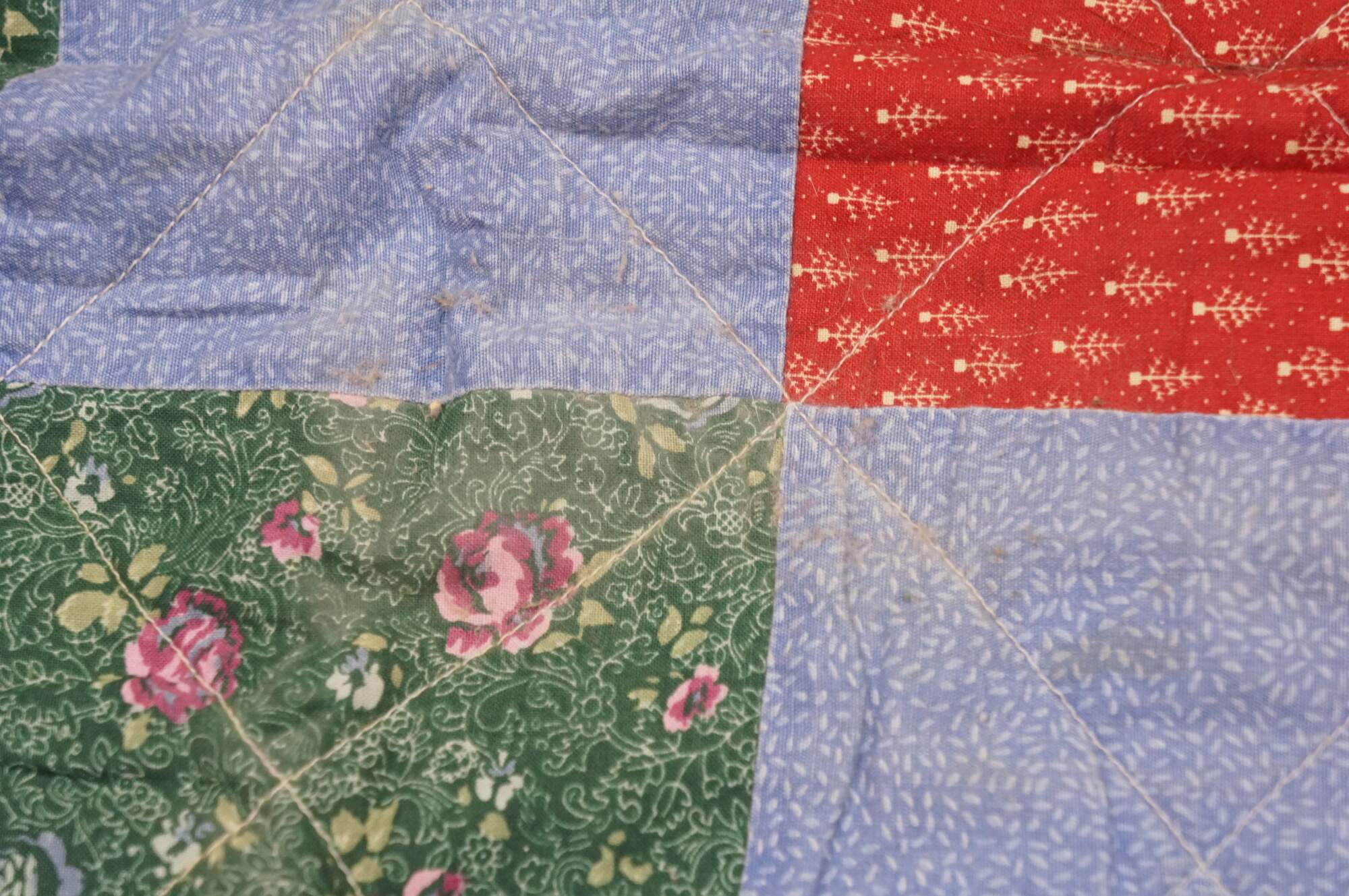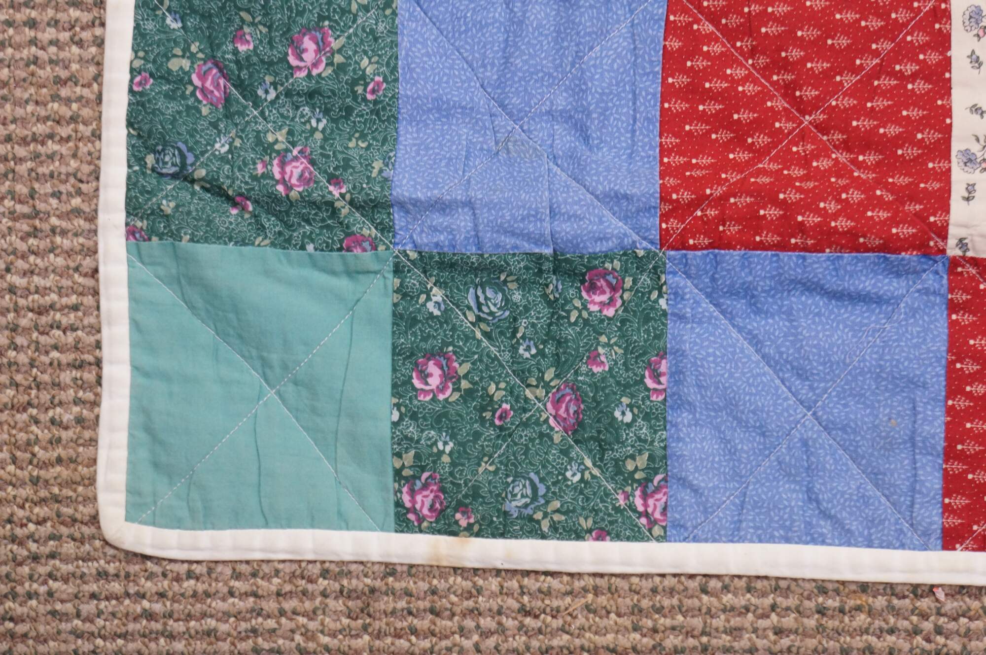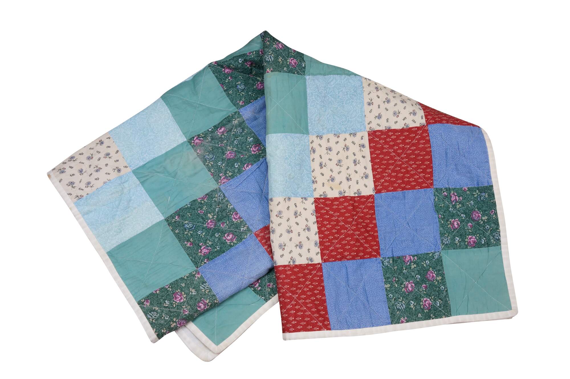 Vintage 20th century child's size diamond pattern patchwork block quilt in green, blue, red, and white. White edgeing and back.