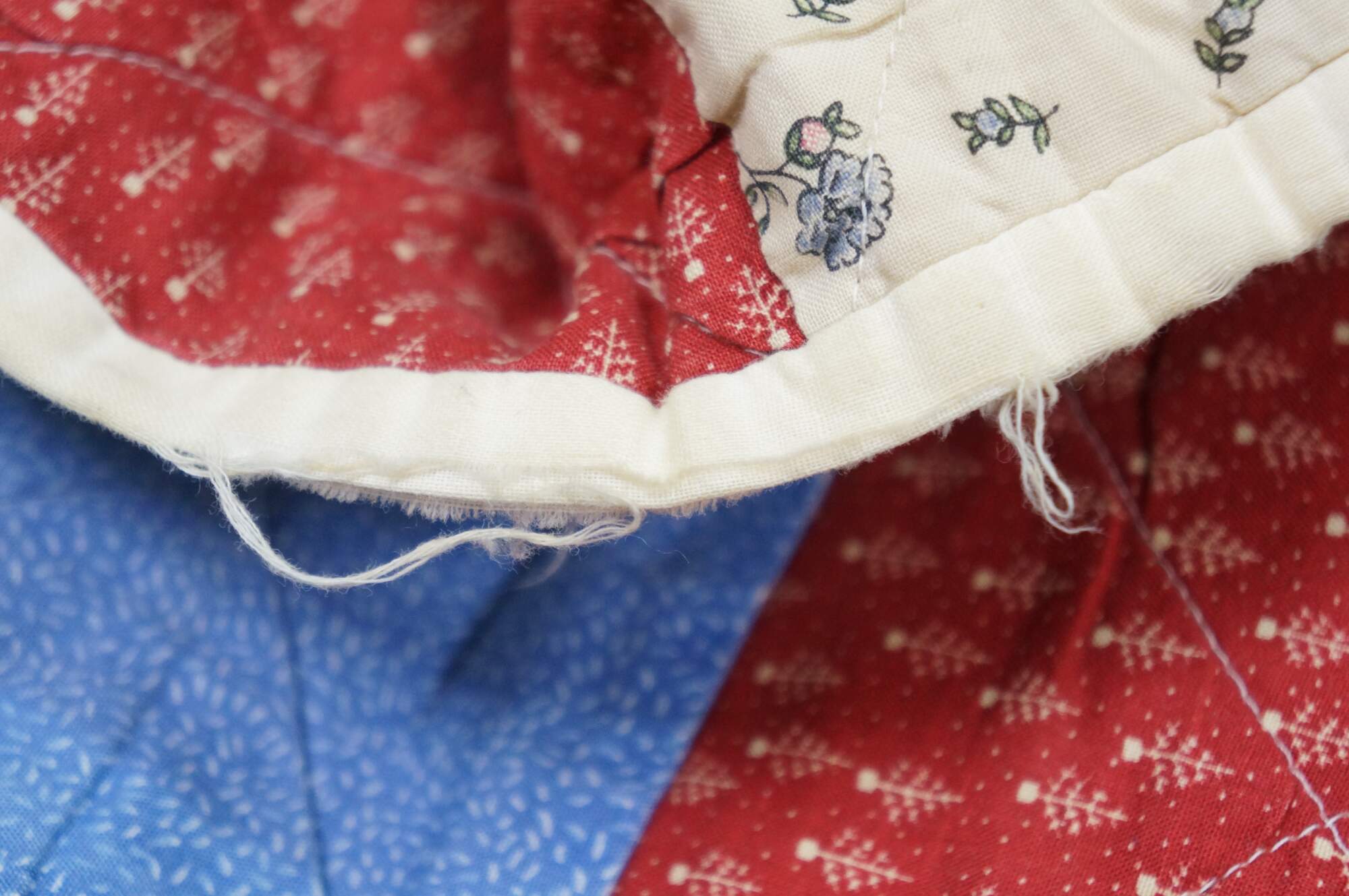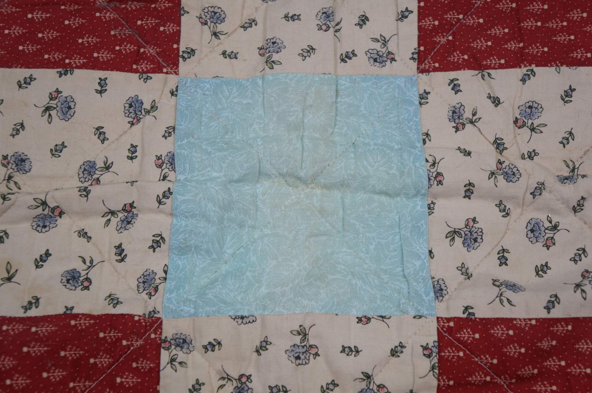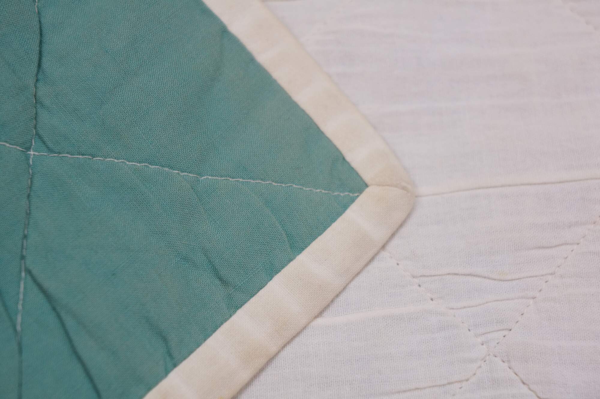 Vintage 20th century child's size diamond pattern patchwork block quilt in green, blue, red, and white. White edgeing and back.