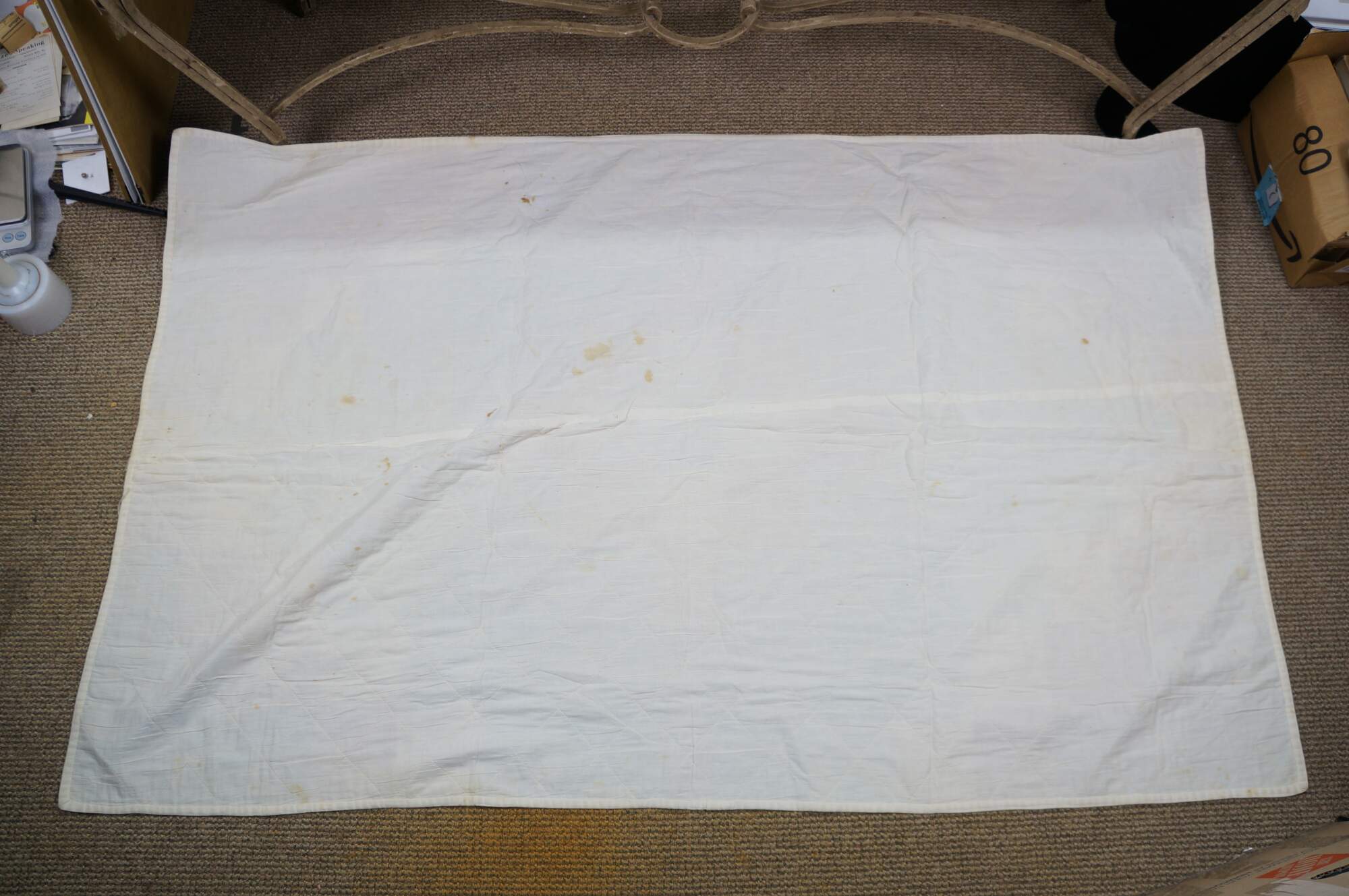 Wear and distressing from age, staining, fading.