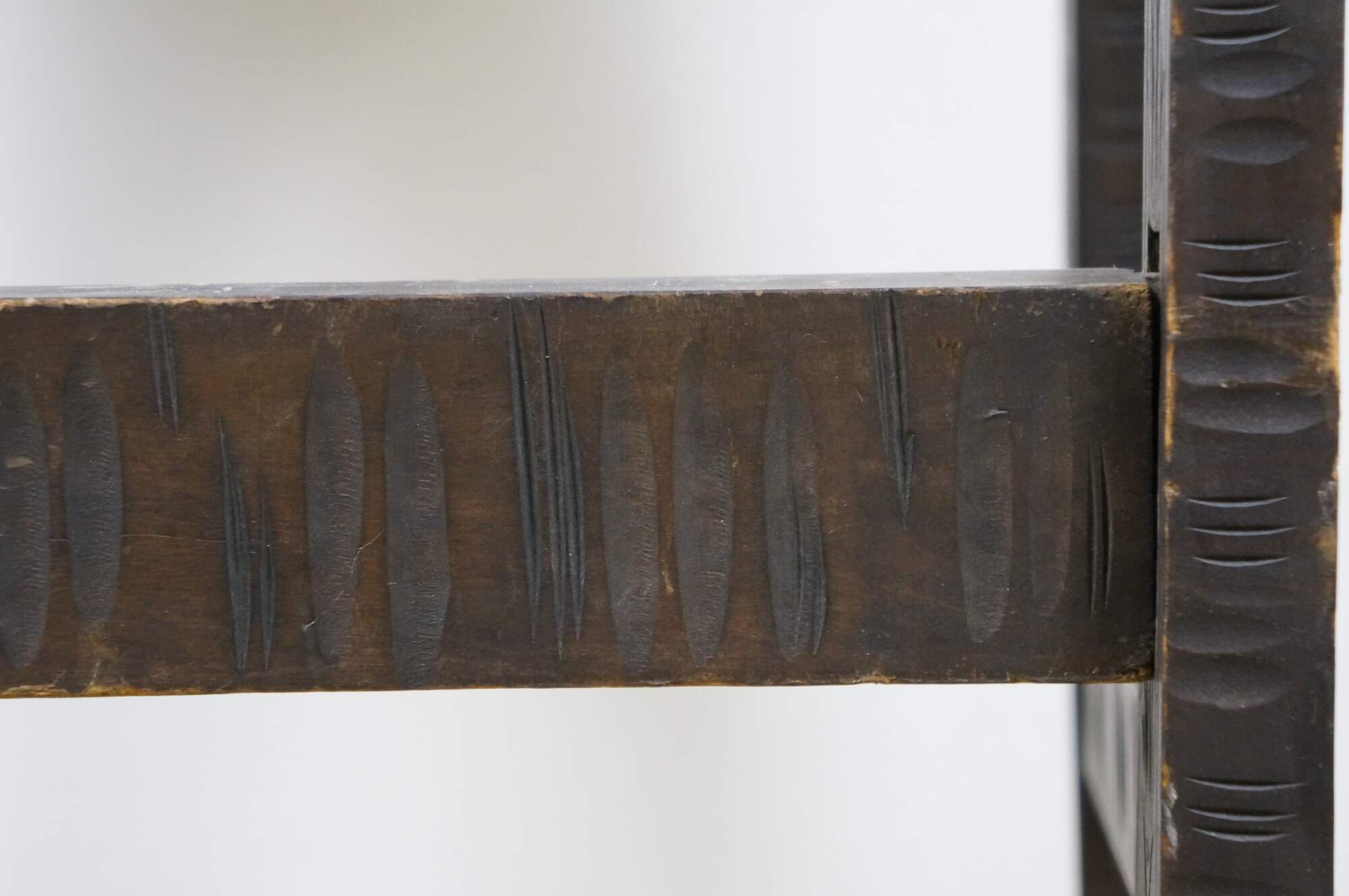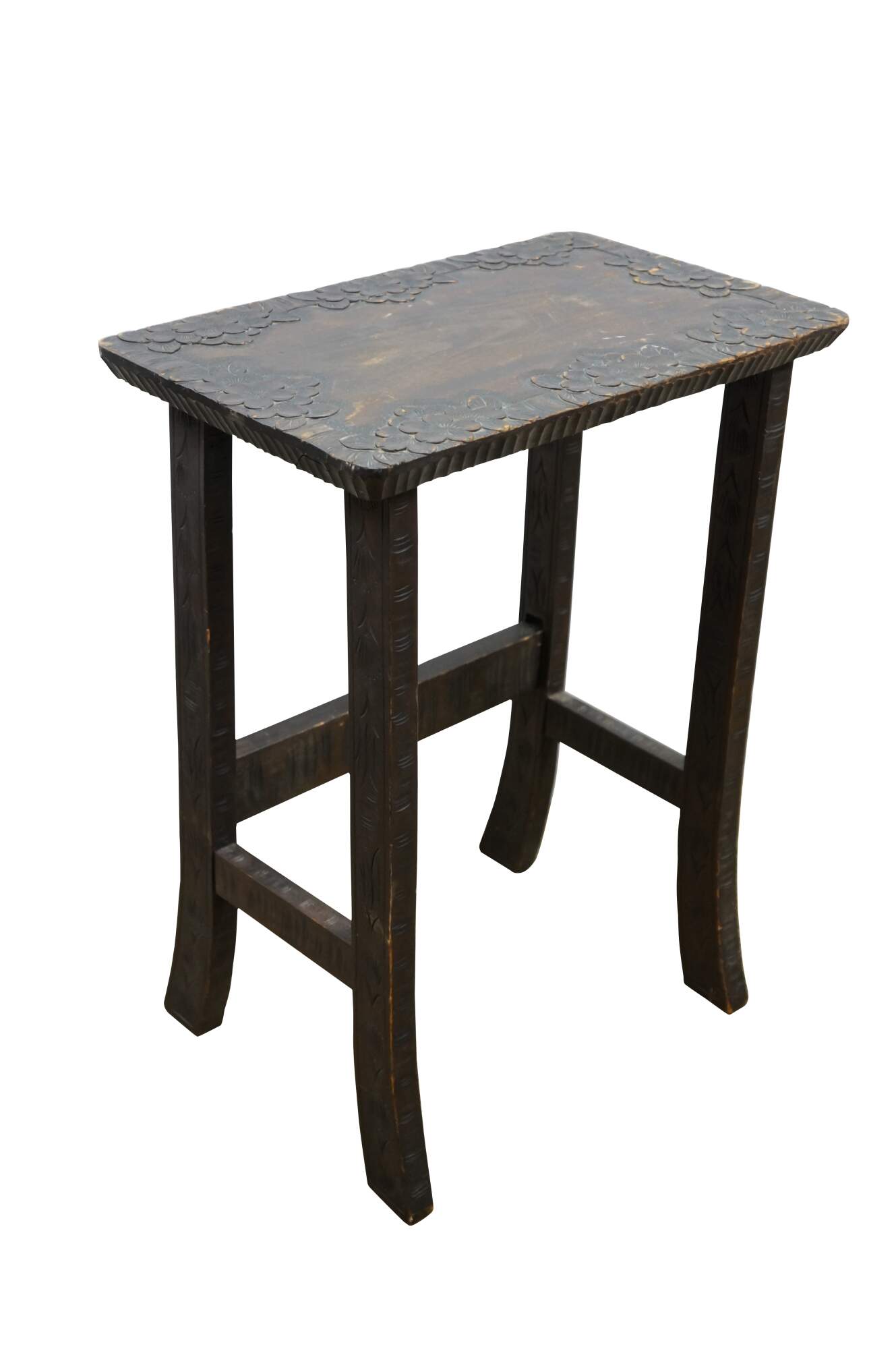 Antique Jacobean walnut accent table or stand. Rectangular form with sabre legs and stretchers on three sides of the base. Top carved with a frame of dogwood blossoms.