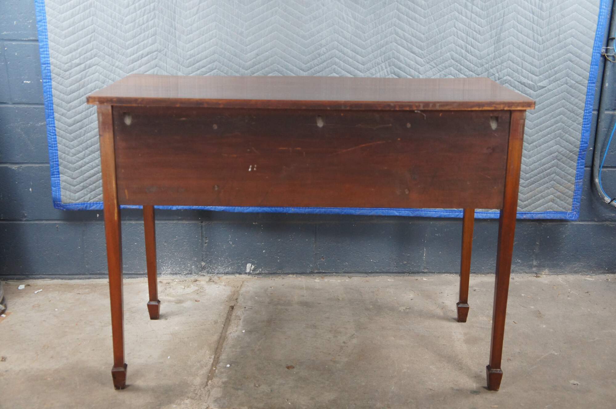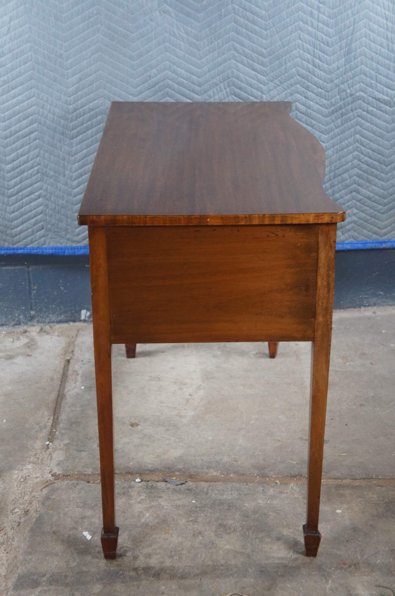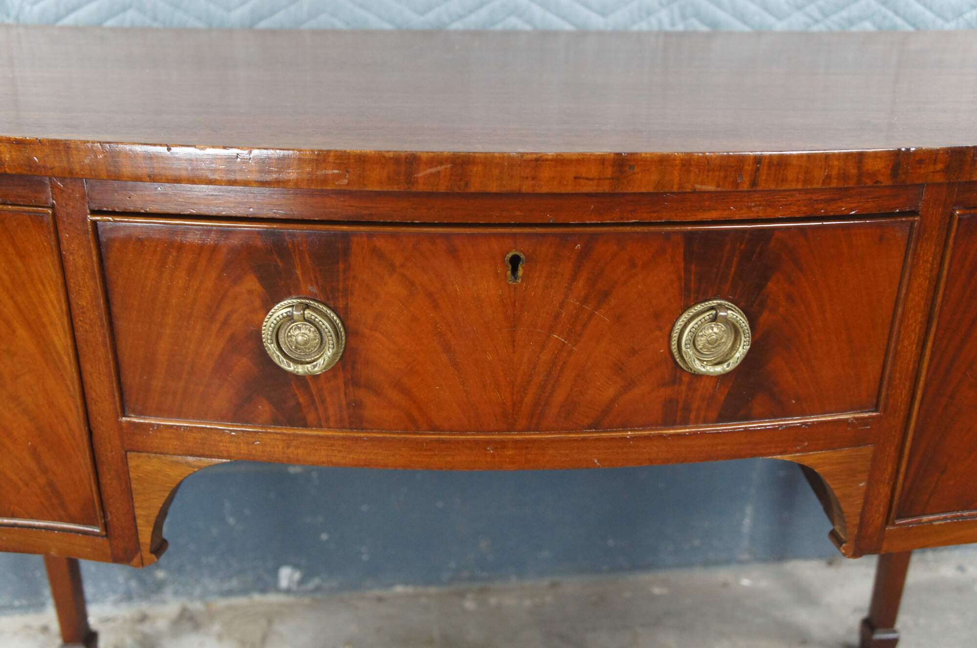 A beautiful antique George III sideboard. Features a mahogany frame with serpentine front over three flame mahogany drawers and square tapered legs leading to spade feet. Due to its versatile size, this piece would also work as a writing desk.