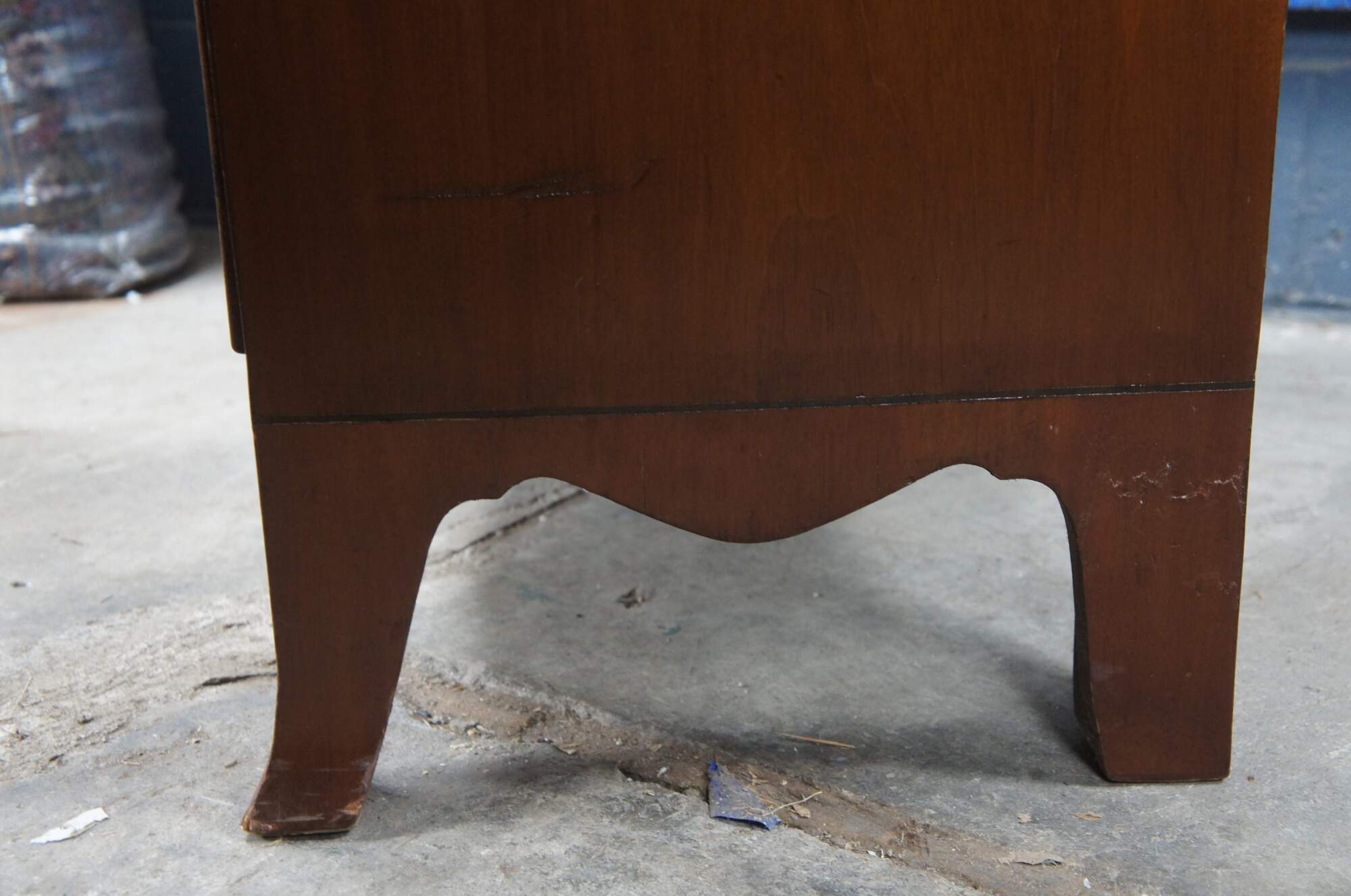2 Antique English Hepplewhite style Bachelor's Chests. Each features a mahogany frame with four drawers, a lower serpentine apron and flared legs. The two chest are slightly different sizes and tones. One has a matchbook burled veneer.