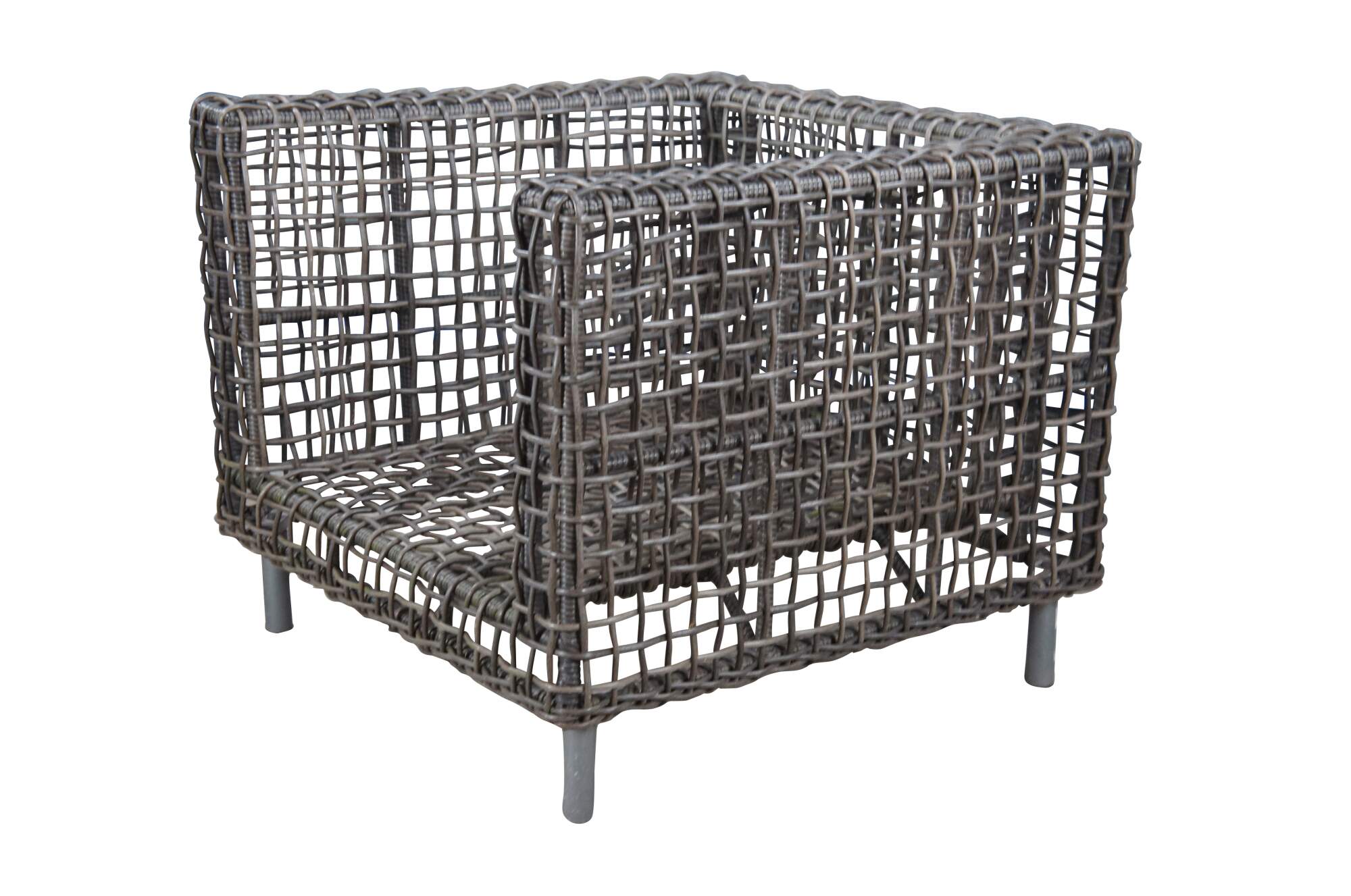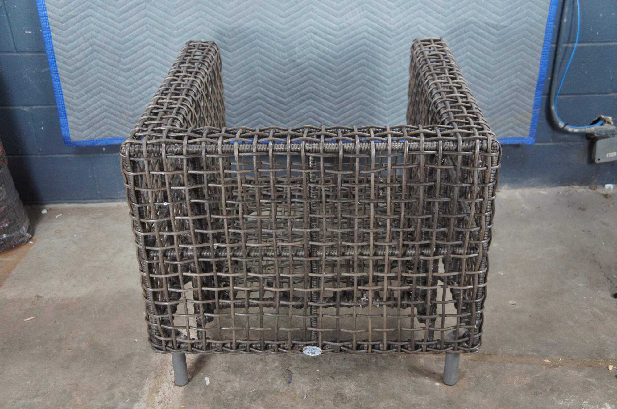 Woven wicker all weather outdoor patio chair by Arhaus.