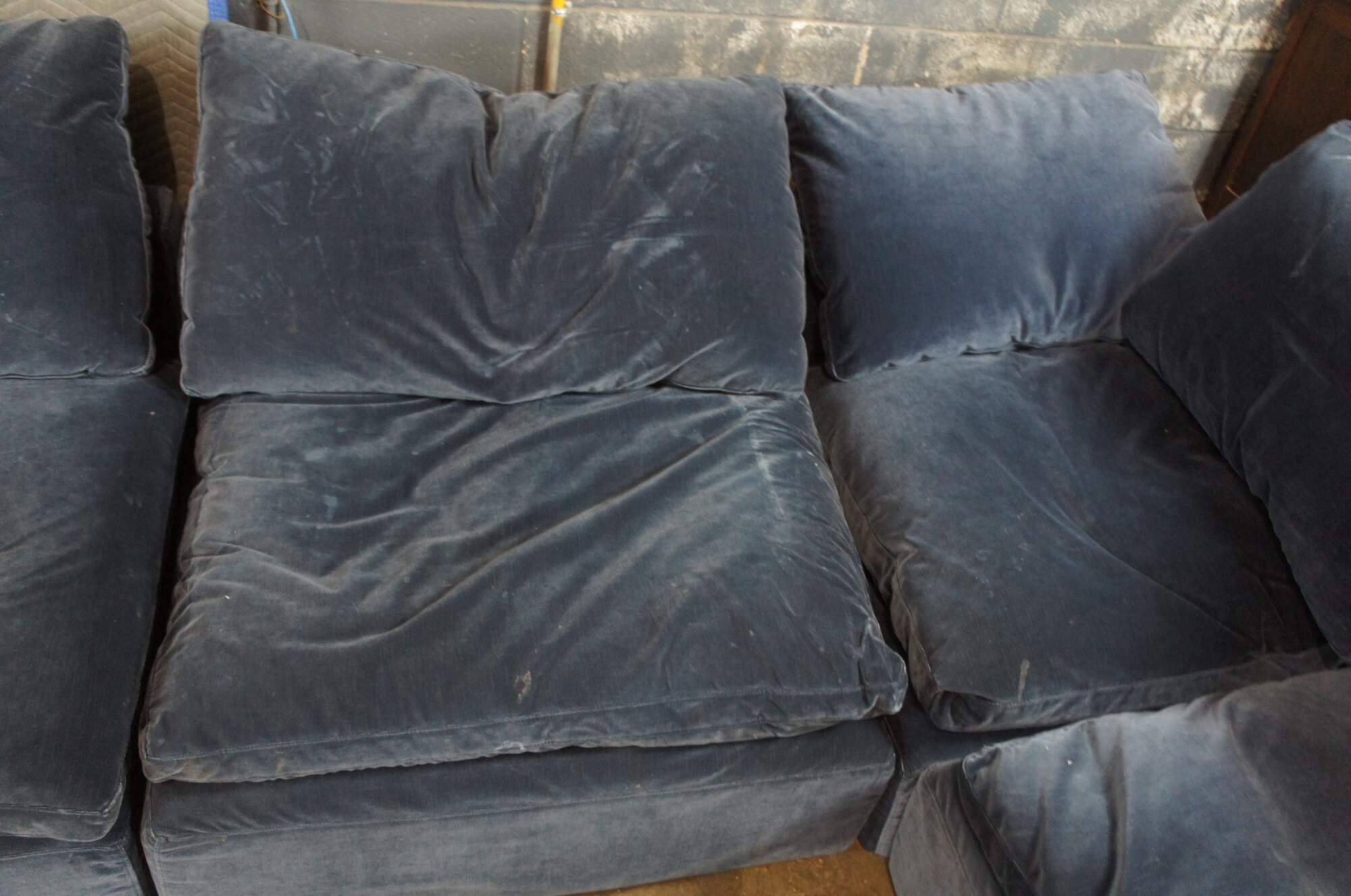 A large and impressive 8 piece Restoration Hardware Cloud Modern Blue Felt Modular Sofa Set / Sectional. Perfect for any large space. Includes two corners, four sides and two ottomans. Circa 2018