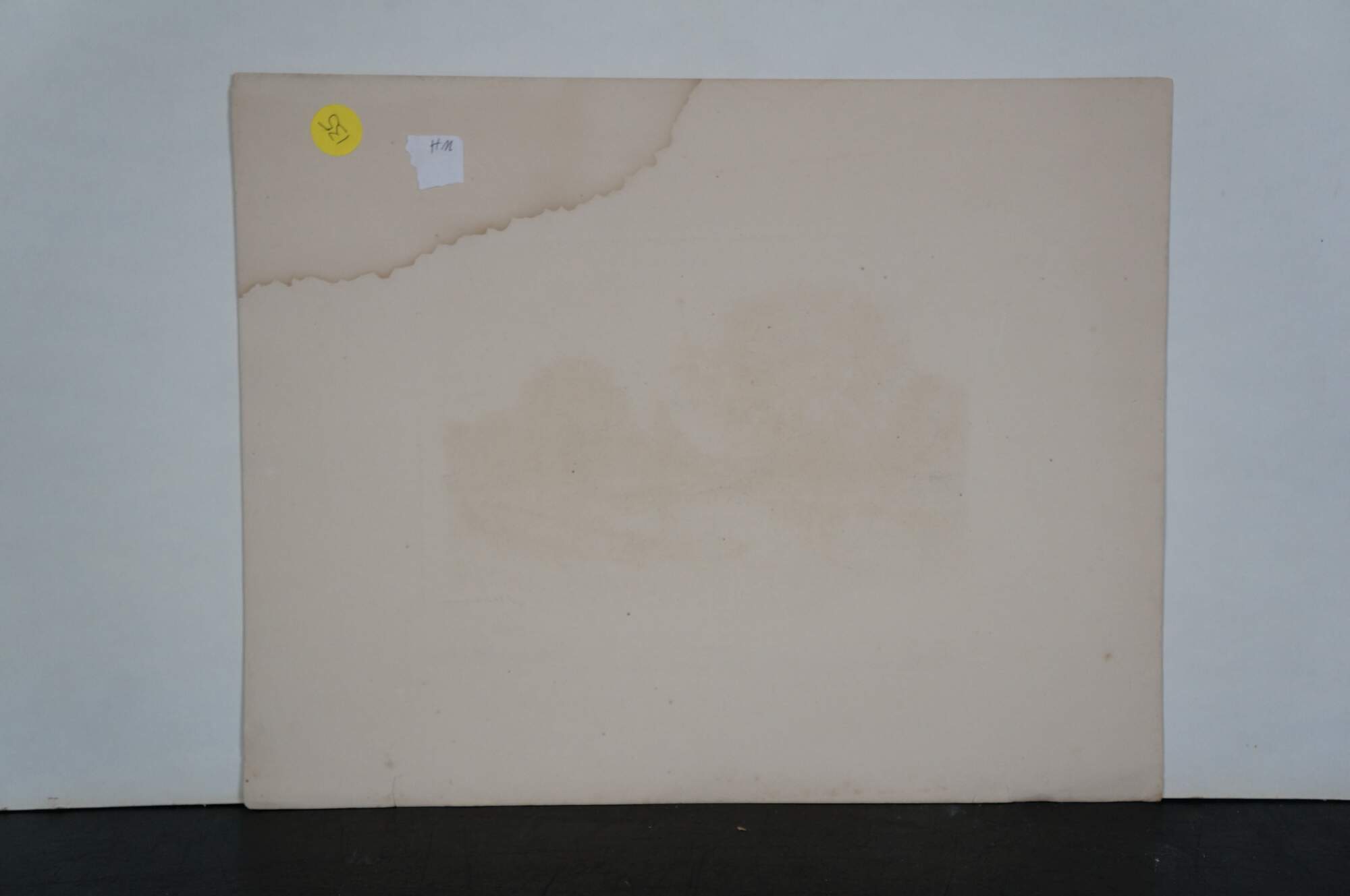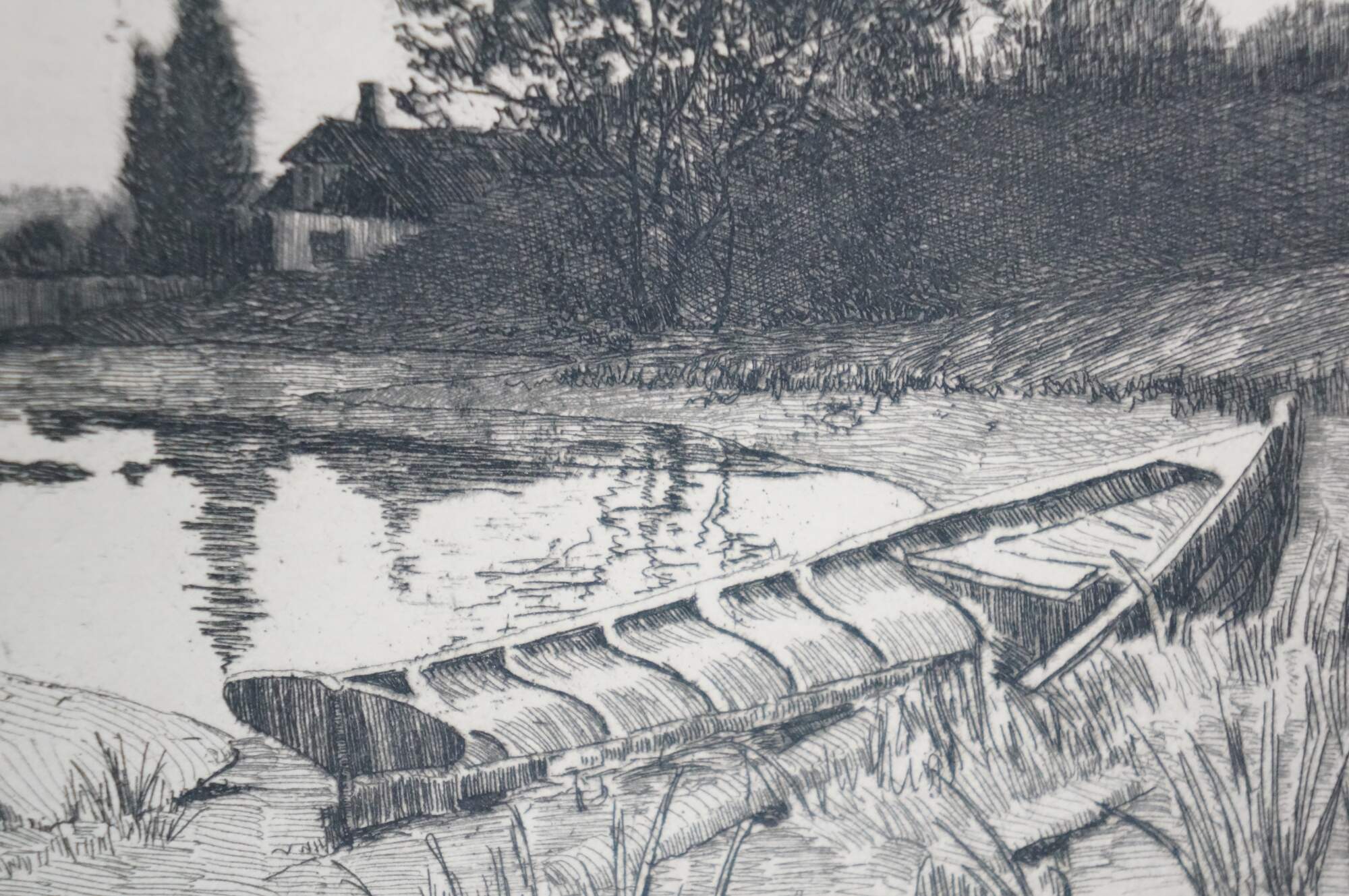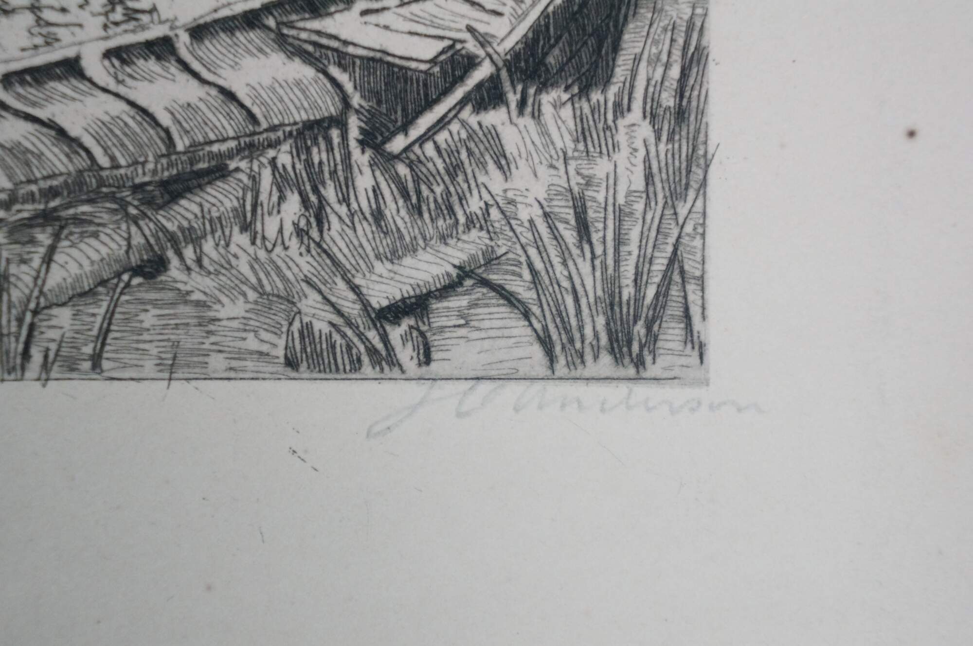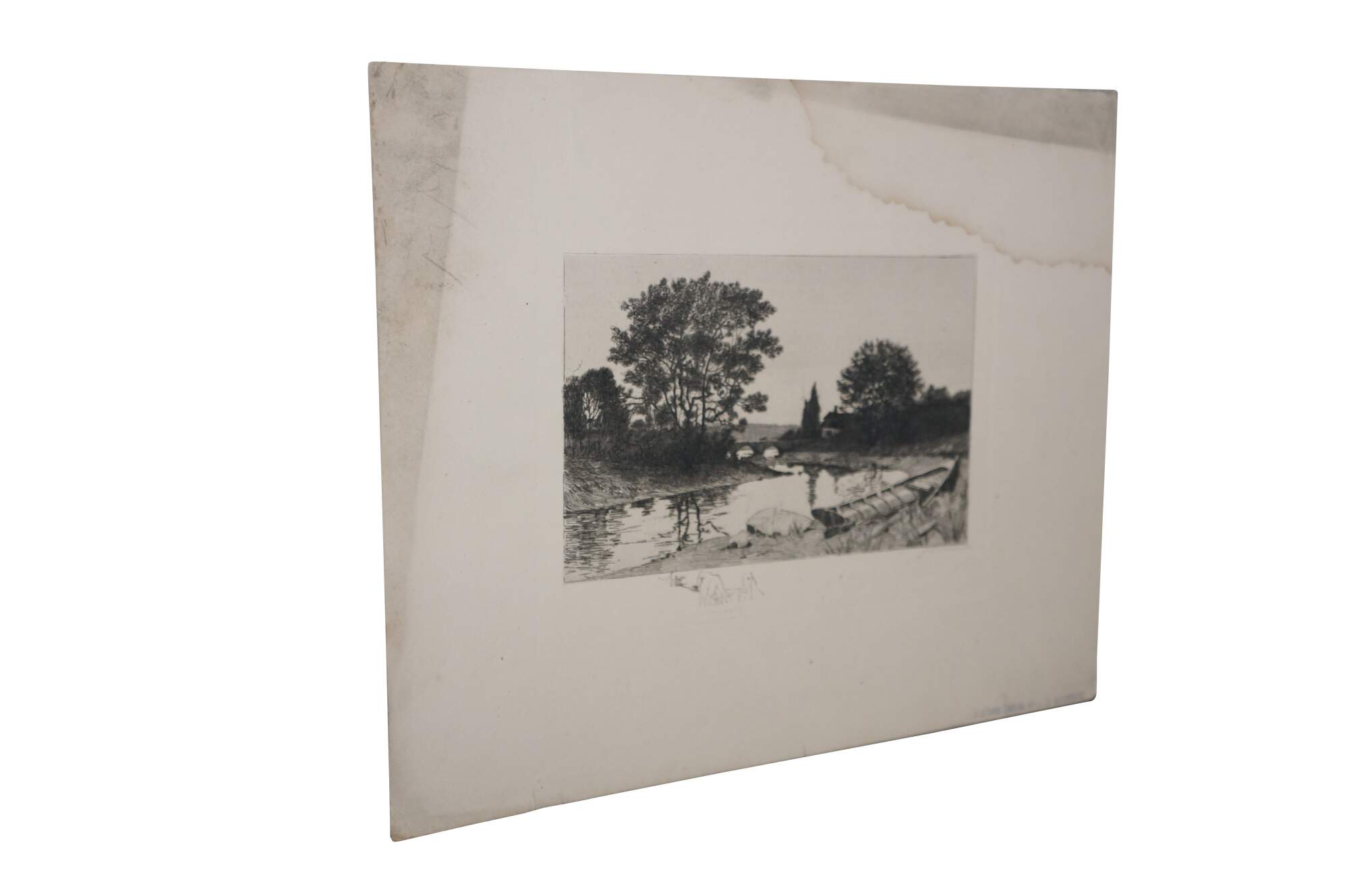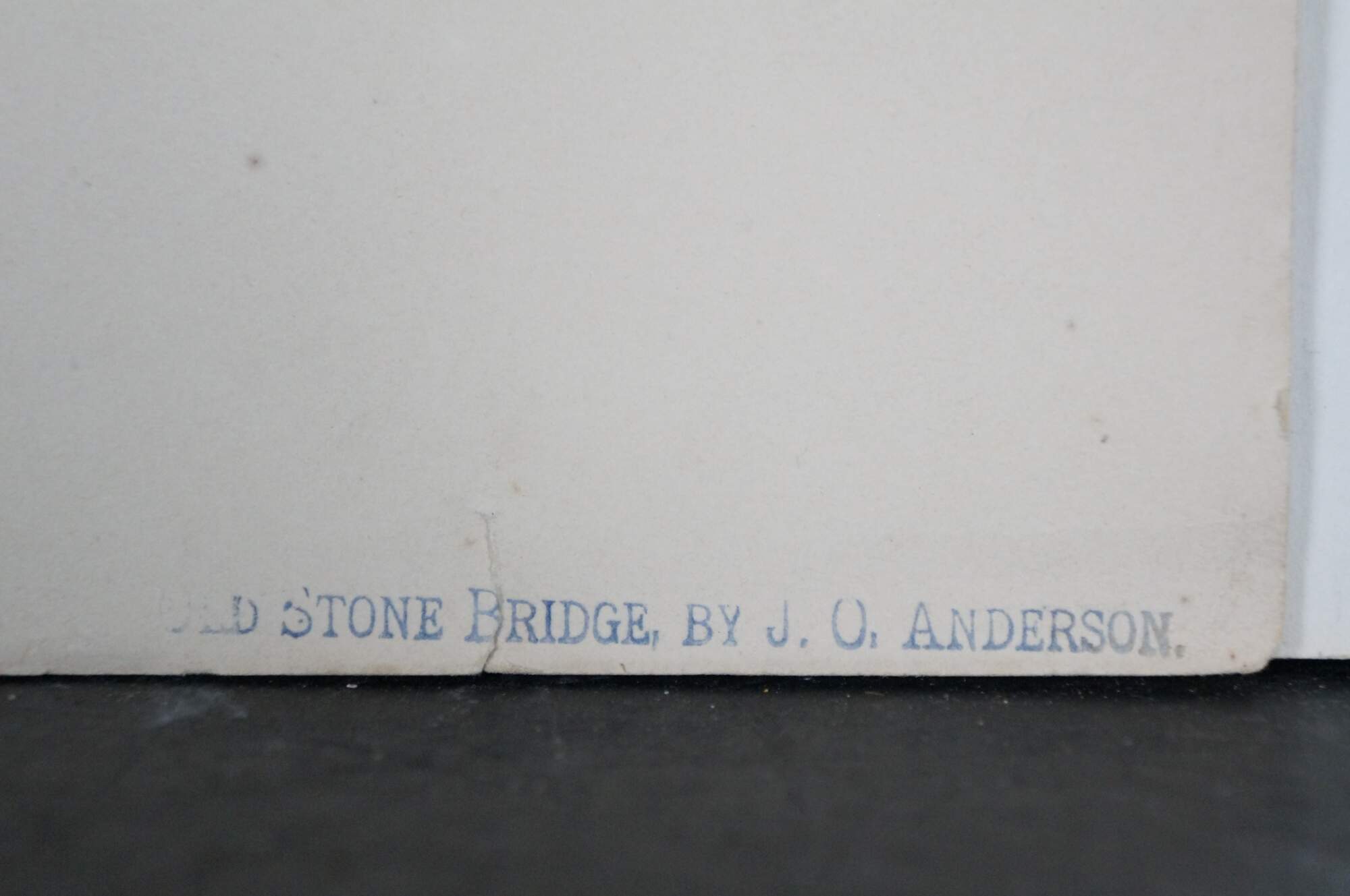 Late 19th century black and white etching titled "Old Stone Bridge" by John Octavius Anderson. Riverscape/landscape with a beached boat in the foreground and a stone bridge in the distance. Remarke of a cow and water pump, lower edge. Pencil signed, lower right. Paper, unframed.