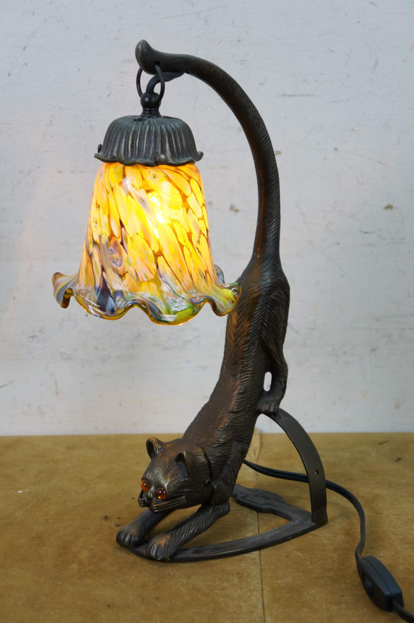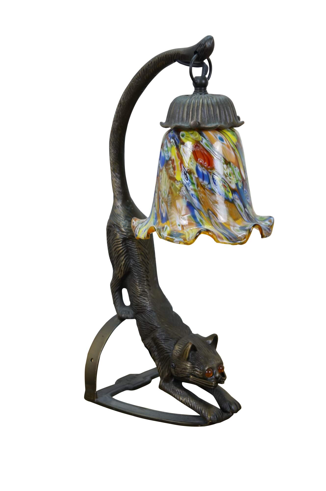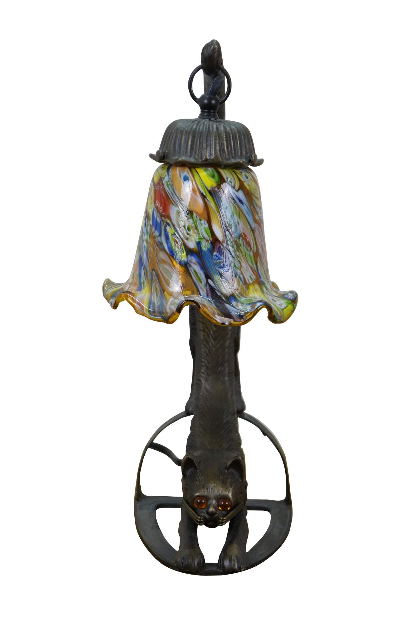 Late 20th to early 21st century Art Deco style bronzed metal table lamp in the shape of a stretching cat with amber eyes, with a millefiored Murano glass style flower shade suspended from its tail. Original design by Charles Pallet.