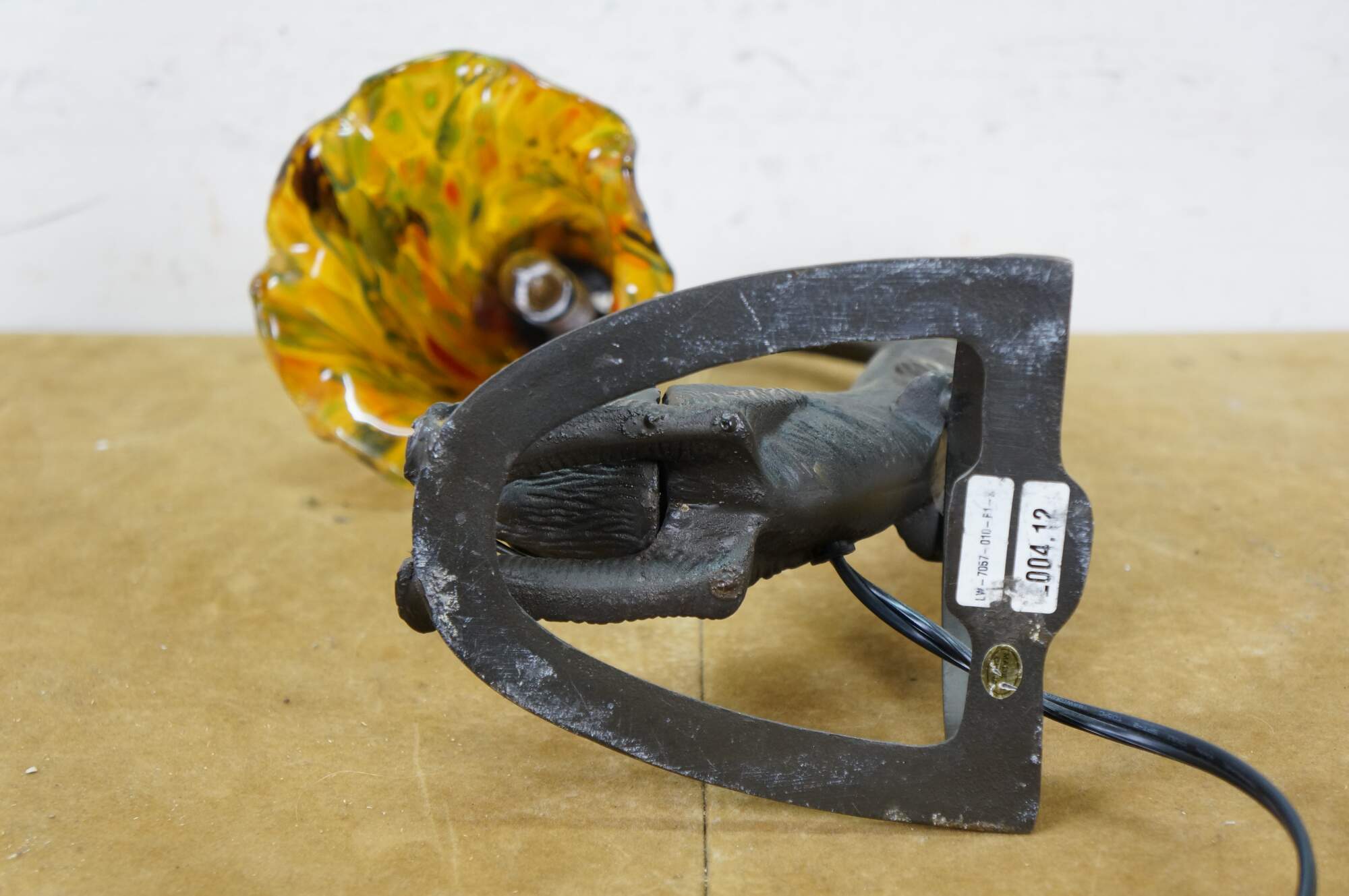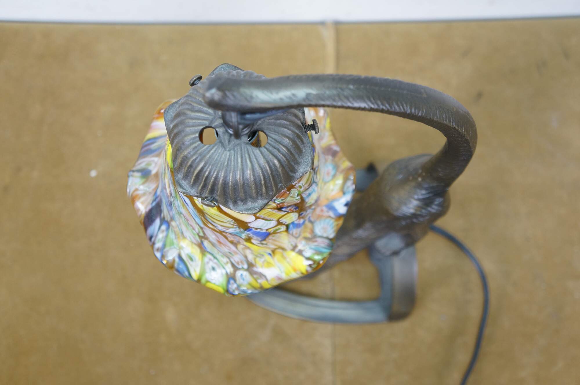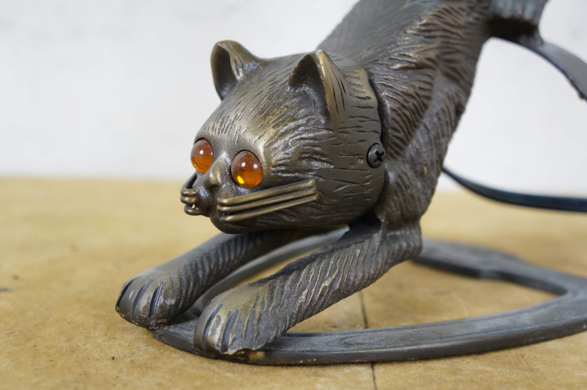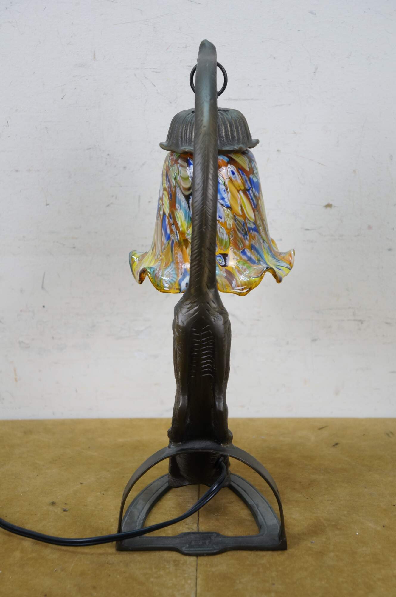 Late 20th to early 21st century Art Deco style bronzed metal table lamp in the shape of a stretching cat with amber eyes, with a millefiored Murano glass style flower shade suspended from its tail. Original design by Charles Pallet.