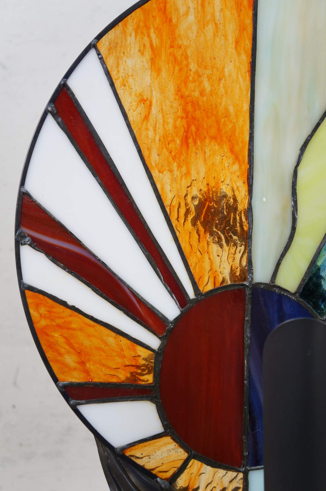 Early 21st century Tiffany / art deco / nouveau inspired stained slag glass table lamp / nightlight. Features a female figure dancing in sweeping skirts on a rectangular bronze finished resin base in front of a round backlit fan style panel of stained glass with a day/night or sunset over water motif.