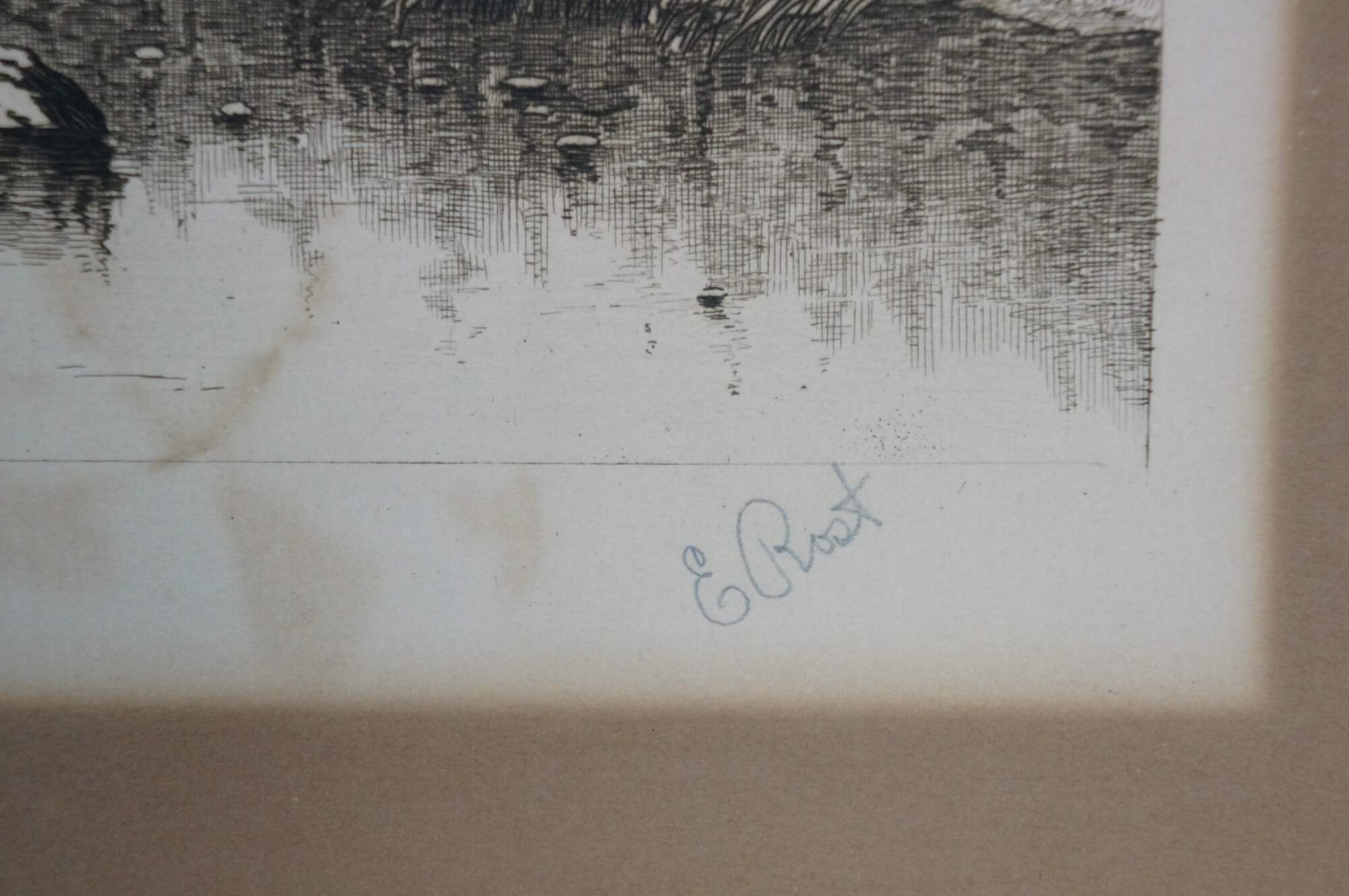 Late 19th century black and white etching by Ernest C. Rost. Landscape showing a path over a rustic wooden bridge at the edge of a forest. Remarke of a pair of leaves, lower left. Pencil signed, lower right. Copyright 1896 by E. Rost. Heavy paper/cardstock; unframed.