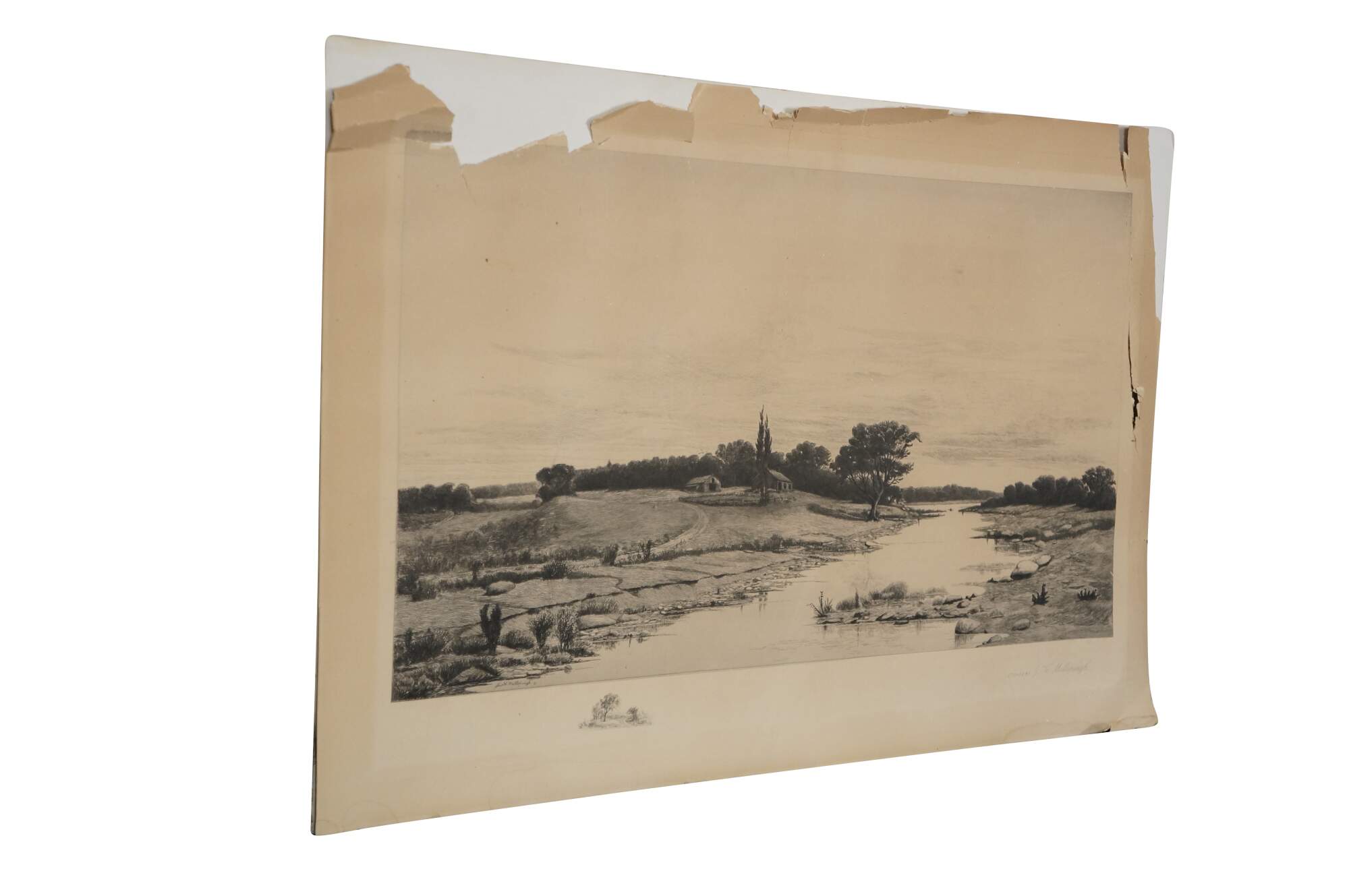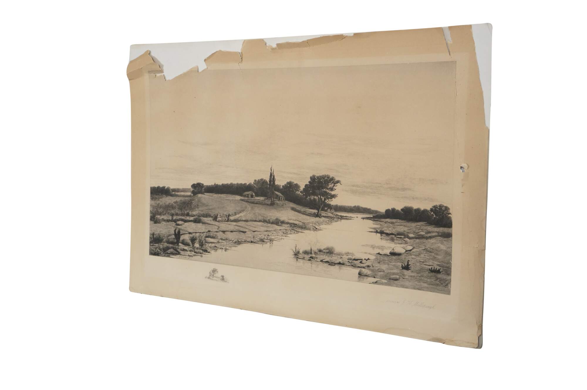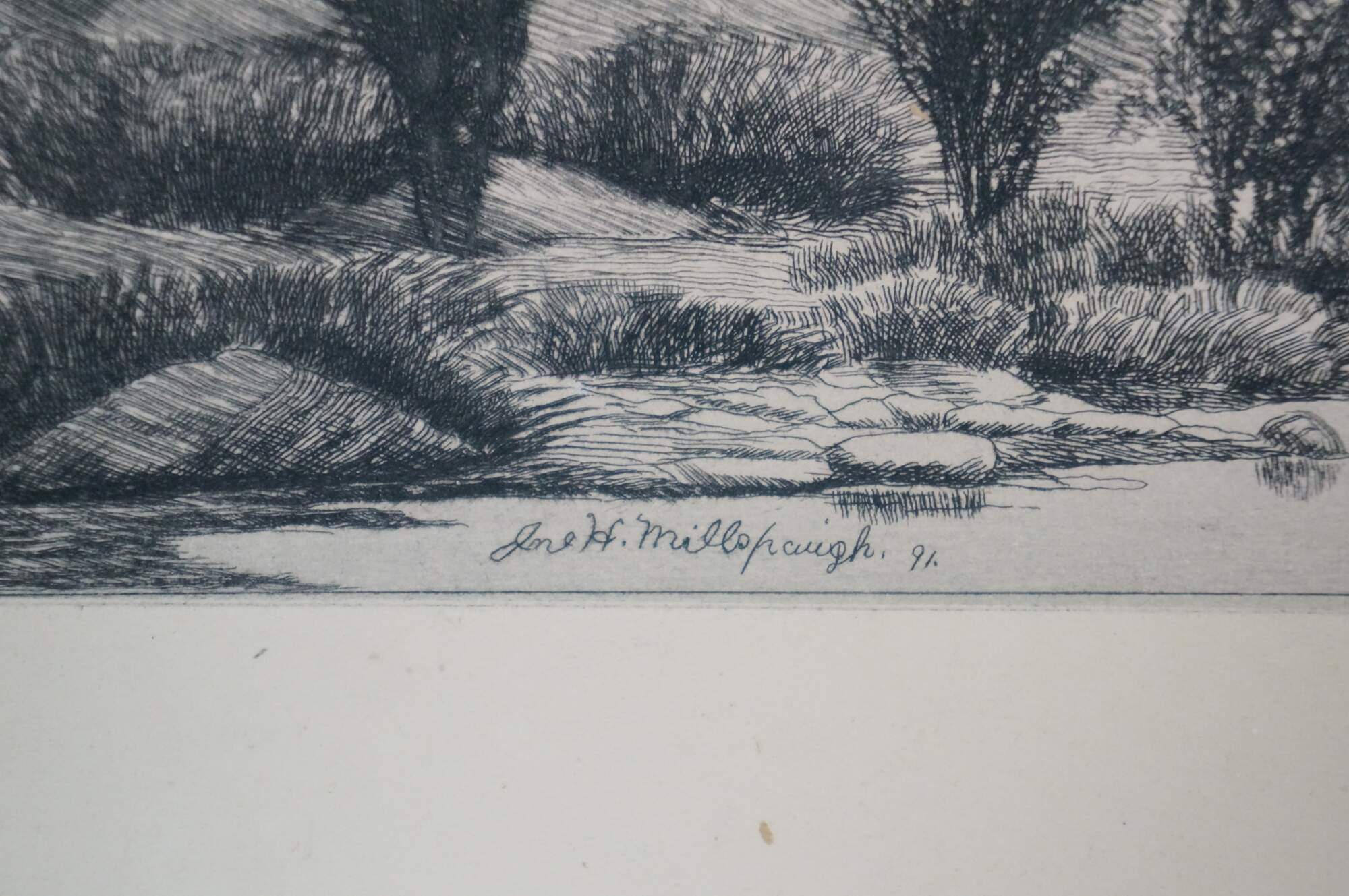 Late 19th century black and white etching by John Hill Millspaugh. Sweeping landscape of a cottage on a low hill by a river. Signed in plate Jn H Millspaugh 91, lower left and Etched by J.H. Milspaugh, lower right. Remarke of a miniature landscape, lower edge. Copyright 1891 by Radtke Lauckner & Co, N.Y. Heavy paper/cardstock; unframed.