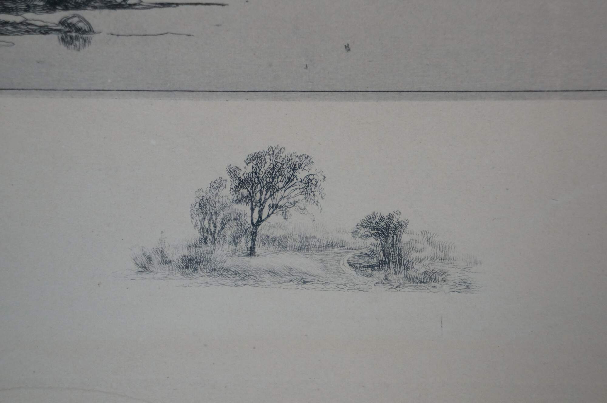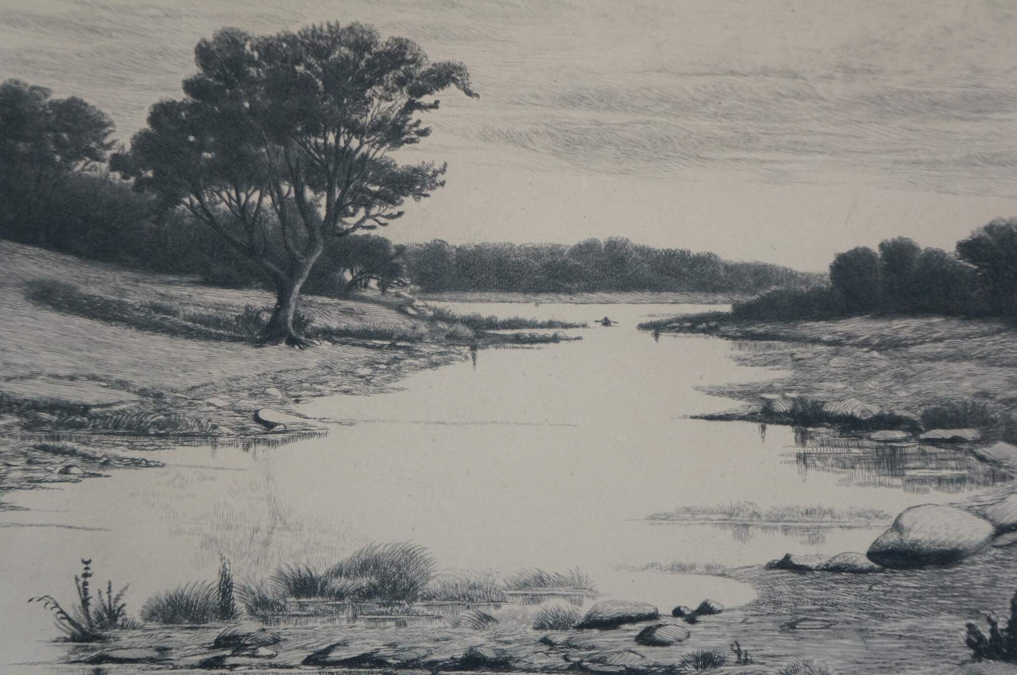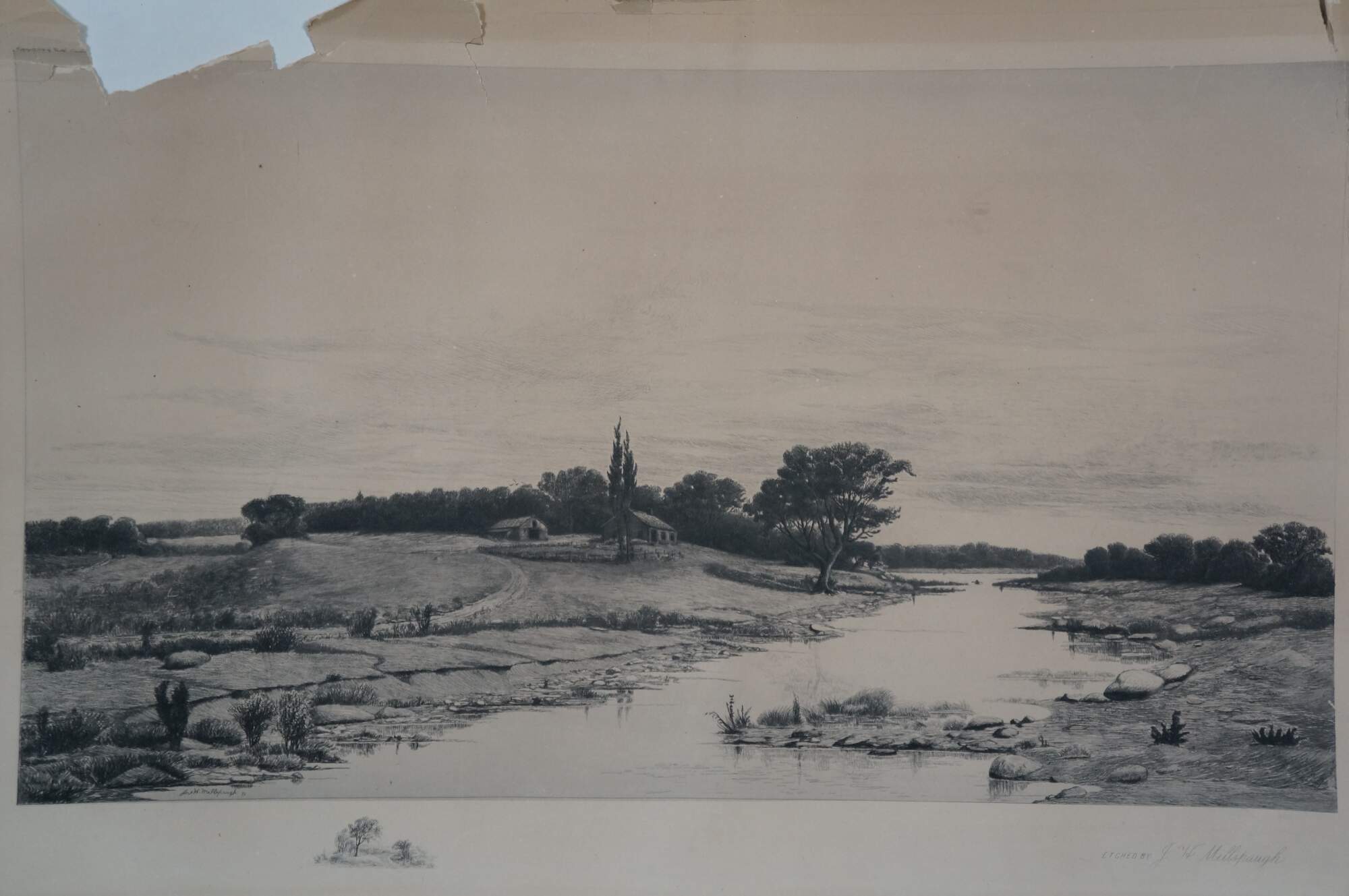 Late 19th century black and white etching by John Hill Millspaugh. Sweeping landscape of a cottage on a low hill by a river. Signed in plate Jn H Millspaugh 91, lower left and Etched by J.H. Milspaugh, lower right. Remarke of a miniature landscape, lower edge. Copyright 1891 by Radtke Lauckner & Co, N.Y. Heavy paper/cardstock; unframed.