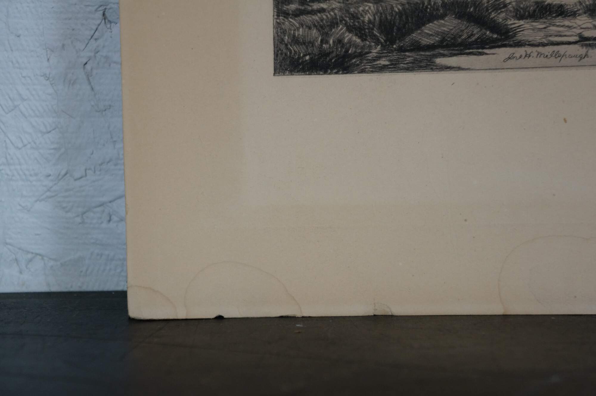 "The following information is from the research and writing of Michael McCue, art historian and curator: John Hill Millspaugh (1822 - 1894), born at Crawford in New York State, became a painter and etcher in the late 19th century and earned much respect for the quality of his work. However, he is little known today. He was raised at Crawford on the Hudson River. At age 16, he went to New York City to apprentice as a stereotyper, which was highly detailed work creating relief plates of metal from original woodcuts. By the mid 1840s, he was working in Waverly as a stereotyper, and then moved to Ithaca where he met his wife, Marion Elizabeth Cornell. Her uncle, Ezra Cornell became exceedingly wealthy from the telegraph business and founded Cornell University. John had a brother, Edward, who showed early talent as an artist and studied with Henry Inman, a leading Hudson River School painter. He died at age 31 from smallpox. Hoping to carry on his brother's work, John began studying art, and his most influential teacher was George Lafayette Clough (1824-1901), also a Hudson River School painter. John Millspaugh's career between 1851 and 1871 remains undocumented, but according to his obituary, he considered himself an amateur artist. It is thought he made his living during this period as a stereotyper. A description of one of his oil paintings shows a family picnic, and one person reported seeing an etching of Cornell University. The only known painting in a public collection is dated 1872 and is titled "Autumn in the Susquehannock." It is a pastoral landscape in the Hudson River School style and is in the Palmer Art Museum at Pennsylvania State University. In 1872, Millspaugh left Ithaca for New York City to take a job for an undetermined period of time at the Customs House. However, his family suffered when a severe depression, the Panic of 1873, hit a year later, and his son had to leave college. By 1882, he reportedly was getting attention in New York City for his etching, an art form that was extremely popular at that time and tried by many artists. Millspaugh was invited to join the New York Etching Club, the country's first organization specifically devoted to that medium. His etchings are highly detailed, and most of them depict quiet landscapes. The earliest one published was likely "Evening on the Delaware," by fine-art publisher Christian Klackner. One of these works is in the Parrish Art Museum at Southampton, Long Island. Millspaugh collaborated with Boston painter and etcher Louis K Harlow to publish works through Klackner. After 1889, Millspaugh did mostly self publishing. At an undetermined date, he left Manhattan and returned to Ithica to live. He and his wife spent the winter of 1893-94 in Denver, Colorado, and he died on the return trip to Ithaca." (Source: askART)