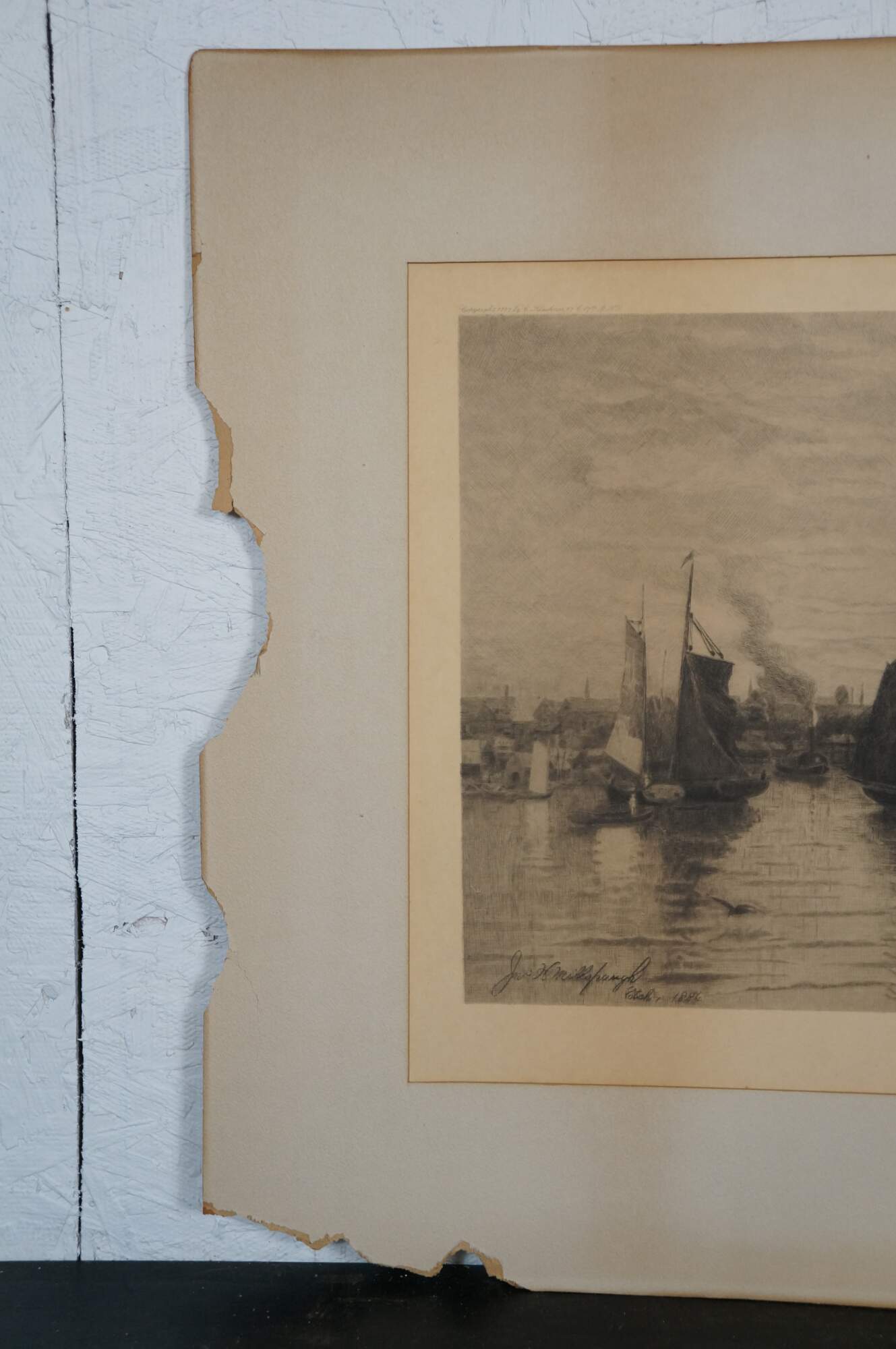 Late 19th century black and white signed etching by John Hill Millspaugh after a painting by George Herbert McCord. Nautical landscape showing sailboats near a small dock with figures and a town across the water. Signed in plate Jn H Millspaugh Etch'r 1886, lower left and G.H. McCord Pinxit, lower right. Pencil signed, lower right. Copyright 1887 by C. Klackner, 17 E 17th St, N.Y. Paper mounted on cardstock; gray mat; unframed.