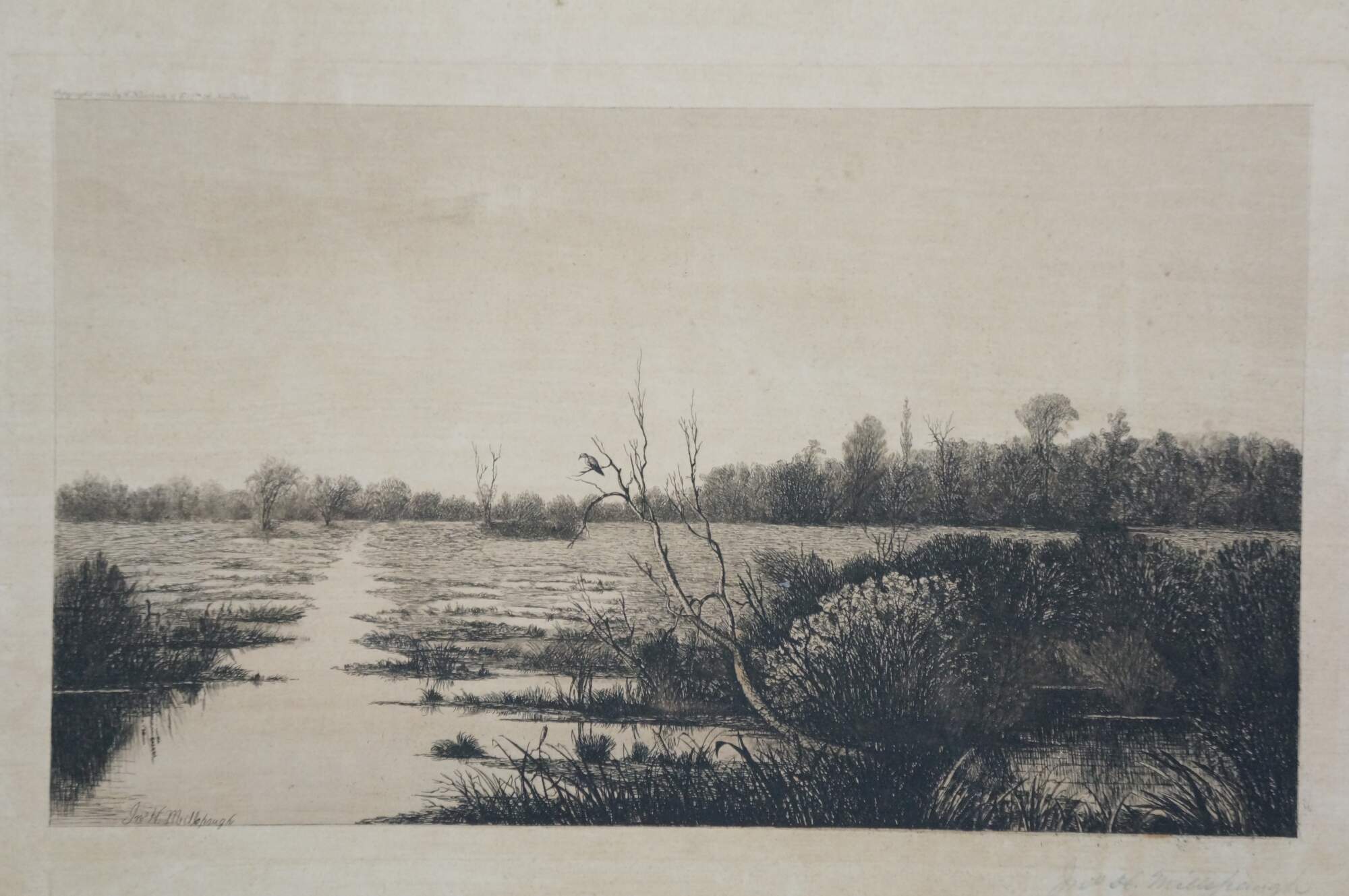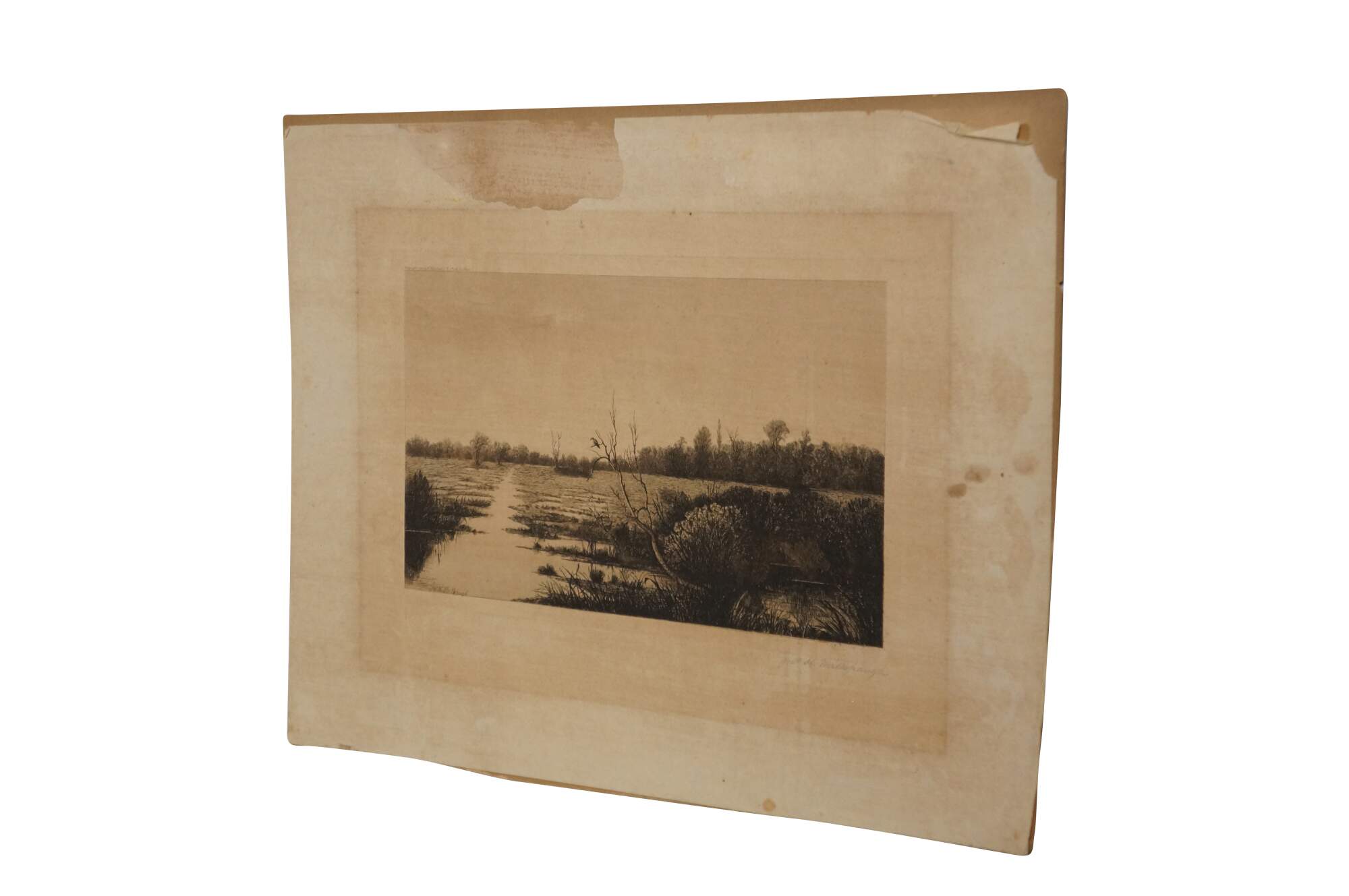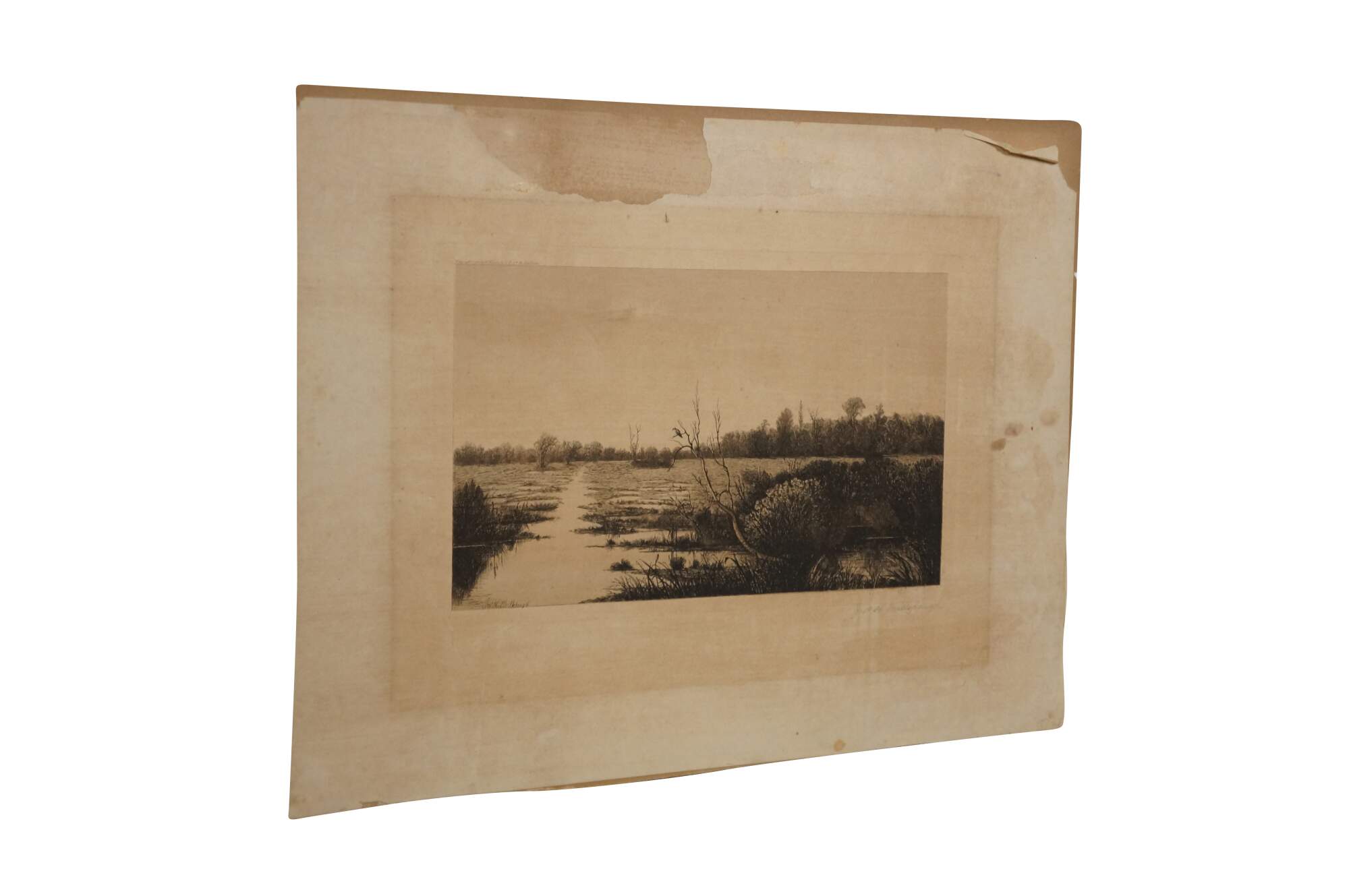 Late 19th century black and white etching by John Hill Millspaugh. Landscape featuring a single bird perched above a wetland / marsh. signed in plate, lower left. Copyright 1884 by C. Klackner, 17 E 17th St, New York. Pencil signed, lower right. Paper mounted on cardstock; unframed.