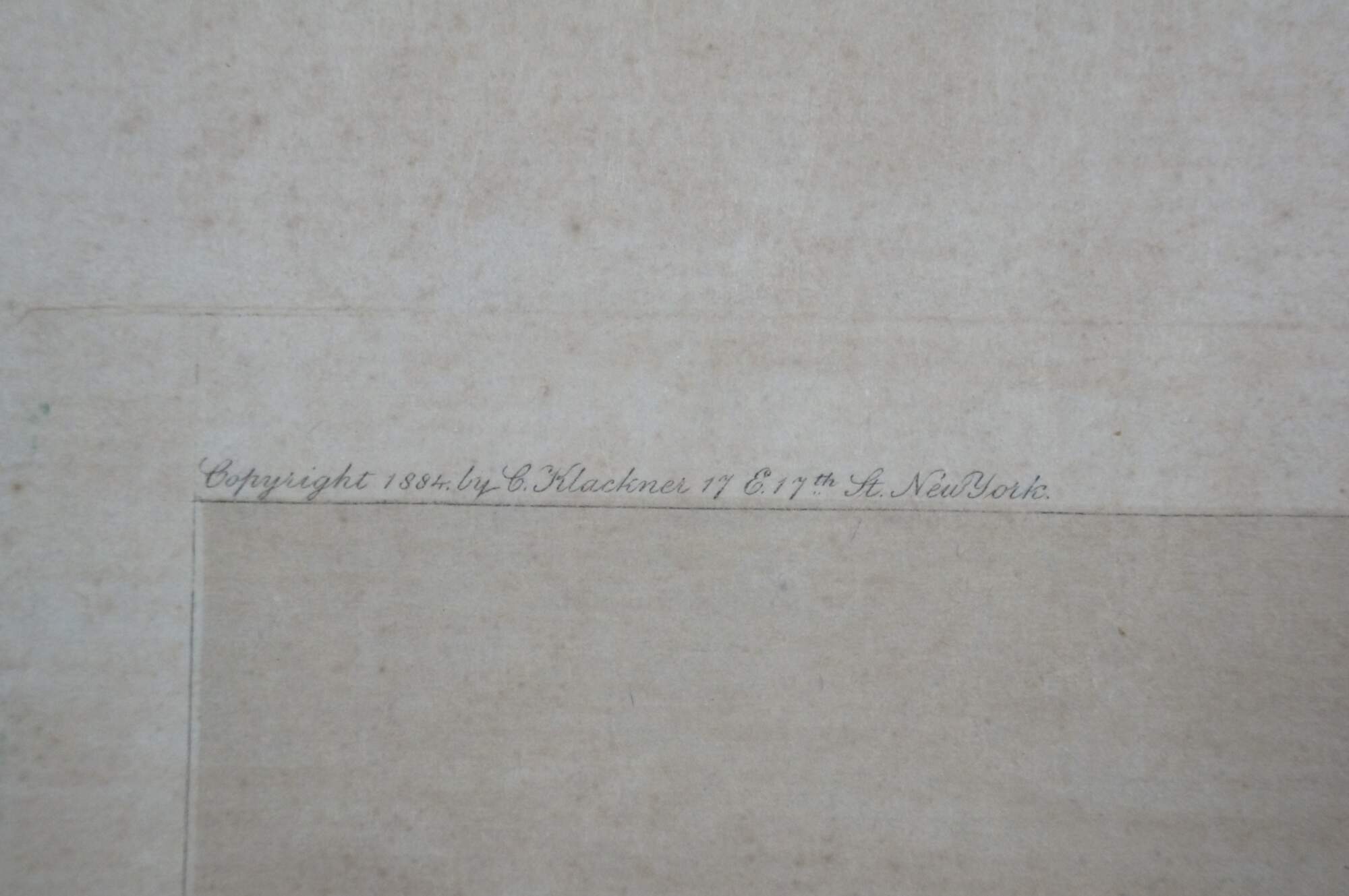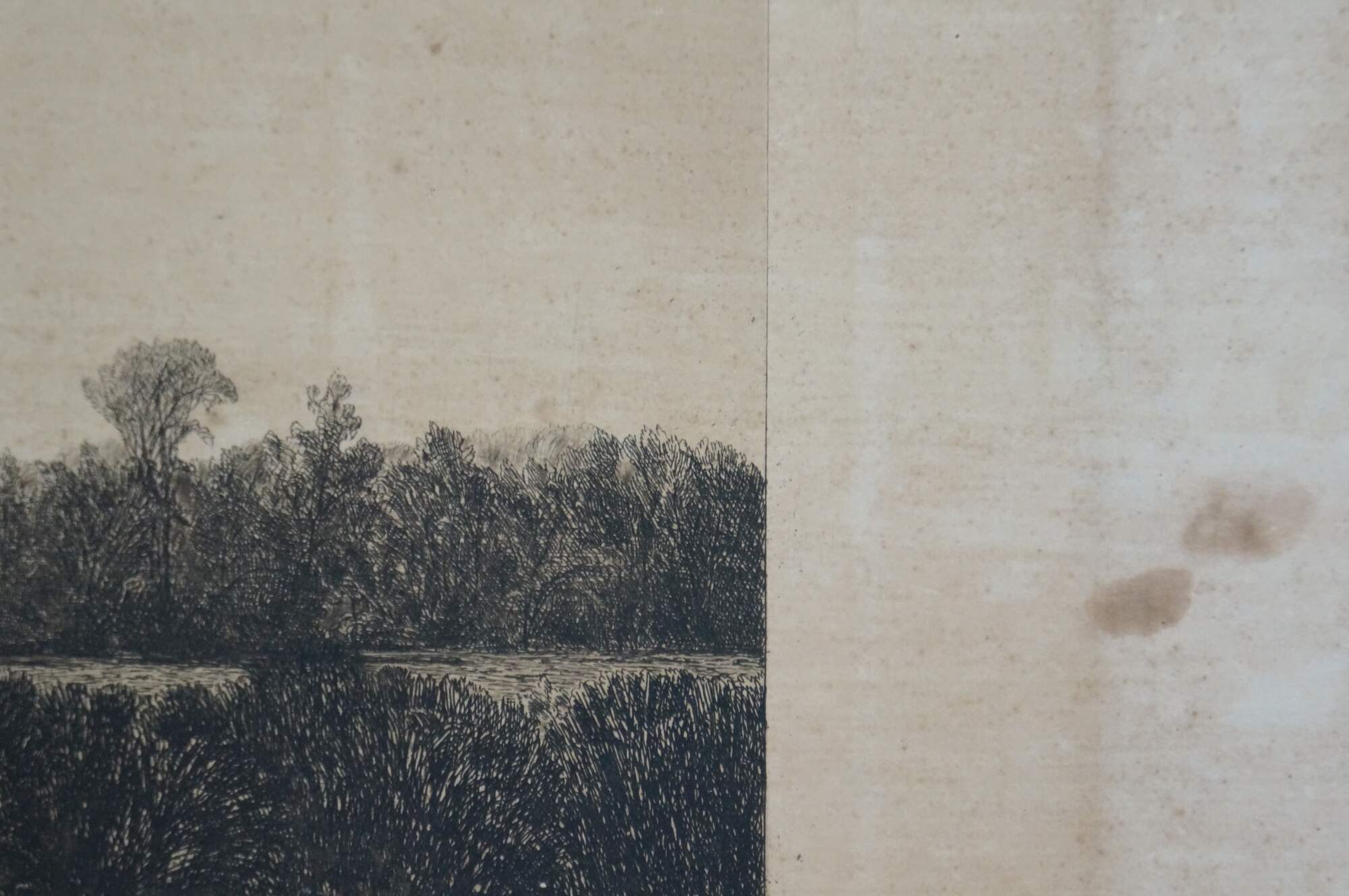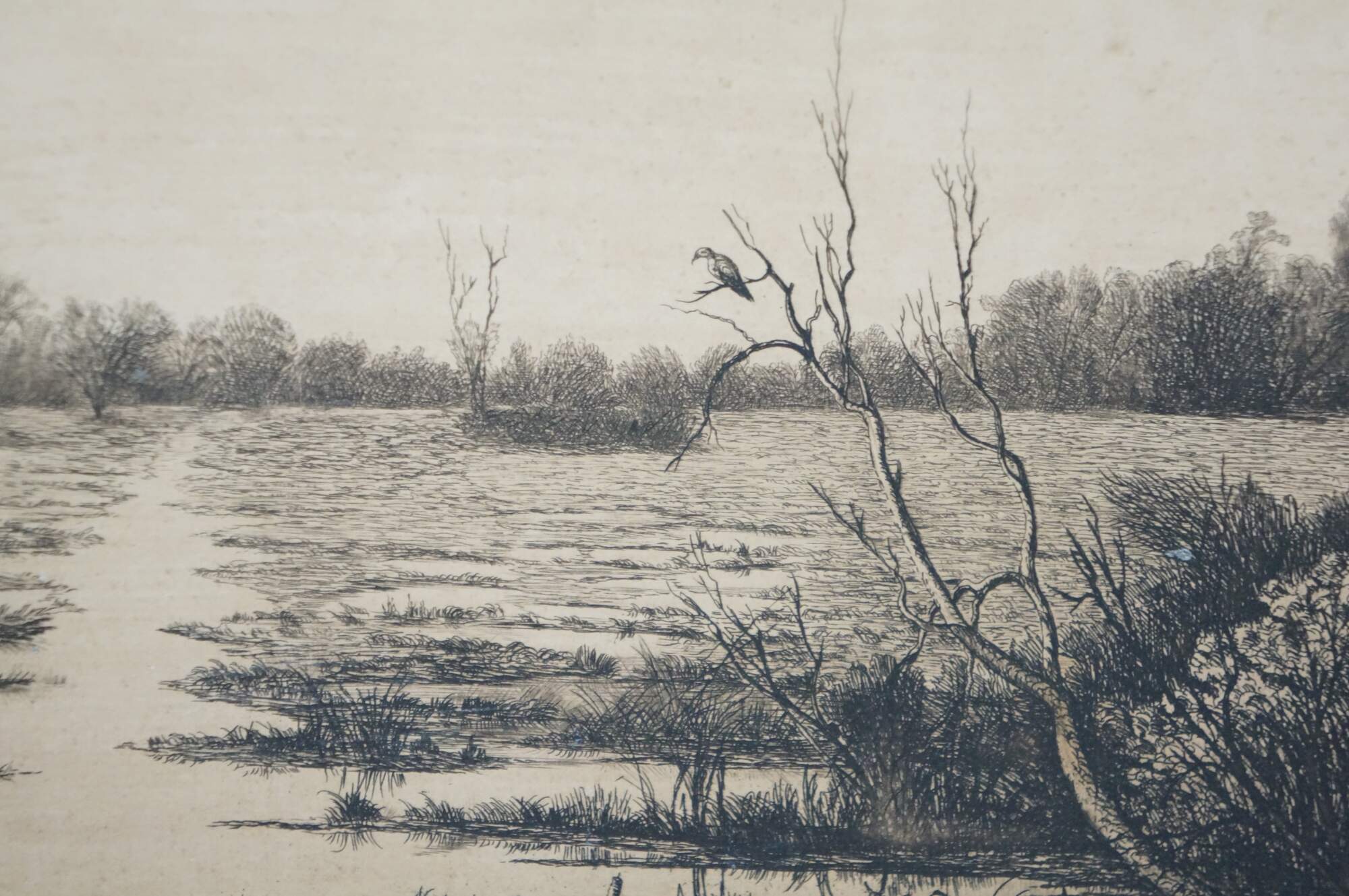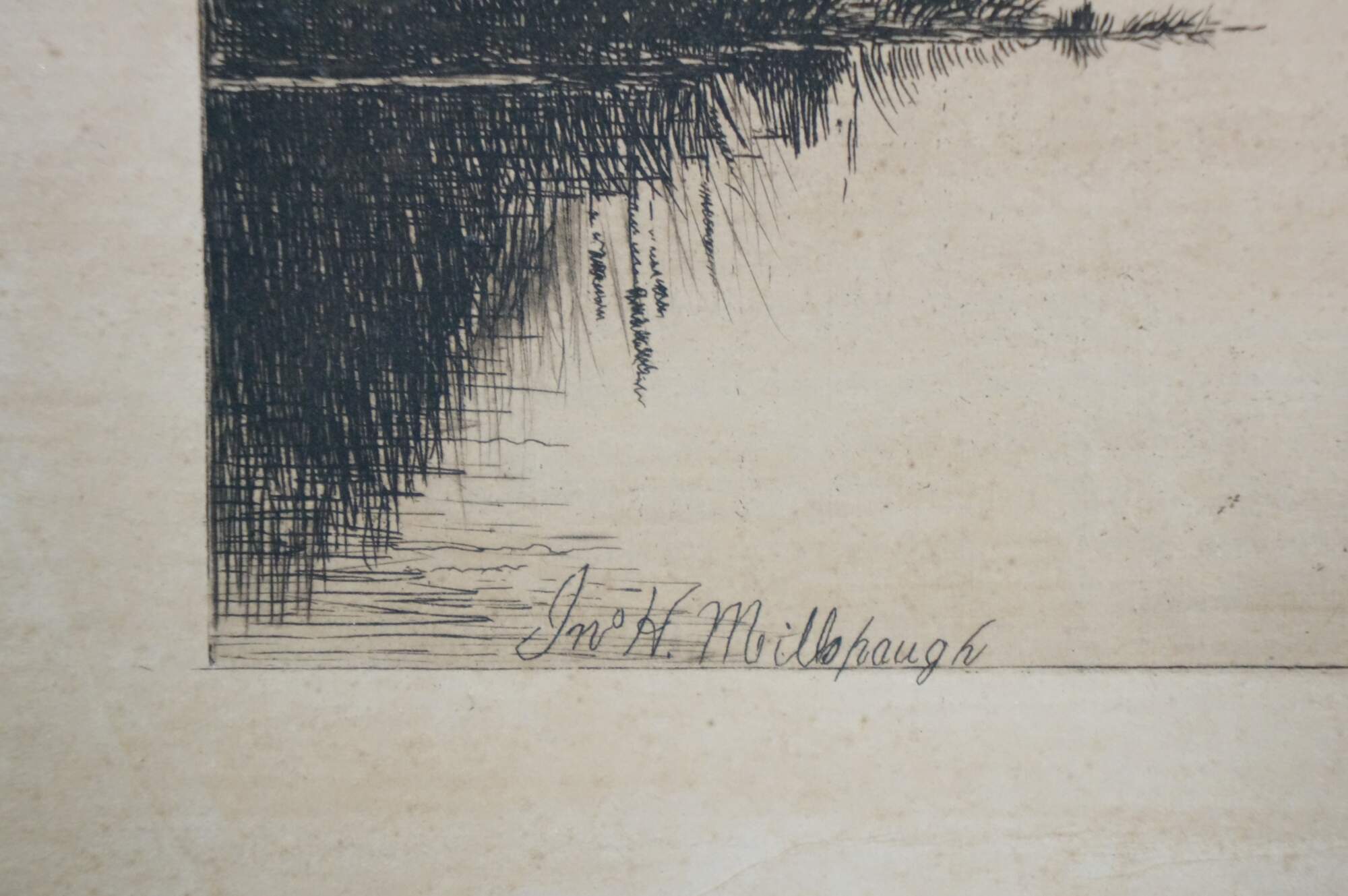 Late 19th century black and white etching by John Hill Millspaugh. Landscape featuring a single bird perched above a wetland / marsh. signed in plate, lower left. Copyright 1884 by C. Klackner, 17 E 17th St, New York. Pencil signed, lower right. Paper mounted on cardstock; unframed.