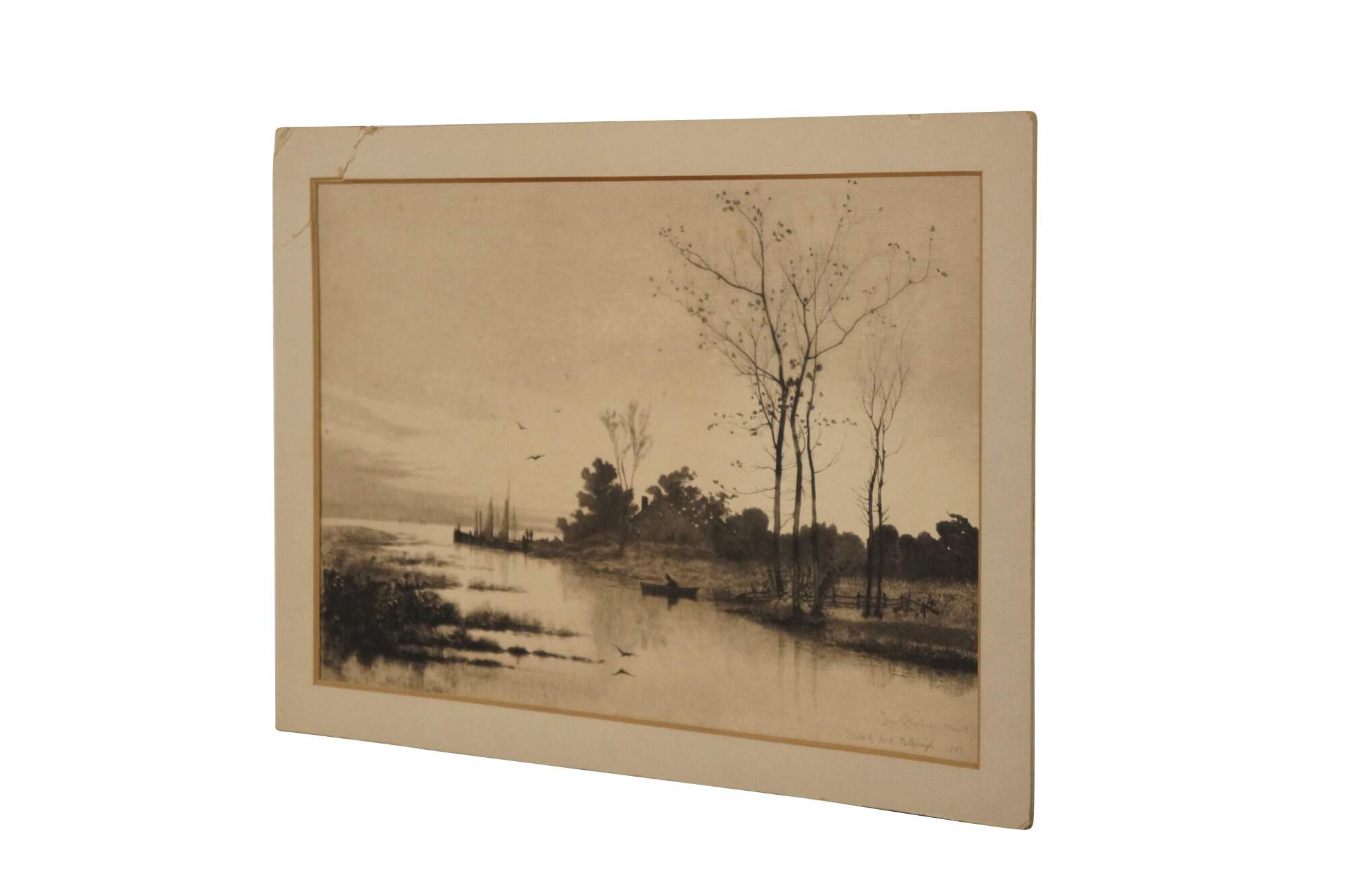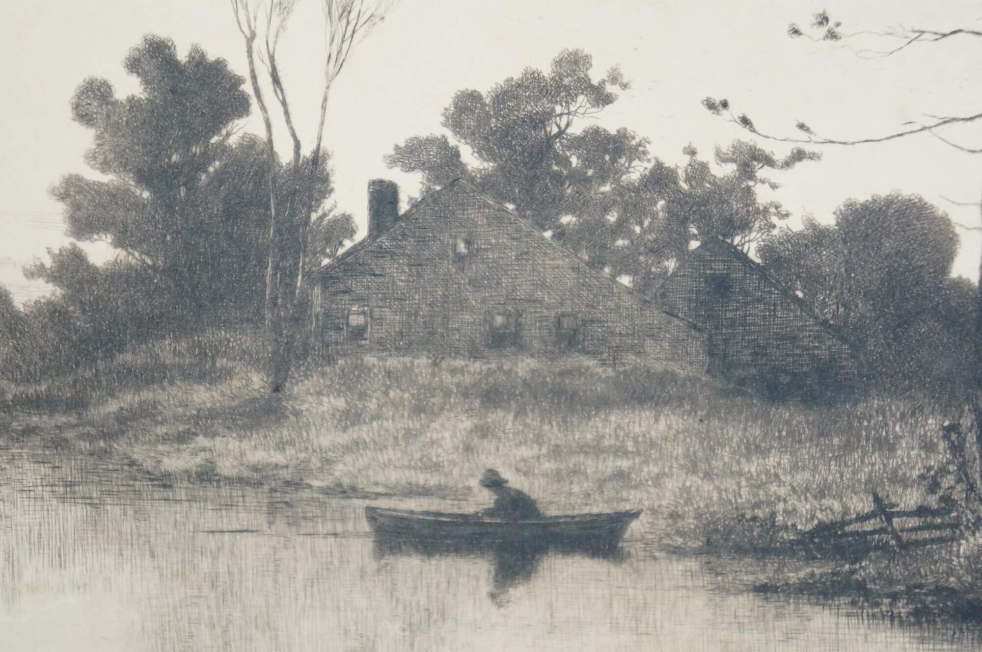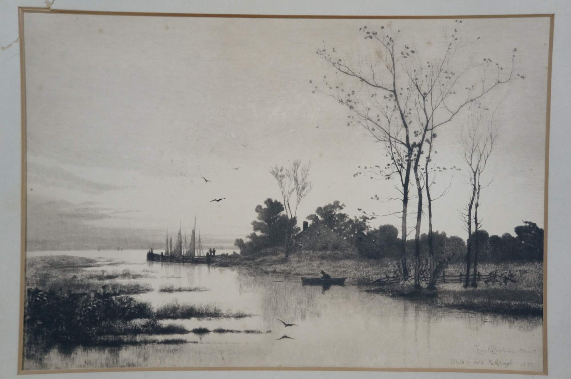 Late 19th century black and white etching by John Hill Millspaugh after a painting by Louis Kinney Harlow. River's edge landscape featuring a cottage and several boats. Signed in plate Louis K Harlow Pinxit and Etch'd by Jn H Millspaugh 1887, lower right. Heavy paper/cardstock; white mat; unframed.