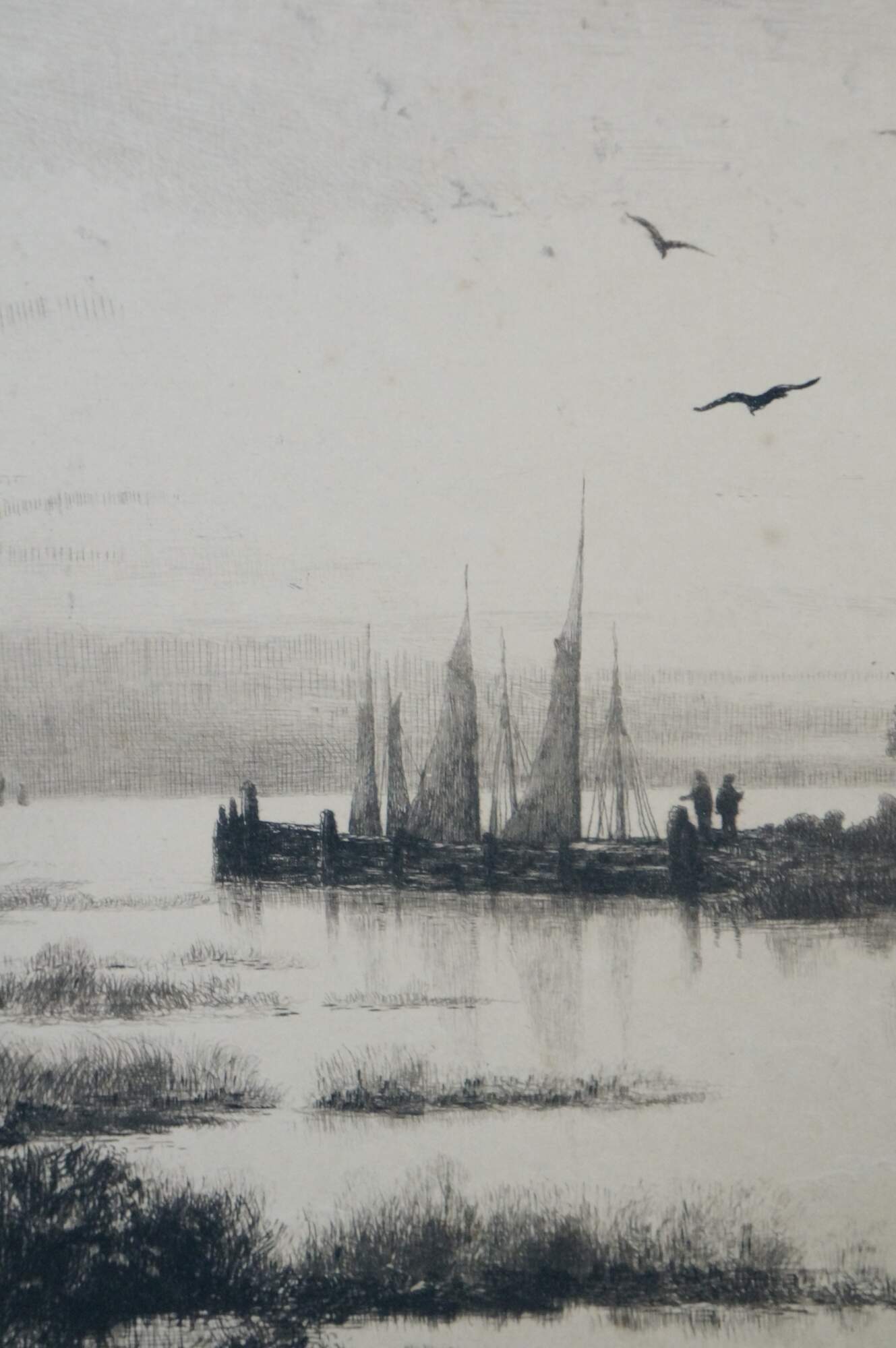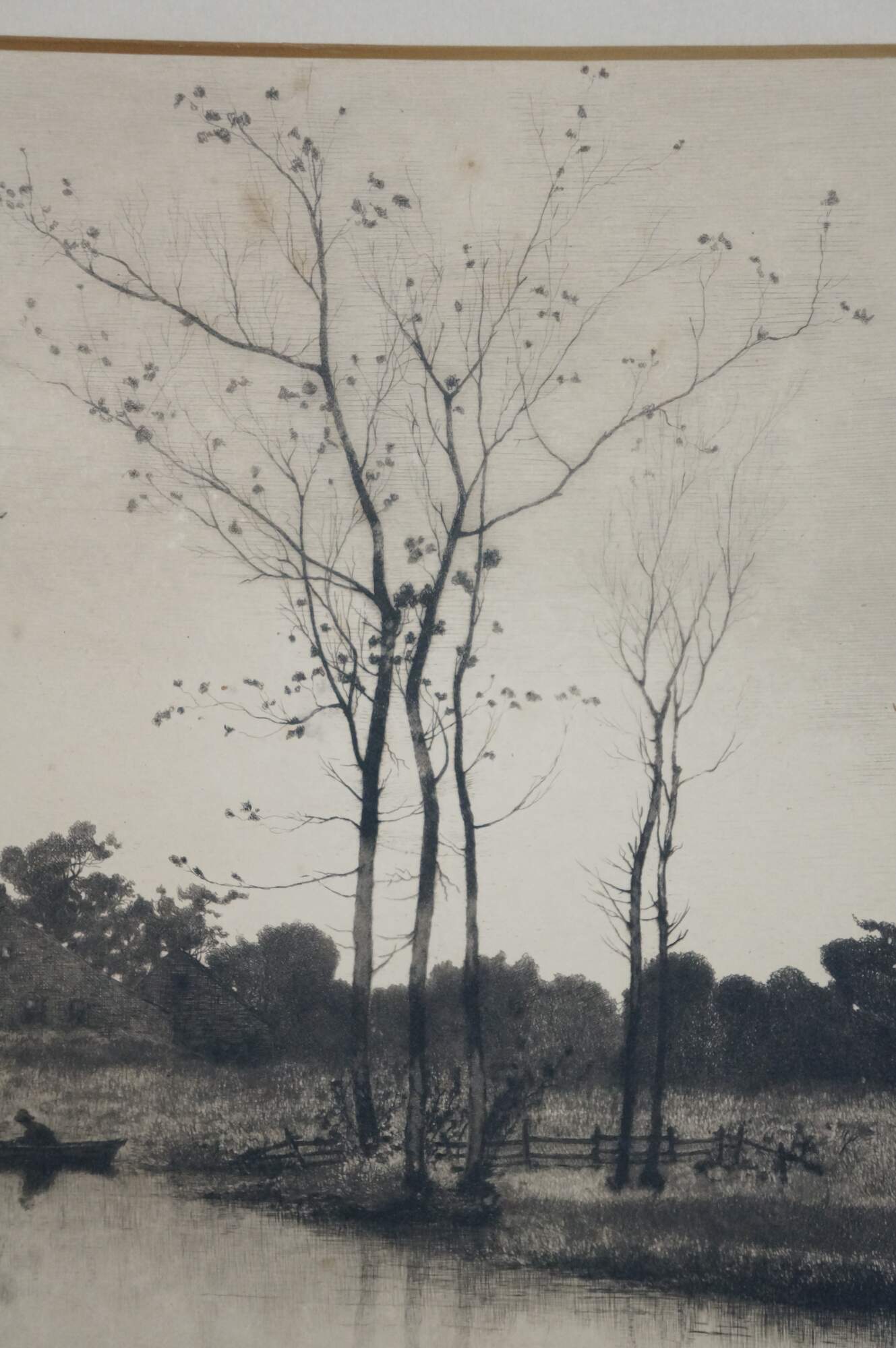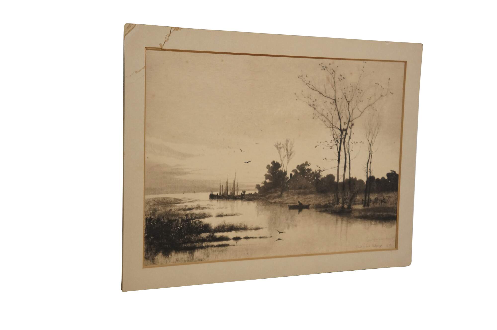 Late 19th century black and white etching by John Hill Millspaugh after a painting by Louis Kinney Harlow. River's edge landscape featuring a cottage and several boats. Signed in plate Louis K Harlow Pinxit and Etch'd by Jn H Millspaugh 1887, lower right. Heavy paper/cardstock; white mat; unframed.