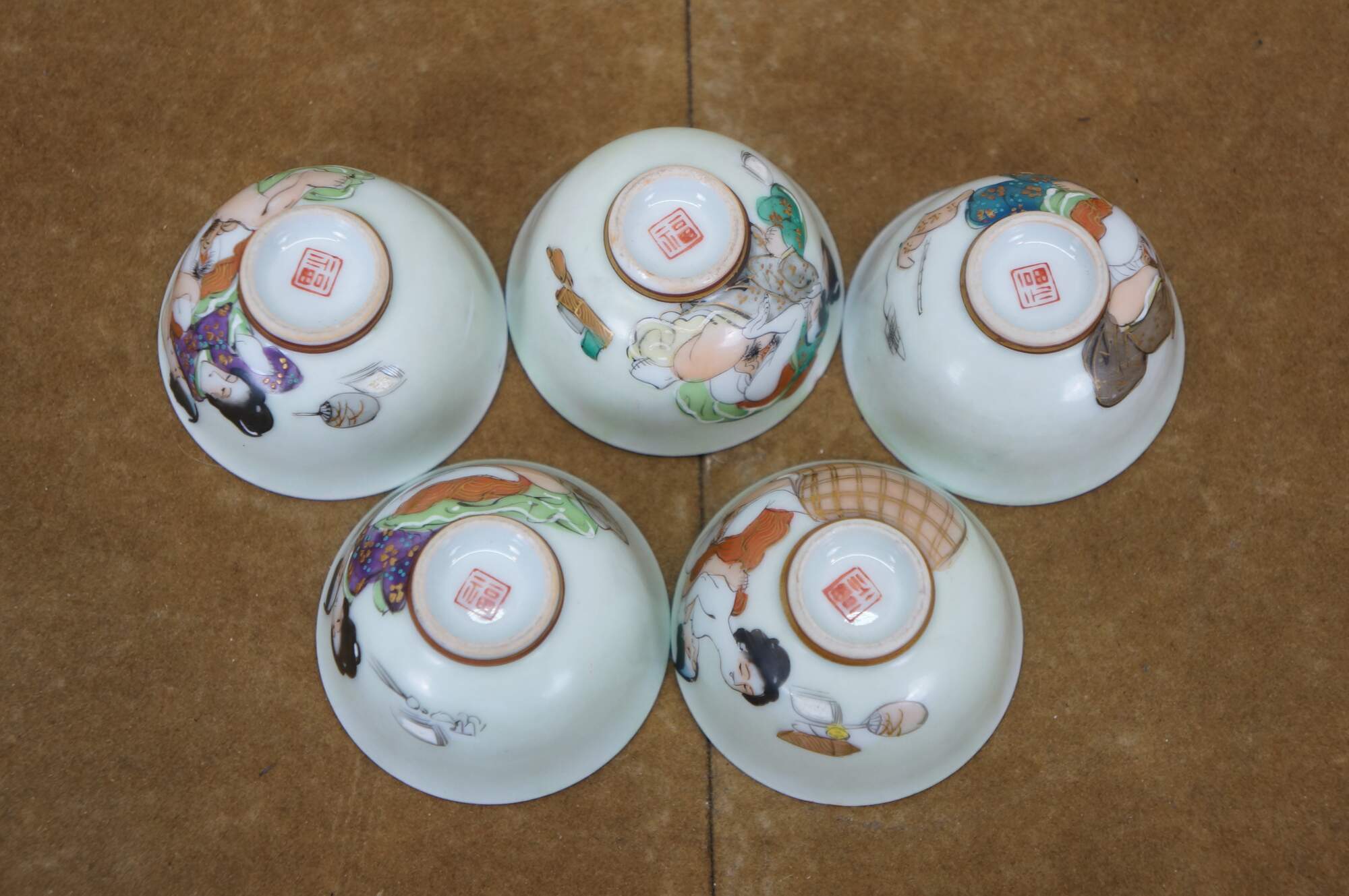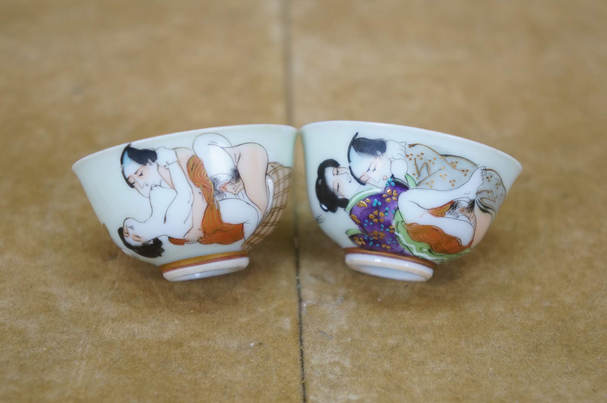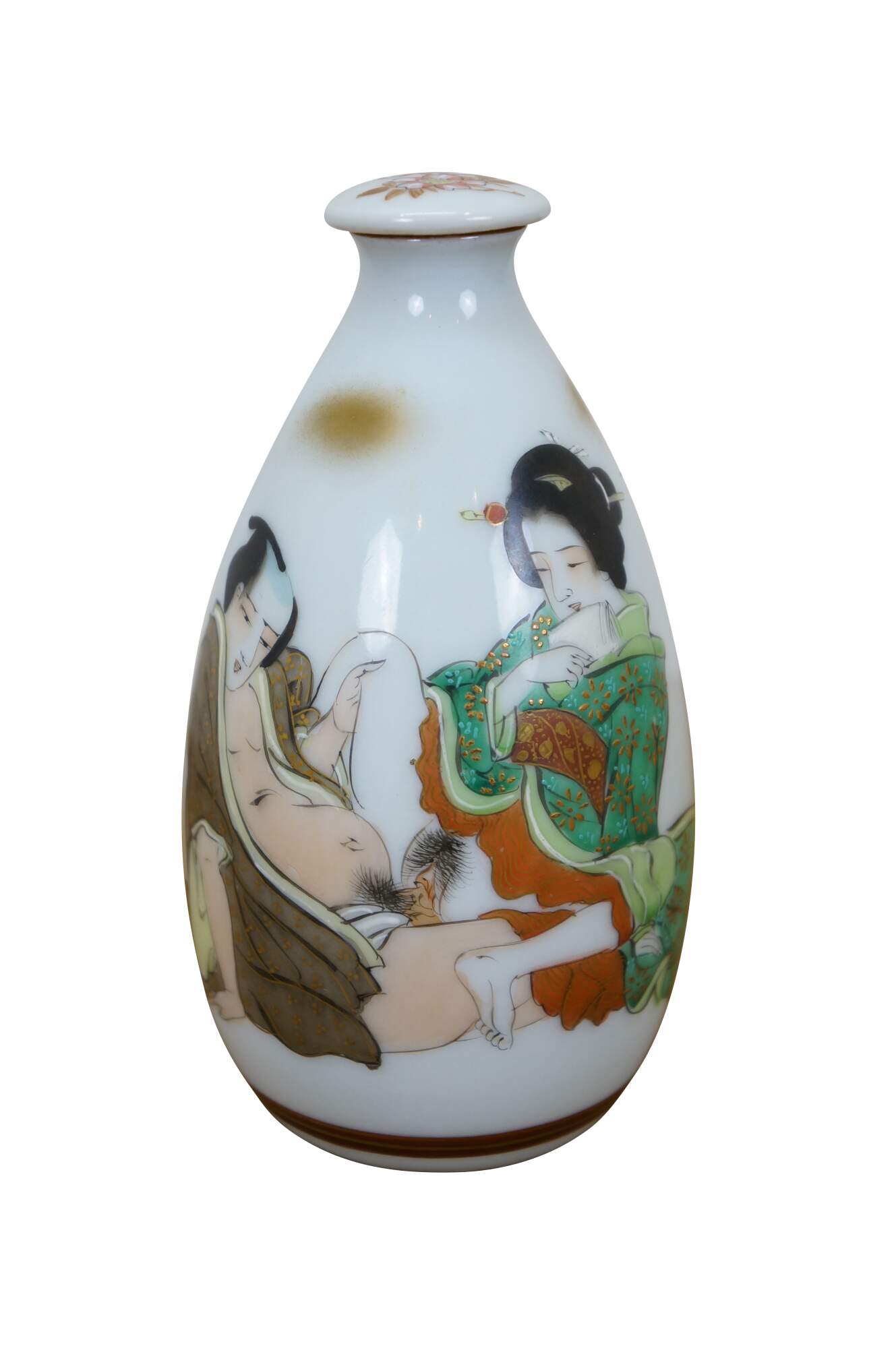 Vintage seven piece Japanese porcelain sake set including two lidded flasks / bottles and five delicate cups, hand painted with figures in a variety of amorous poses.