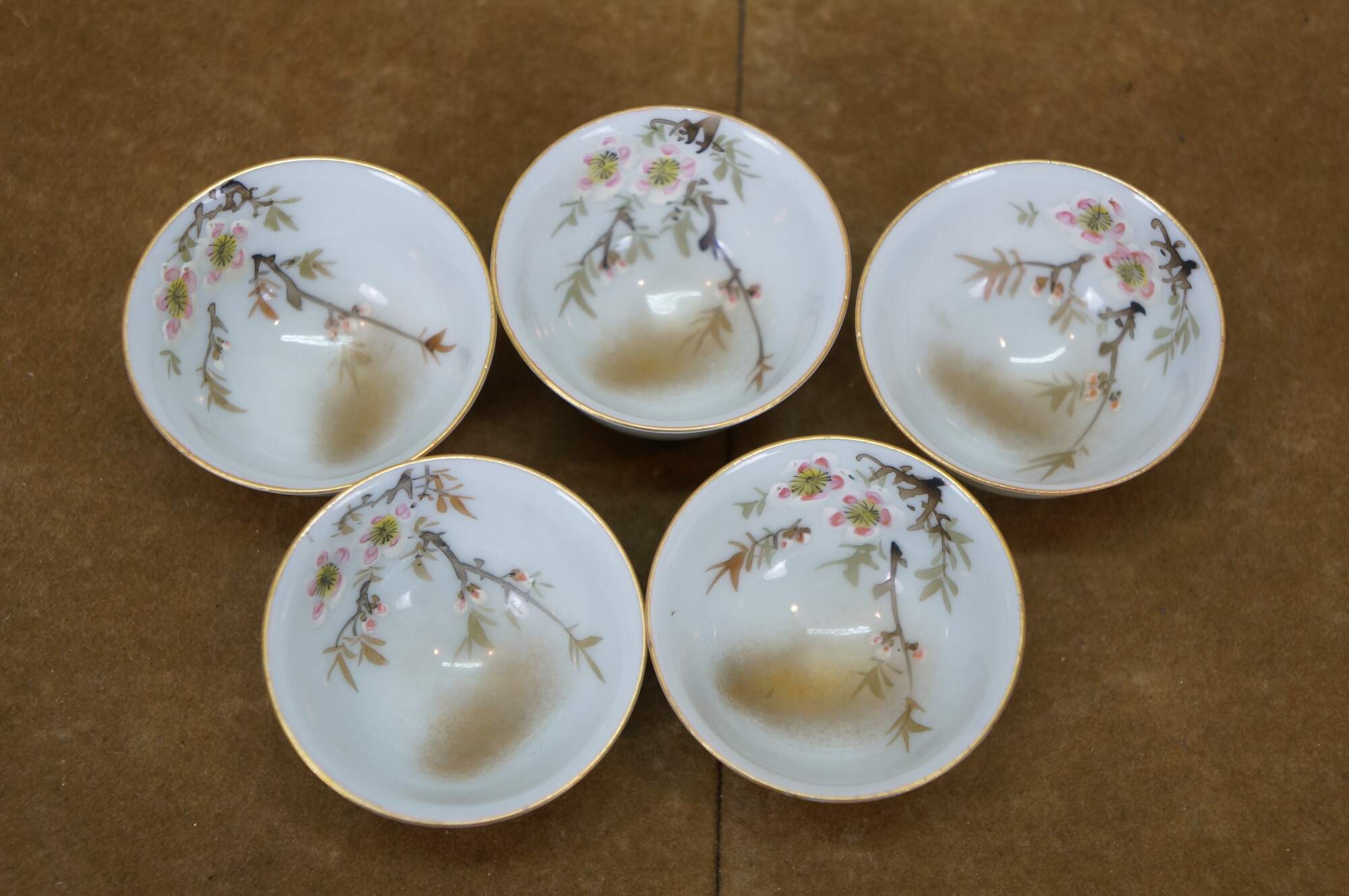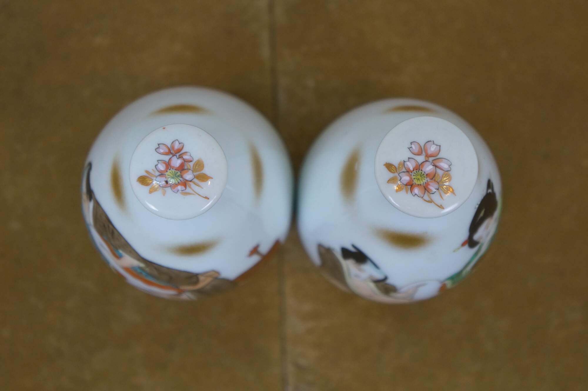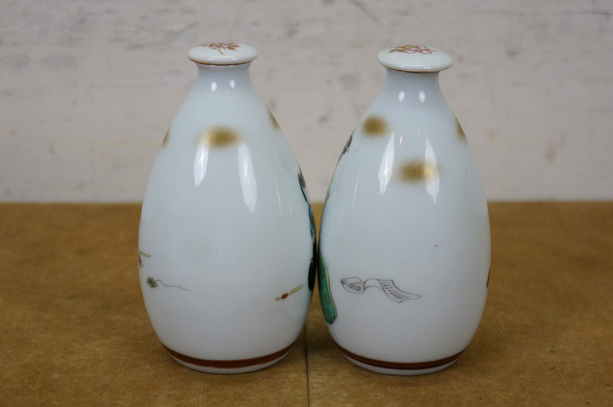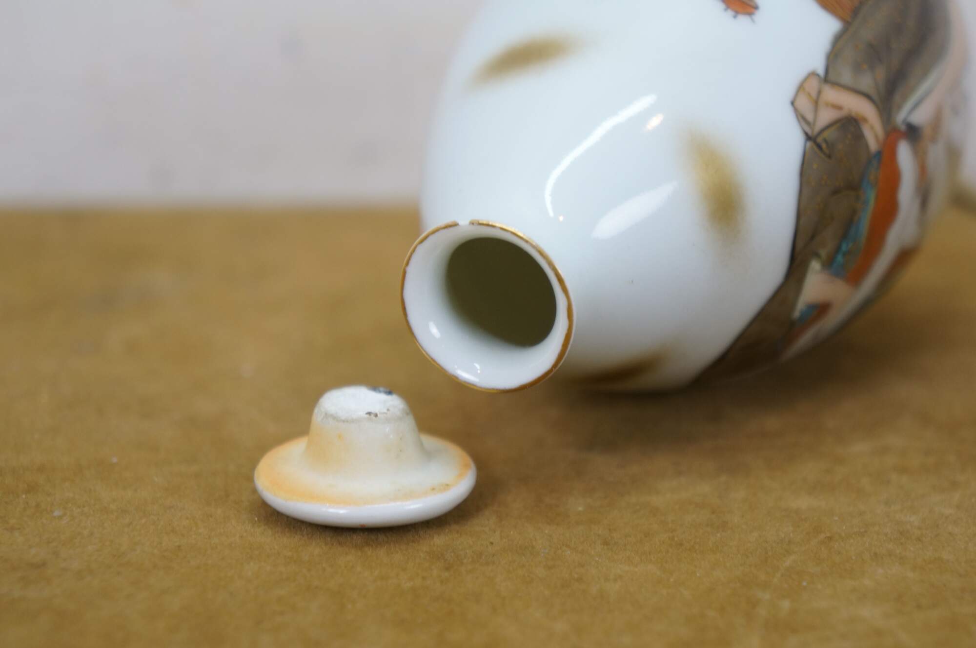 Vintage seven piece Japanese porcelain sake set including two lidded flasks / bottles and five delicate cups, hand painted with figures in a variety of amorous poses.