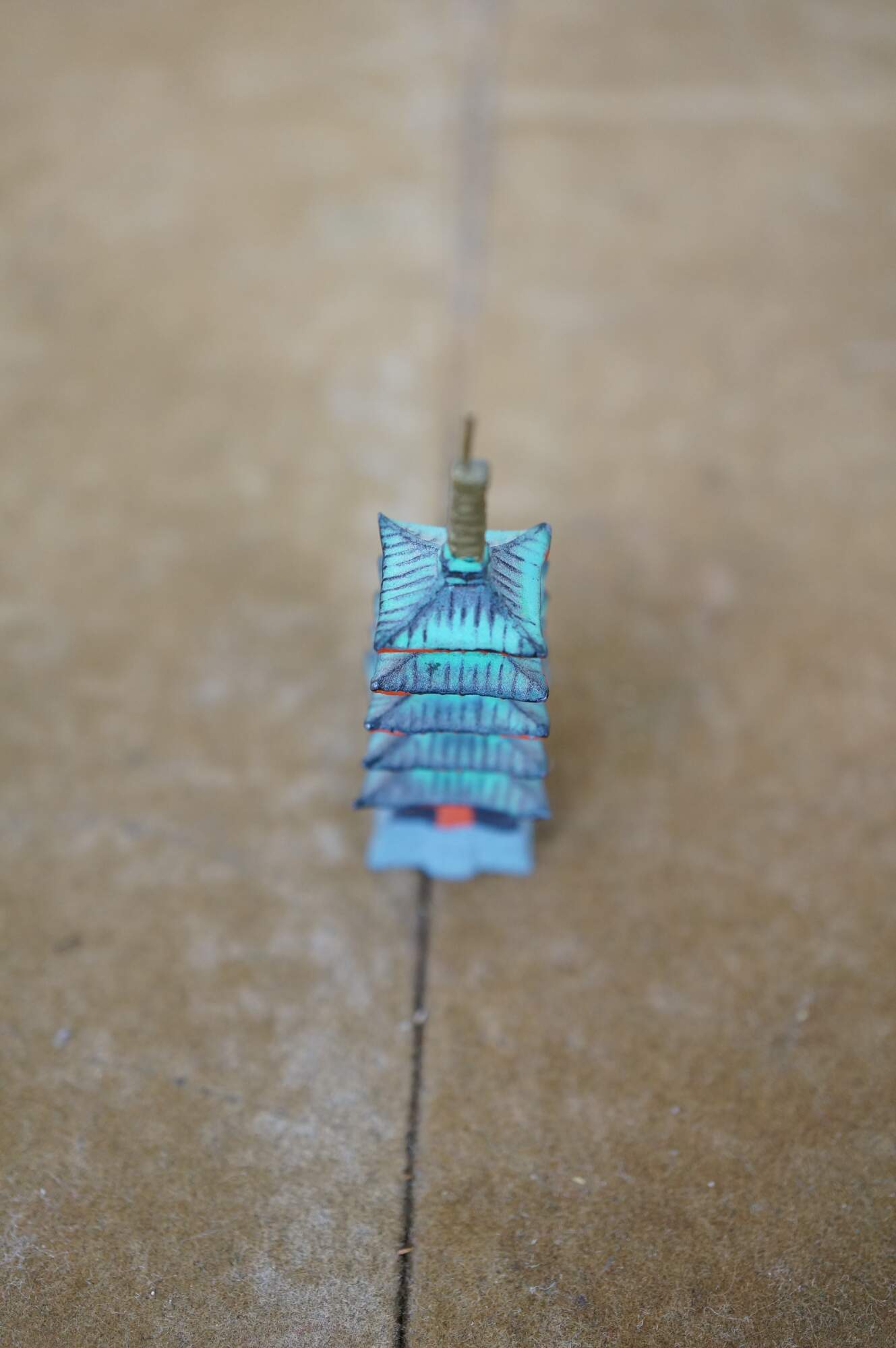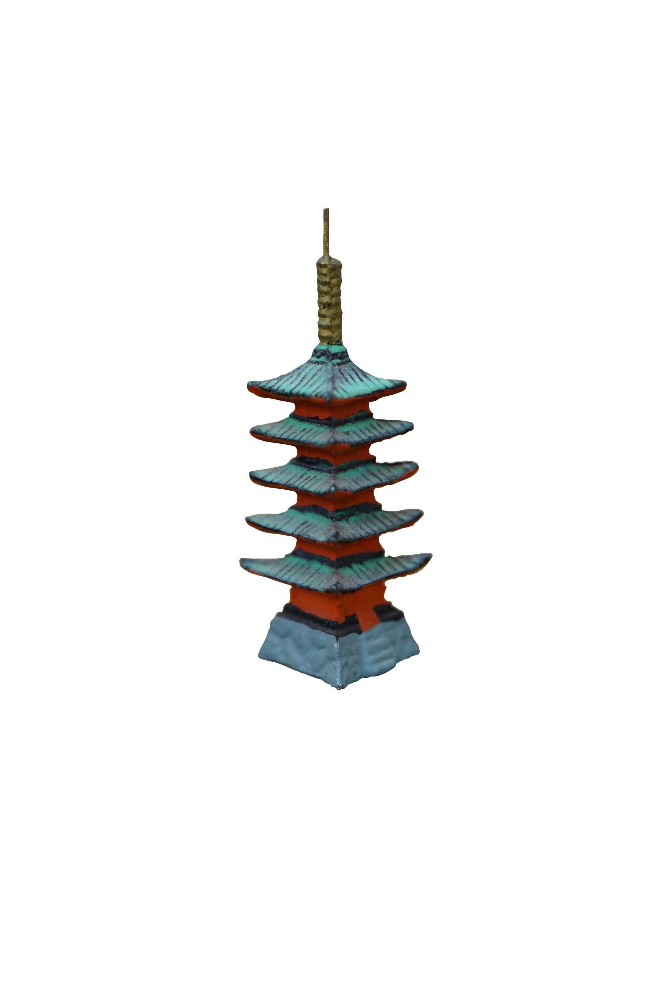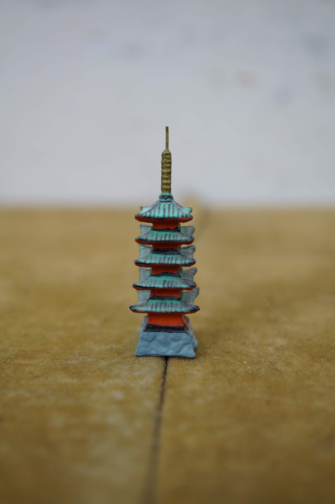 Vintage Japanese miniature pagoda buidling / structure. Made of metal featuring a tiered design. Made for use in a Bonkei scene / landscape.