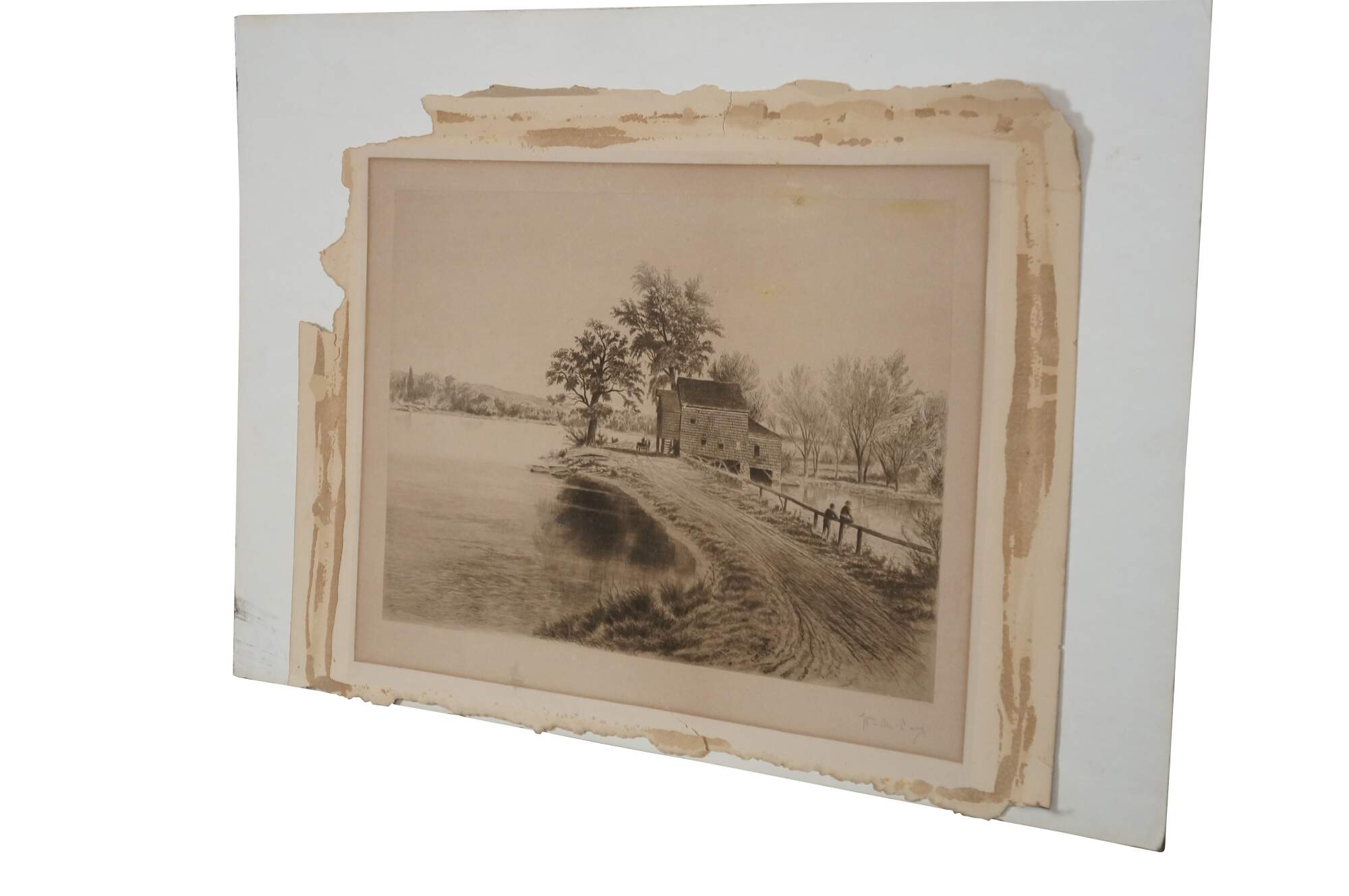 Late 19th century black and white etching by William de la Montagne Cary. Ladnscape with figures fishing from a causeway near an old stone water mill. Pencil signed, lower right. Copyright 1891 by Fishel, Adler & Schwartz, New York. Paper mounted on cardstock; unframed.