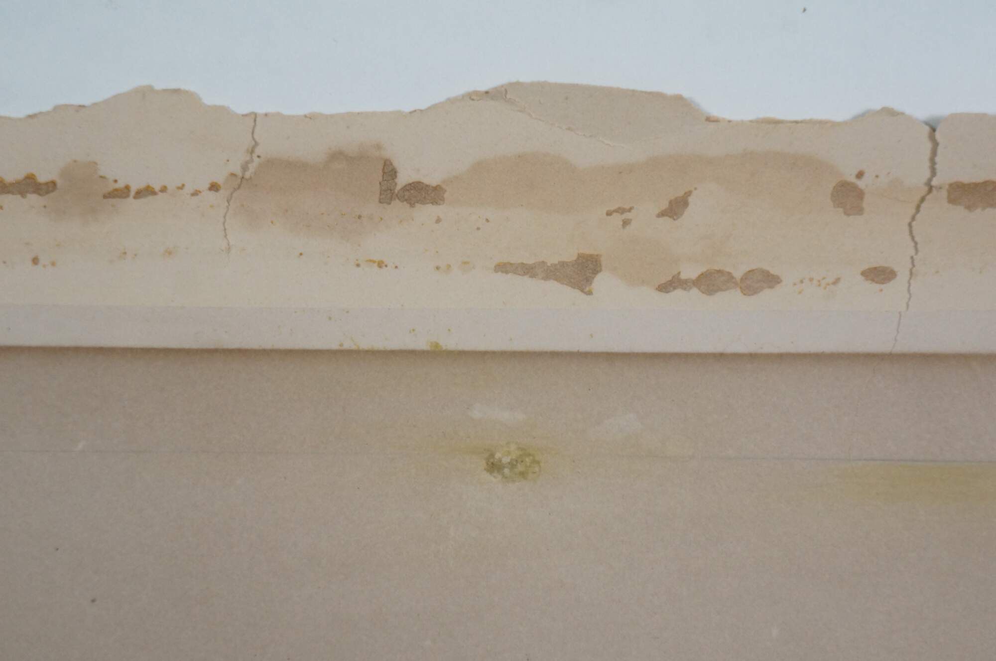 Wear and distressing, damage to mat edges; small tear at bottom; discoloration, foxing, mark / spot near top of etching.