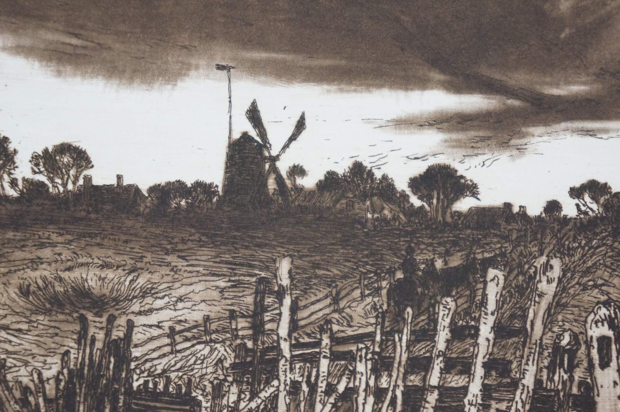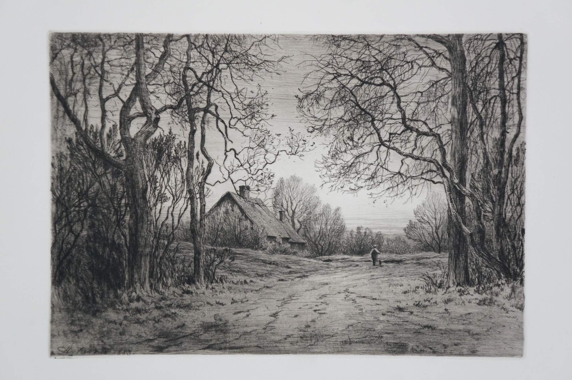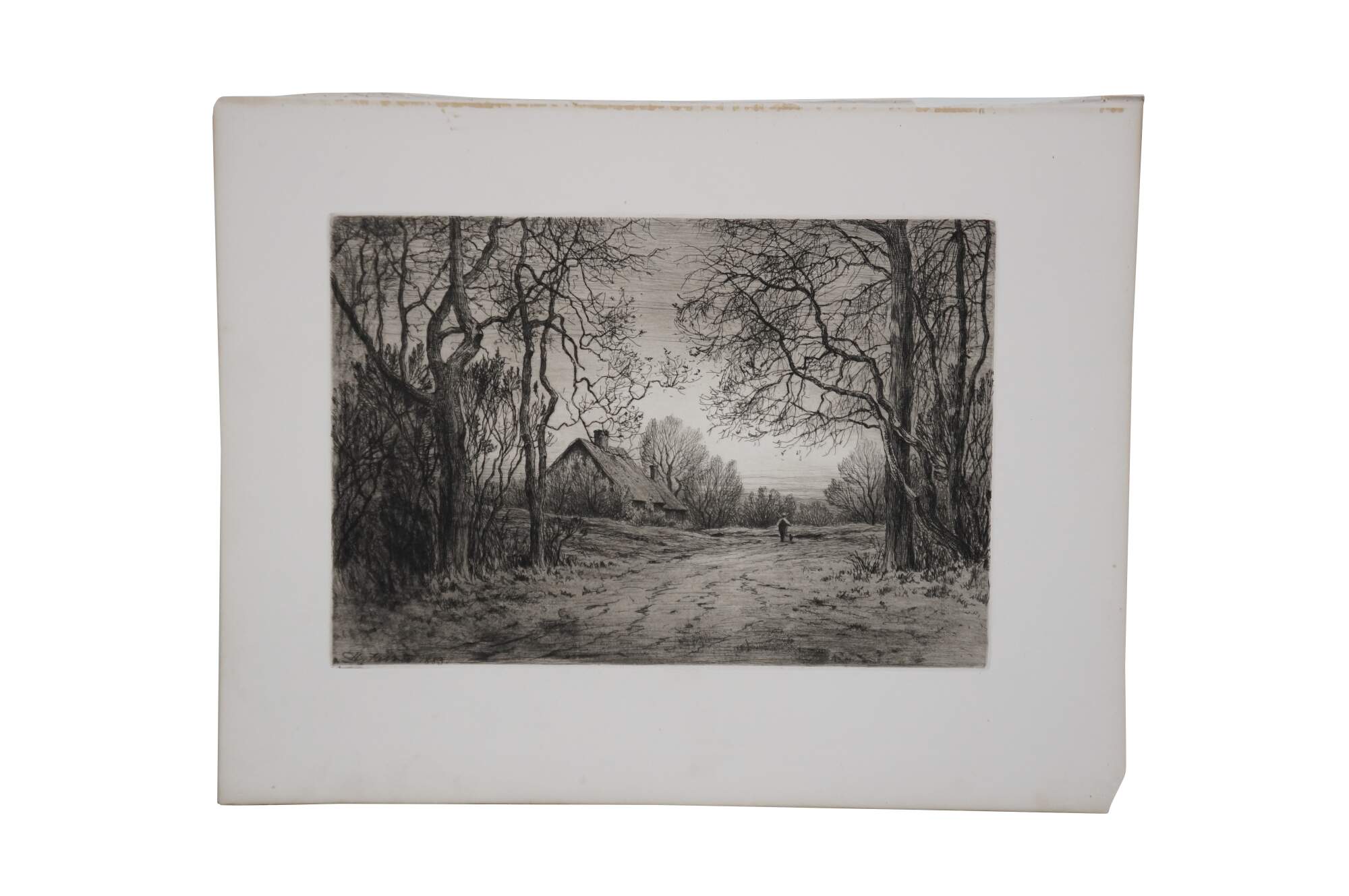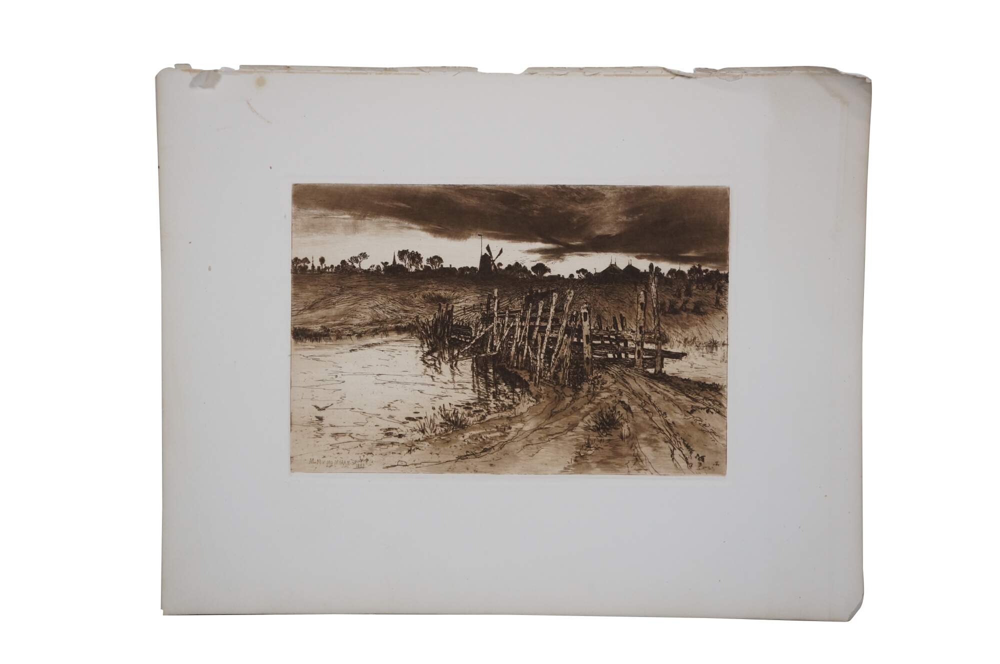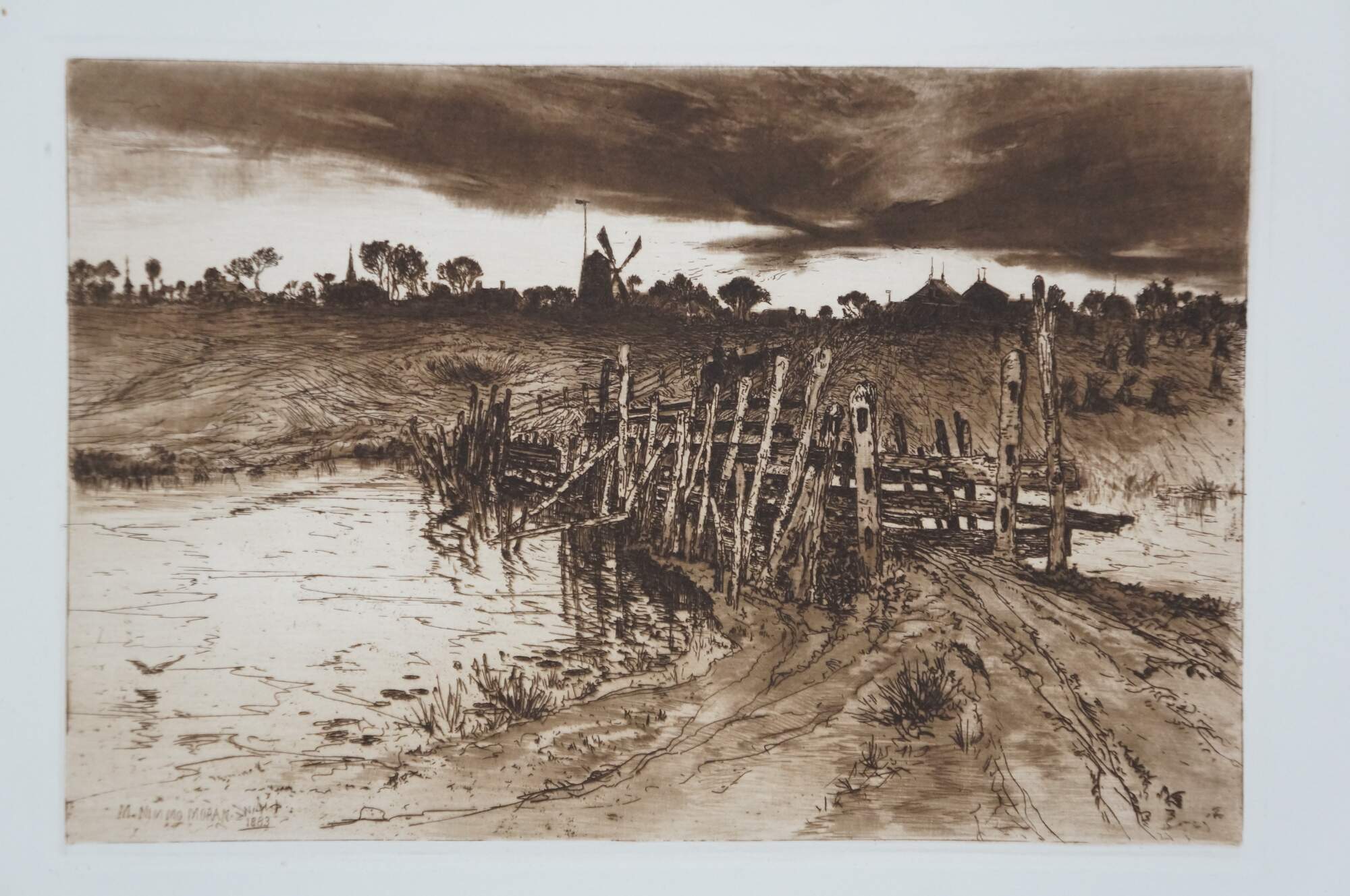 "Mary Nimmo Moran (1842 - 1899) was active/lived in New York / Scotland. Born in Strathaven, Scotland, Mary Moran established a reputation as one of the foremost 19th-century landscape etchers in the United States. Many of her etchings were made on location directly onto the copper plate. She finished about 70 landscape etchings that included scenes of England and Scotland as well as New Jersey, Long Island, Pennsylvania and Florida. Her father, Archibald Nimmo, was a weaver, and when her mother died when Mary was five years old, the father brought her and her brother to America where they settled in Crescentville, Pennsylvania, near Philadelphia. They were neighbors of the Moran family whose son and panoramic landscape painter, Thomas, she married in 1862. Mary learned to draw and paint in oil and watercolor from him and made her first etching in 1879. Soon she was exhibiting at the Pennsylvania Academy (1878-1889) and in New York at the National Academy of Design (1877-1896). Other exhibition venues were the Boston Art Club, Brooklyn Art Association, and the Women Etchers of America exhibition at the Union Club in New York. She worked primarily on the East Coast and Florida but also in Europe. The Morans had three children, and with their family, they painted in France, Italy and Switzerland in 1867. Upon their return, Thomas Moran's painting "The Grand Canyon of the Yellowstone" sold for ten-thousand dollars, and they used the money to buy a home in Newark, New Jersey. Mary Moran did many paintings of the surrounding New Jersey countryside, managed the business aspects of her husband's career, and ran a drawing school for children. Because of poor health, she could not accompany her husband on his many western trips. To occupy her in addition to her painting while he was away, Thomas Moran gave her copper plates and suggested that she take up etching. When he returned, he was so pleased with her work that he submitted then to the New York Etching Club. The positive reception was immediate. "Mary Moran had indeed found her metier; she worked furiously, and in the 1880s, was recognized as the leading American woman etcher." (Rubinstein 71). She was elected to the New York Etching Club and to the Society of Painters and Etchers in New York. In 1881, in recognition of her printmaking abilities, she was elected an original fellow of the Royal Society of Painters-Etchers, the only woman among 65 members. English critic John Ruskin gave her much praise for her entries as did other critics. In 1893, she won a medal at the World's Columbian Exposition in Chicago for her prints. Six years later, she died at age fifty seven from typhoid fever, having exhausted herself by nursing her daughter through the same illness. The Smithsonian Institution held a retrospective of her work in 1950." (askART)