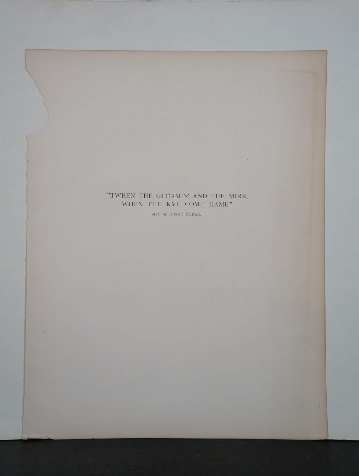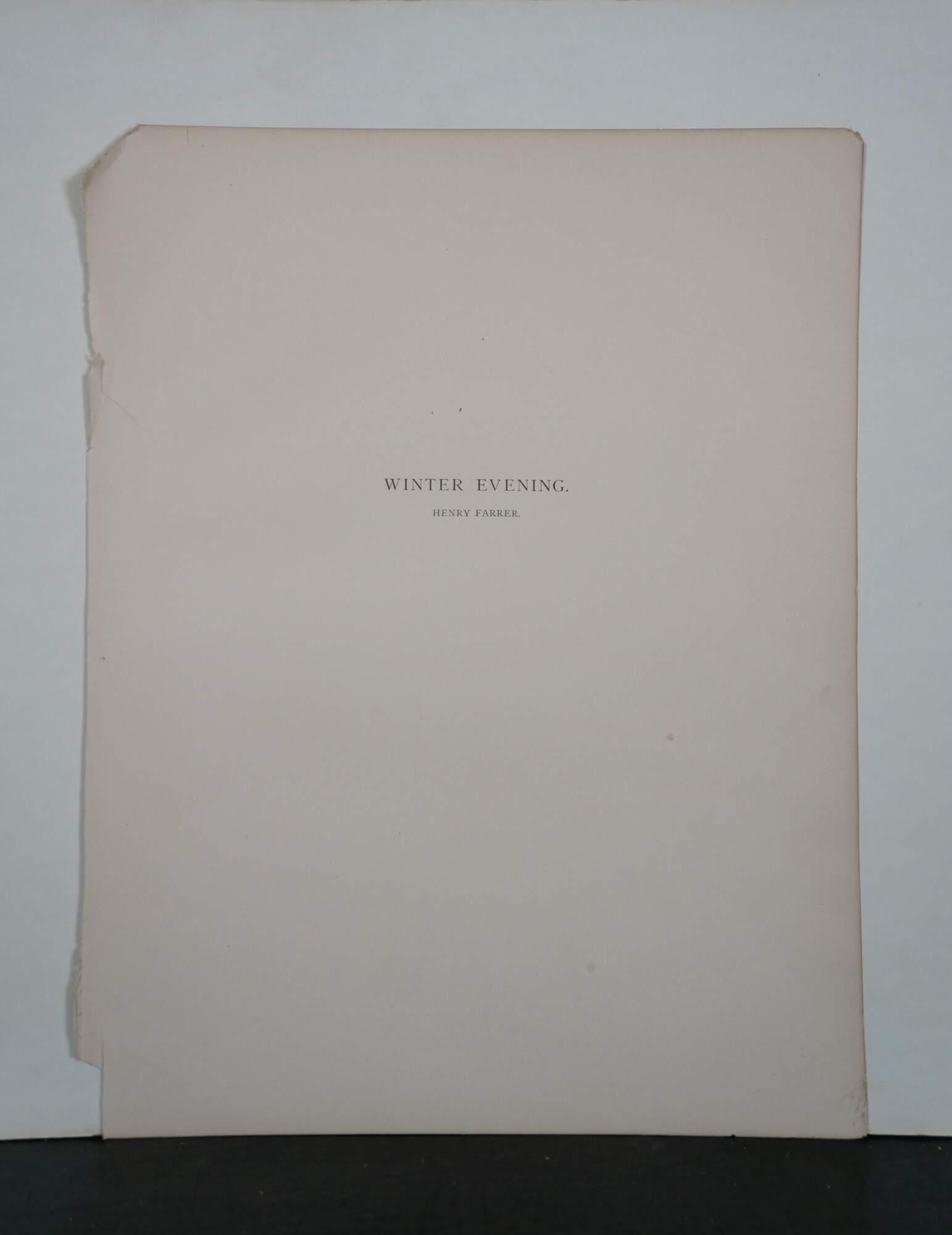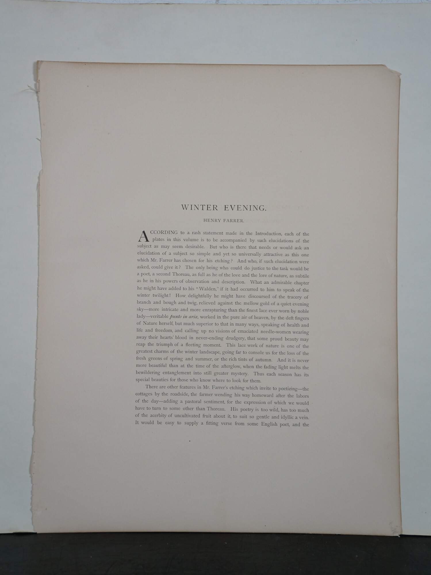 Pair of late 19th century book plate etchings from the 1883 folio "Original Etchings by American Artists." Included are "'Tween the Gloamin' and the Mirk, When the Kye Come Hame" by Mrs. Mary Nimmo Moran and "Winter Evening" by Henry Farrer. Both signed in plate/dated 1883. Both include title pages. Winter Evening also includes page of information about the piece/artist.