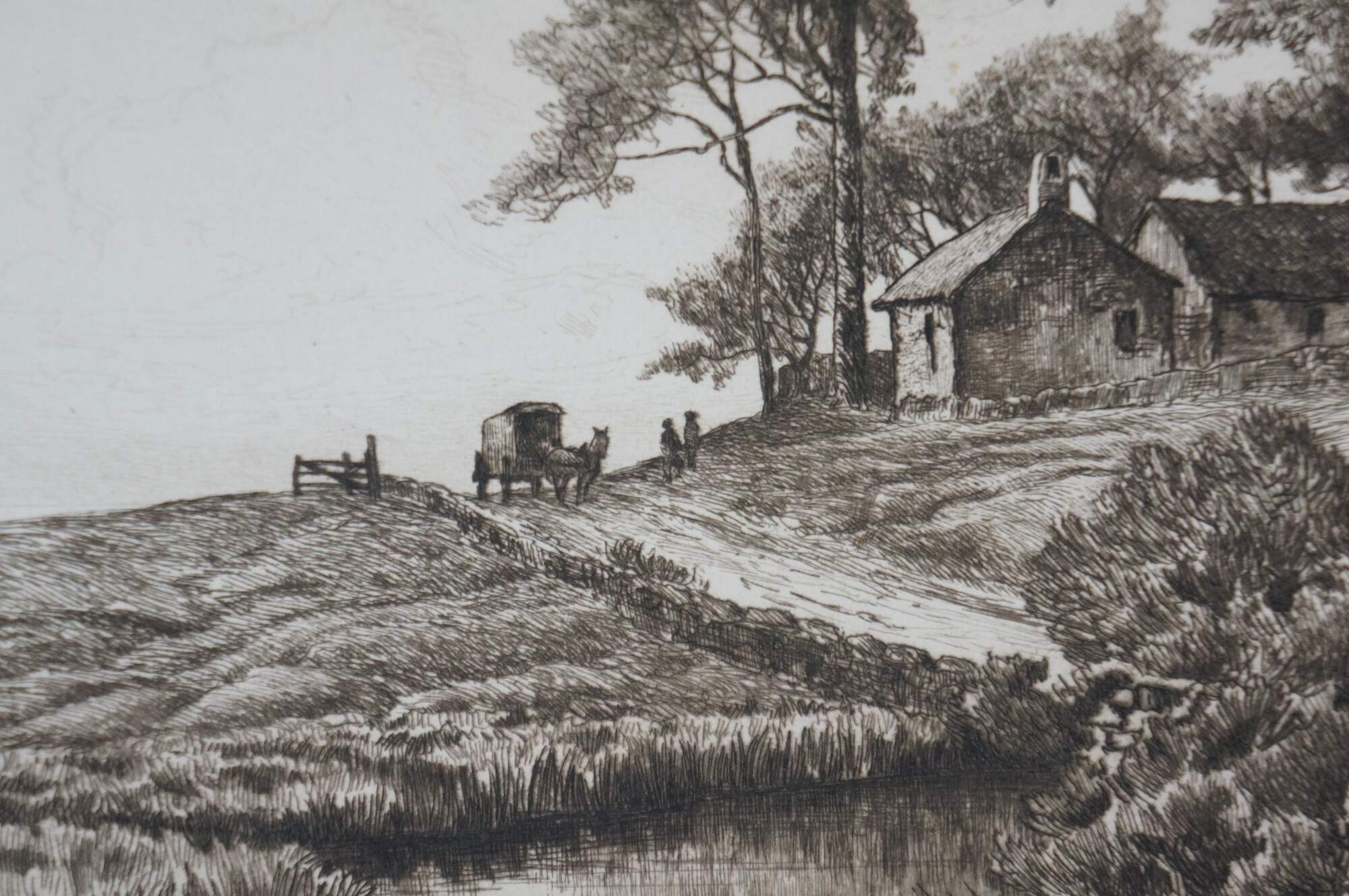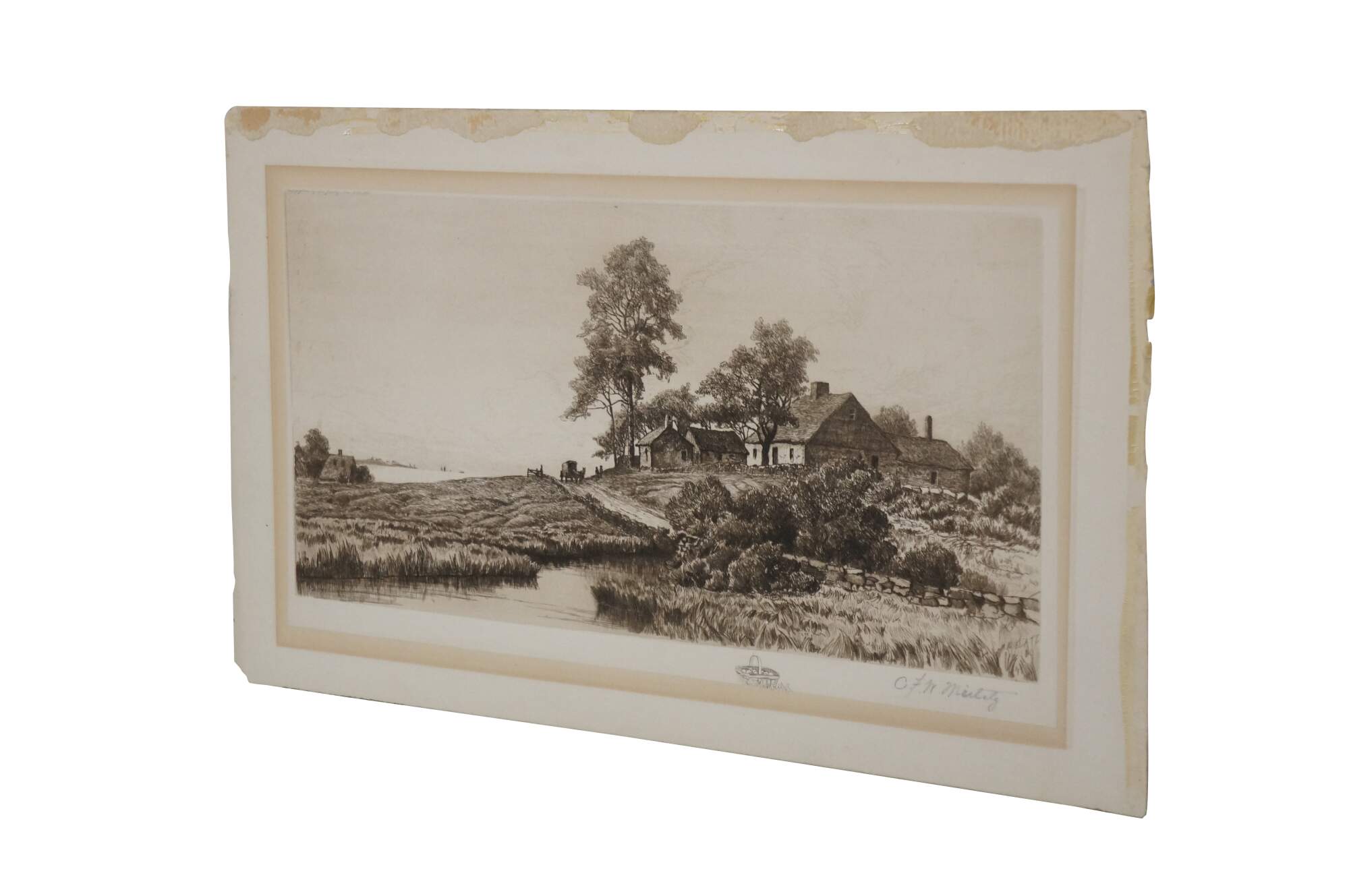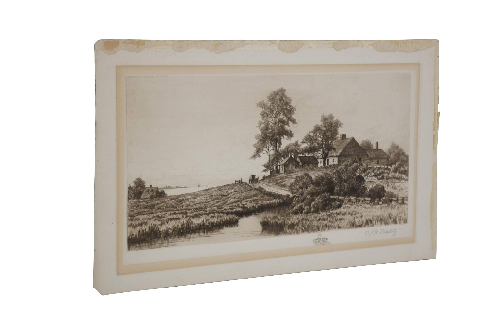 Late 19th century black and white etching titled "In Sight of the Sea" by Charles Frederick Mielatz. Coastal country landscape featuring a horse and buggy beside a thatched cottage overlooking the sea. Pencil signed, lower right. Remarke of a basket of fruit, lower edge. Signed in plate/dated 80, lower right. Copyrighted by Max Jacoby, New York 1890. Paper mounted on cardboard; unframed.