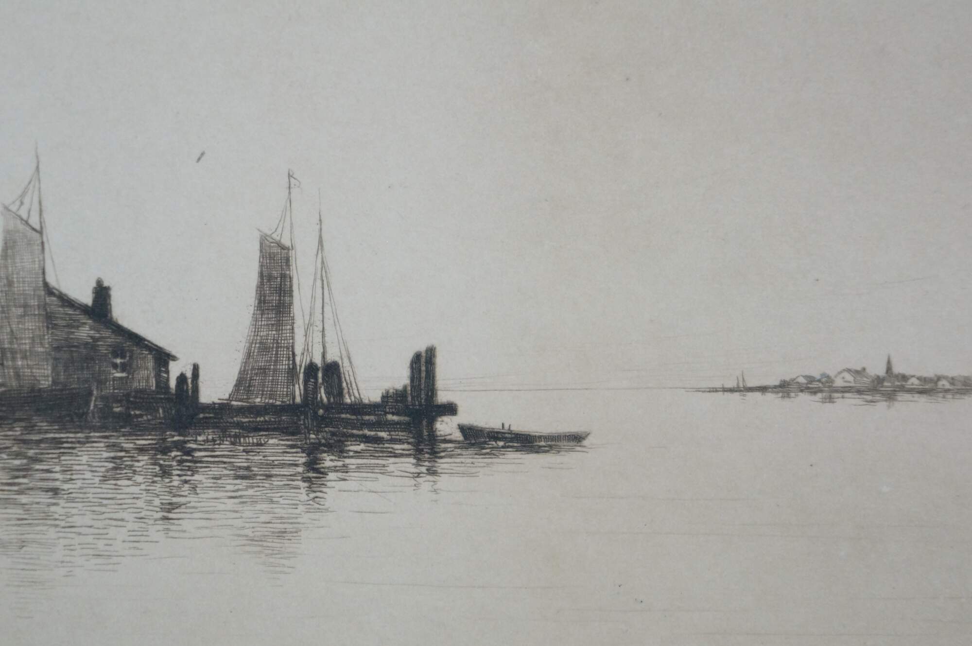 Late 19th century black and white nautical / maritime etching attributed to Ernest C. Rost. Coastal landscape of a small fishing village and boats. Remarke of a landscape with cottage, lower edge. Paper on cardboard; unframed.