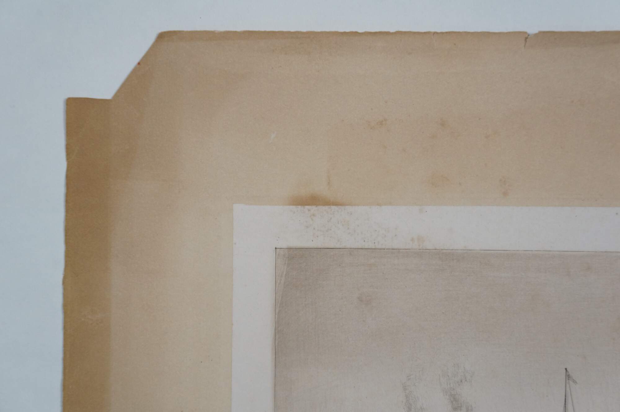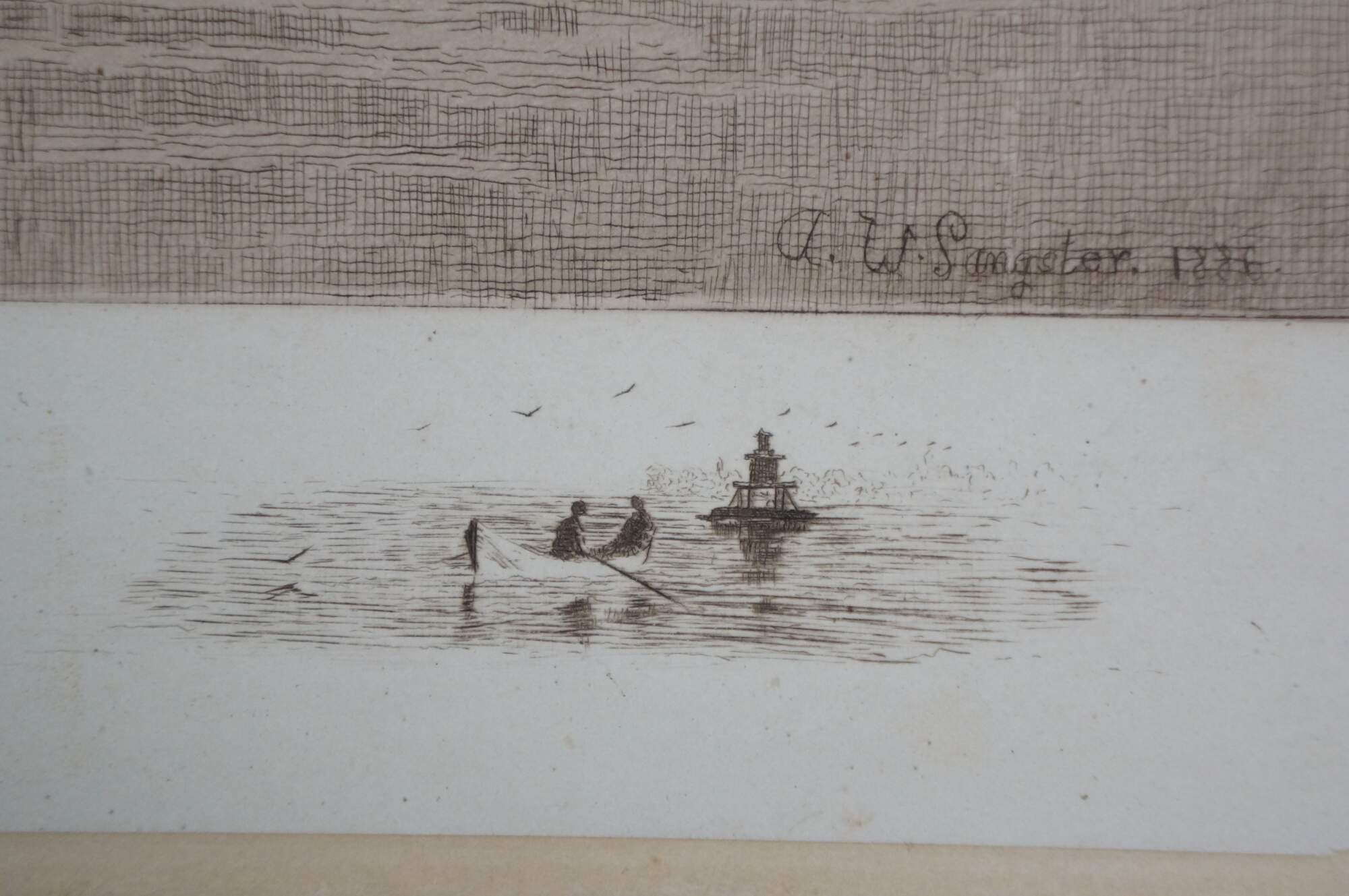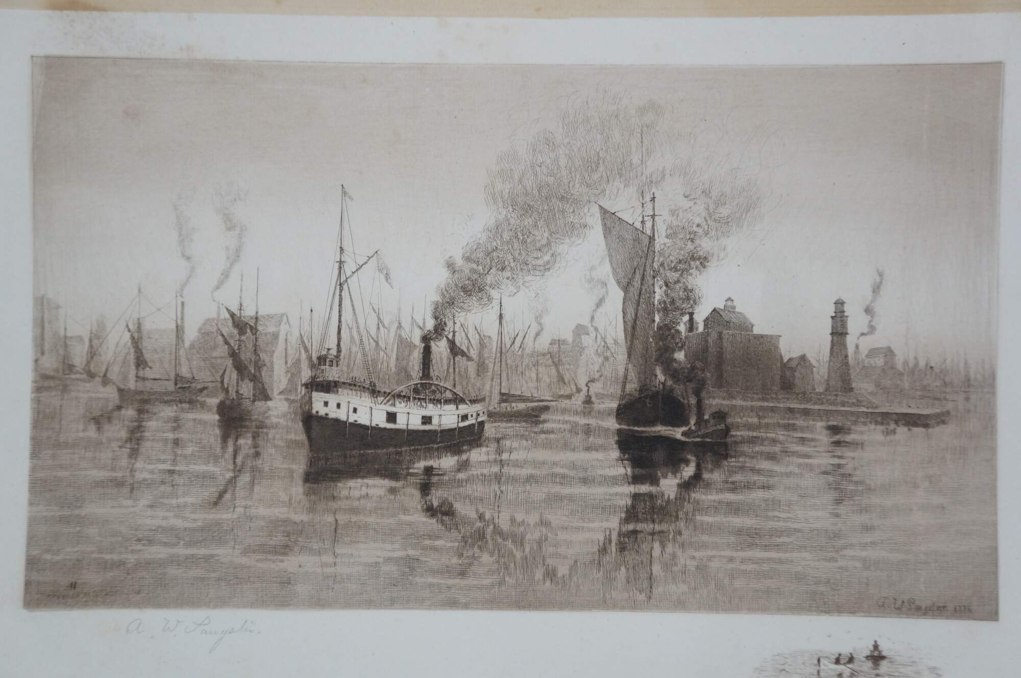 Late 19th century black and white nautical seascape sailboat / boats etching of Buffalo Harbor by Amos W. Sangster, taken from the folio "Niagra River and Falls - From Lake Erie to Lake Ontario." Copyright 1886. Pencil signed, lower left. Remarke of a rowboat by a bouy, lower edge. Signed in plate/dated 1886. Heavy paper; unframed.