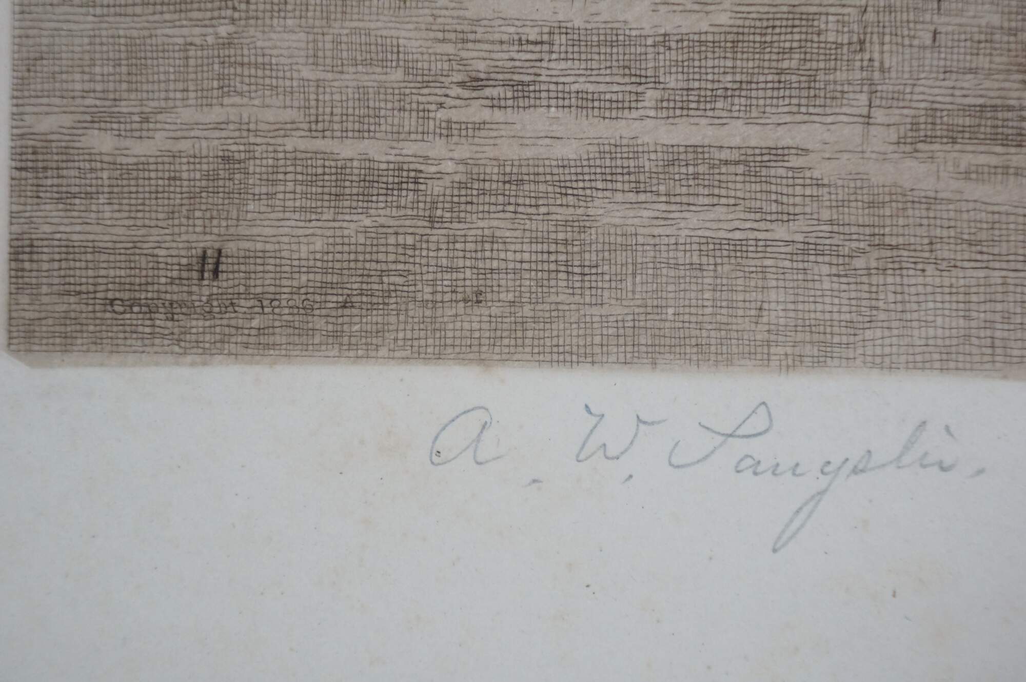 "Amos W. Sangster (1833-1904) was a Canadian-born, Buffalo-based nineteenth-century landscape painter, printmaker, educator, and arts advocate. In his own time, he was widely known as “the painter of the Niagara Frontier.” He was born in Kingston, Ontario, on February 5, 1833, the second of twelve children in a family of artists. The family first moved to Buffalo in 1834, relocated for a time to Newark, Ohio, then returned to Buffalo for good in 1844. In his spare time, Sangster carved wood and painted; he briefly studied to become a Methodist minister, then turned his attention full-time to art. Sangster famously took no more than two formal lessons in his entire life; getting nothing out of them, he resolved to teach himself how to paint. Beginning in the 1850s he supported himself for many years by working as a specialist in wood engraving for the Courier Company, a major American lithographic company. In his off-hours, he began spending more and more time outdoors sketching and painting watercolors of well-known landmarks in Erie and Niagara counties. In 1879 he began working on a collection of original drawings and watercolors on which he would base his monumental series of 153 etchings entitled Niagara River and Falls from Lake Erie to Lake Ontario. Following the entire thirty-six-mile course of the river from one lake to the other, he first sketched his scenes on location and later completed his etchings in his studio. Dedicated to Sangster’s friend, Grover Cleveland, the unprecedented undertaking was one of the greatest publishing feats of its era and served as an important historic record of the region in the late 1800s. Sangster’s later work was influenced by American Impressionism and featured a brighter palette than he was originally known for. He also played a key role in the formation of two major cultural institutions in the region: along with Lars Gustaf Sellstedt and several prominent Buffalo businessmen, he helped found the Buffalo Fine Arts Academy, and in 1891 he became a charter member of the Buffalo Society of Artists, serving as its first vice president." (Burchfield Penny)