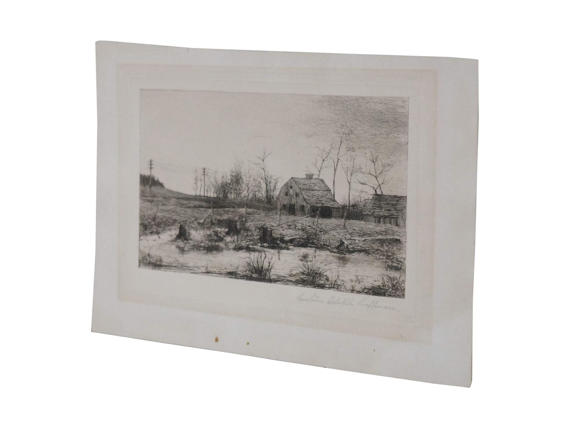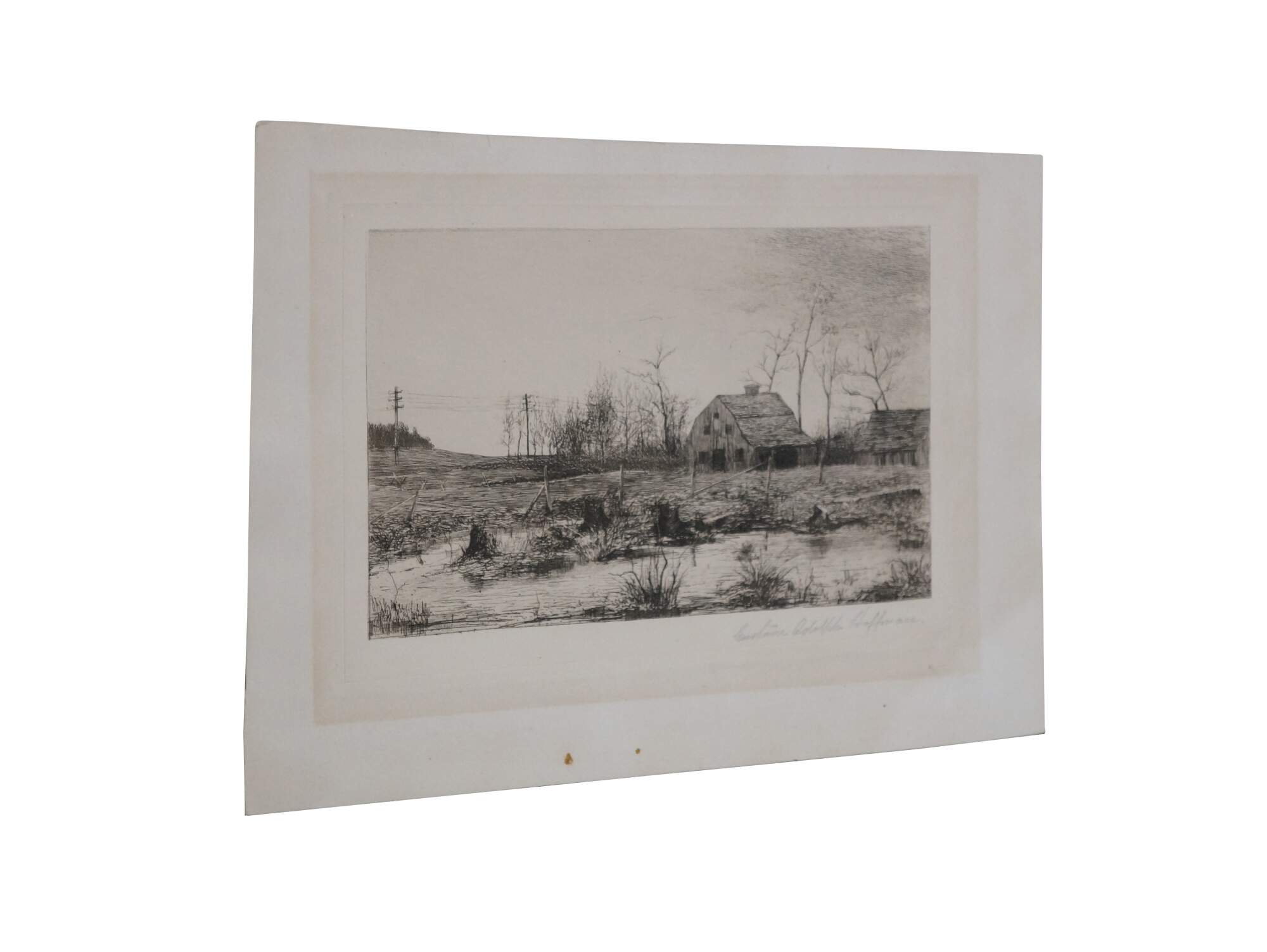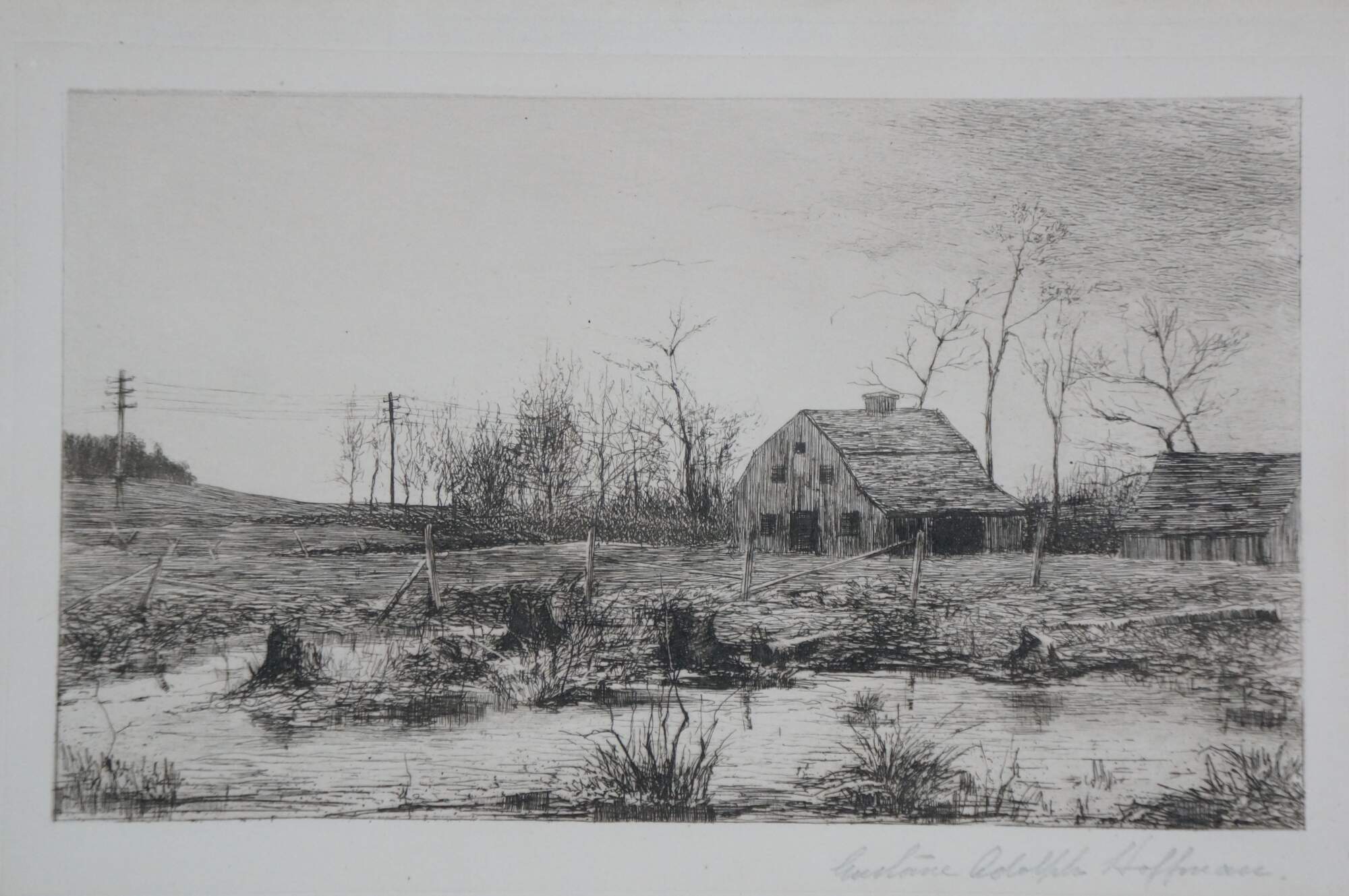 Early 20th century black and white etching by Gustave Adolph Hoffman. Country landscape featuring a pond lined with tree stumps and a rustic barn. Pencil signed, lower right. Paper; unframed.