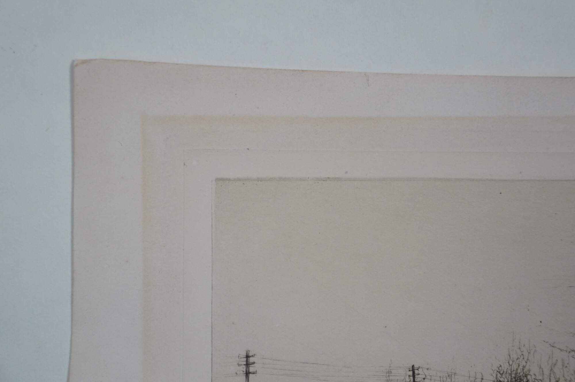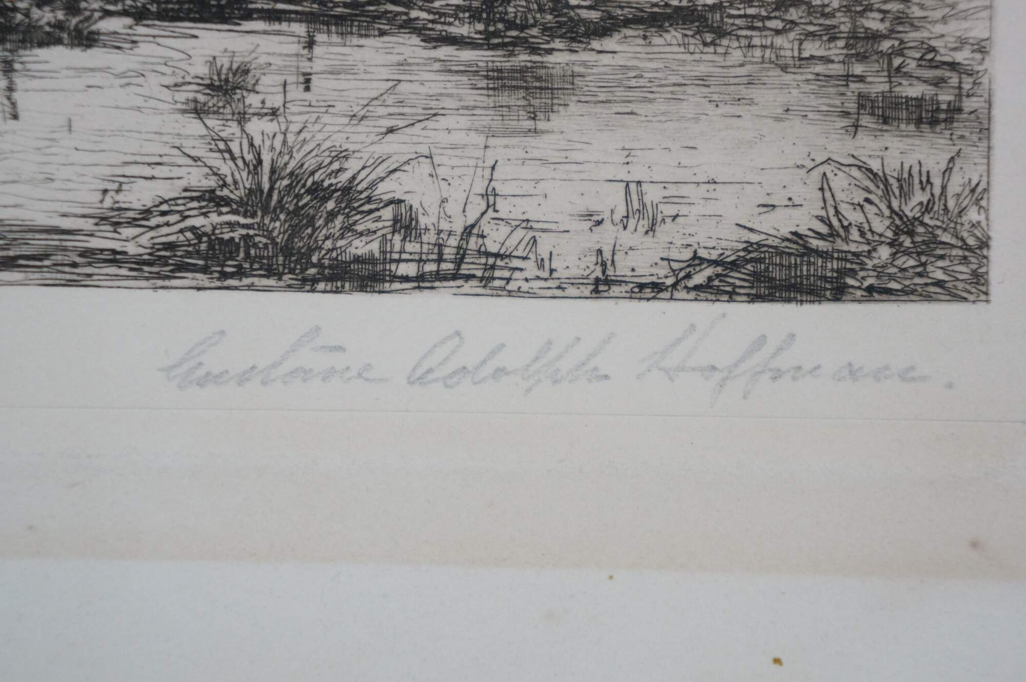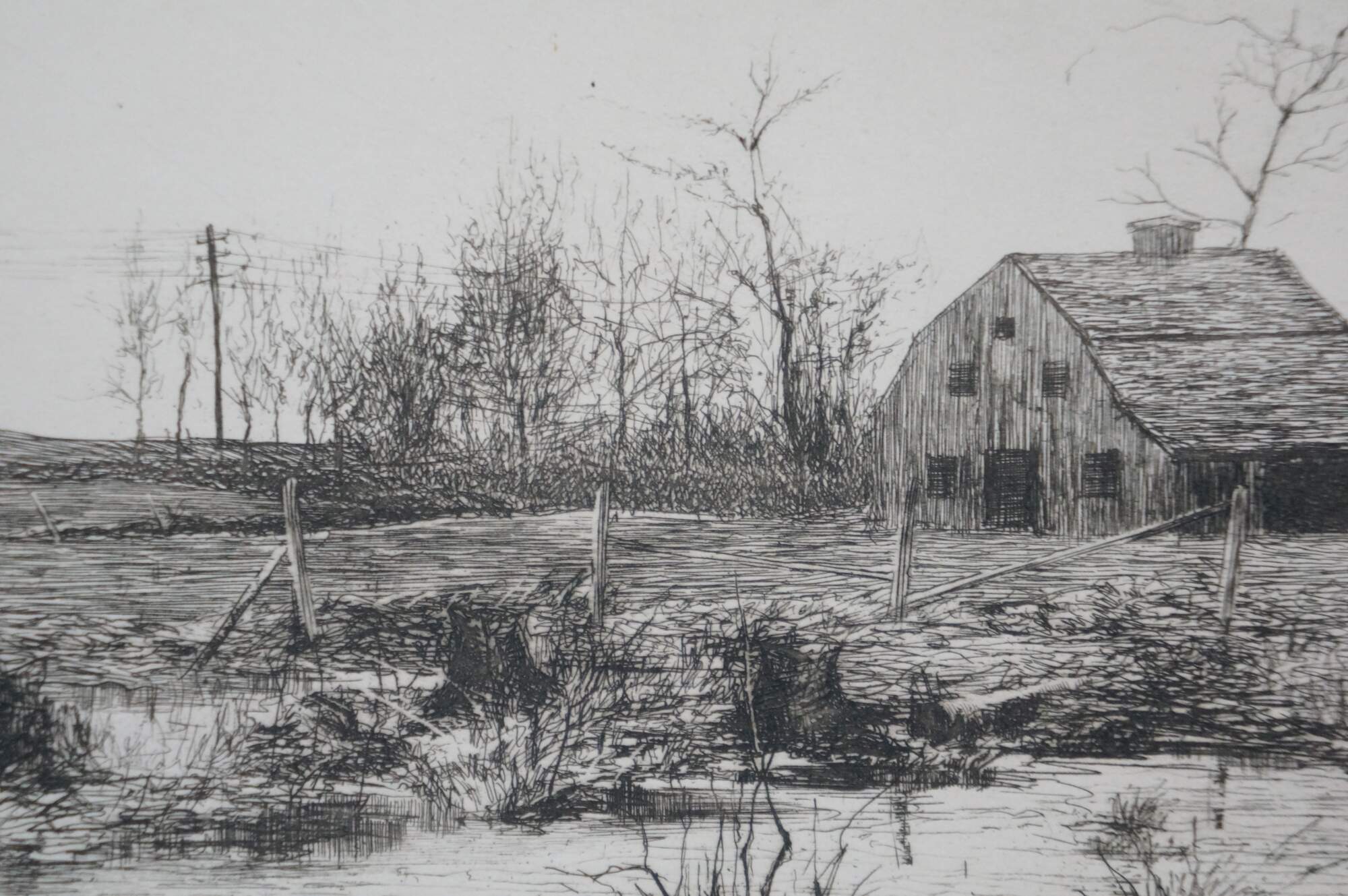 Early 20th century black and white etching by Gustave Adolph Hoffman. Country landscape featuring a pond lined with tree stumps and a rustic barn. Pencil signed, lower right. Paper; unframed.