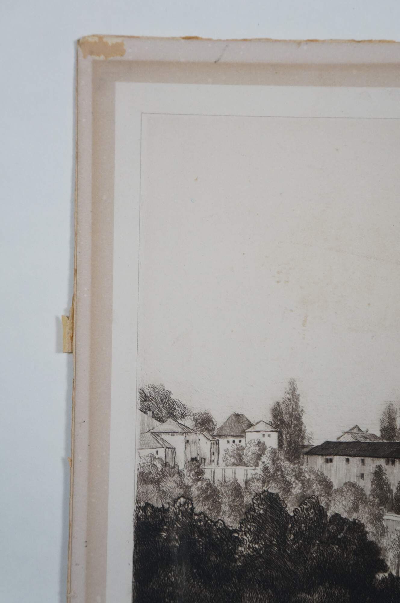Late 19th century black and white etching titled "On the Bridge" by Charles Frederick Mielatz depicting Portugal's National Palace of Sintra / Cintra. The palace's distinctive white fortress walls and cone shaped towers are view from above the road, crossed with walking and riding soldiers holding large spears. Remarke of coat of arms style eagle, lower edge. Signed in plate/dated 96, lower right. Paper mounted on cardboard; unframed.
