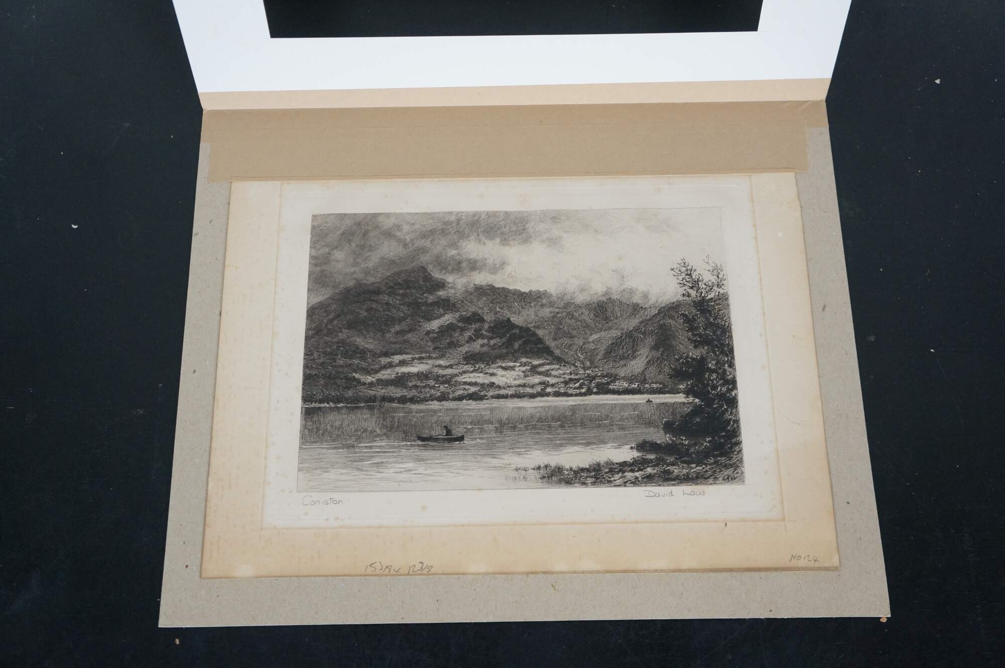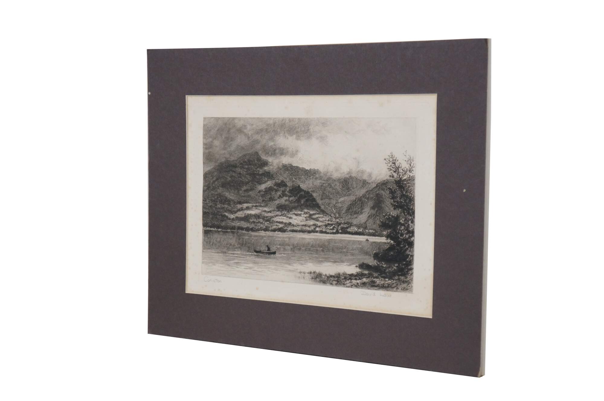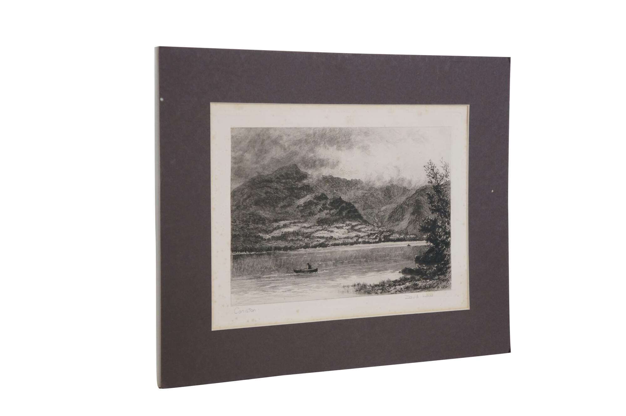 Late 19th century black and white etching titled "Consiton" by David Law. Landscape of a pair of rowboats on a wide mountain lake in Cumbria, UK. Pencil signed/titled along lower edge. Signed in plate, lower right. Paper; dark brown mat; unframed.