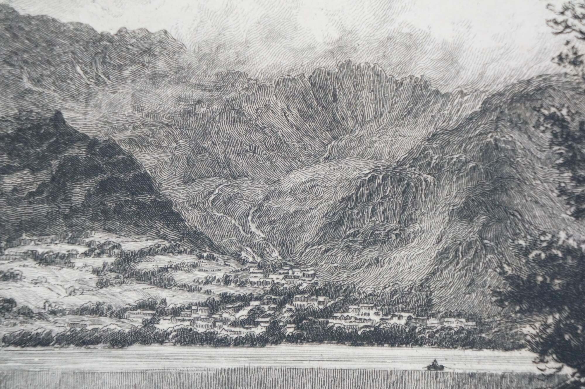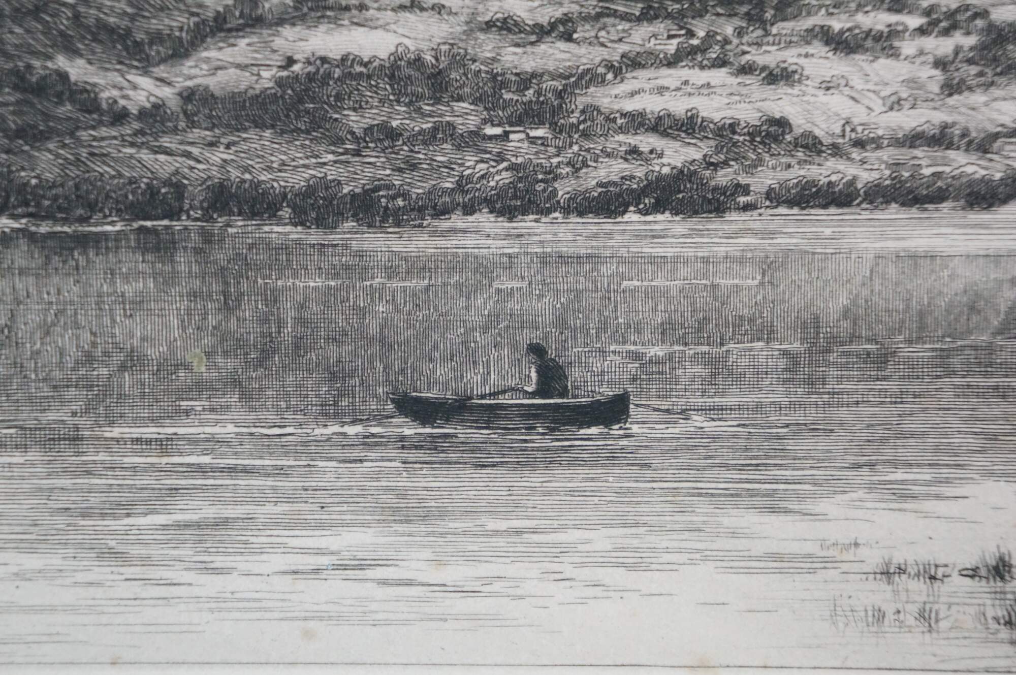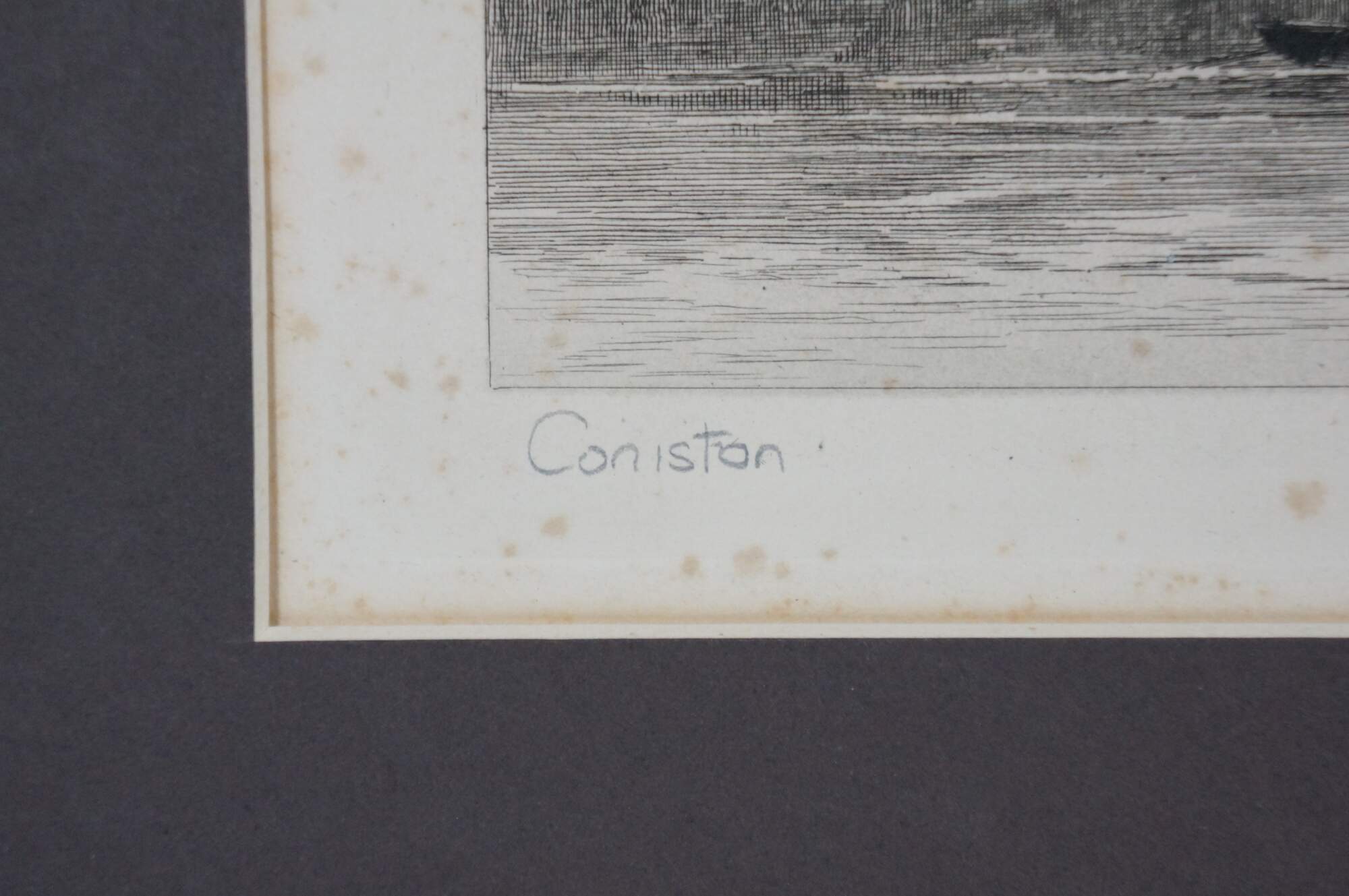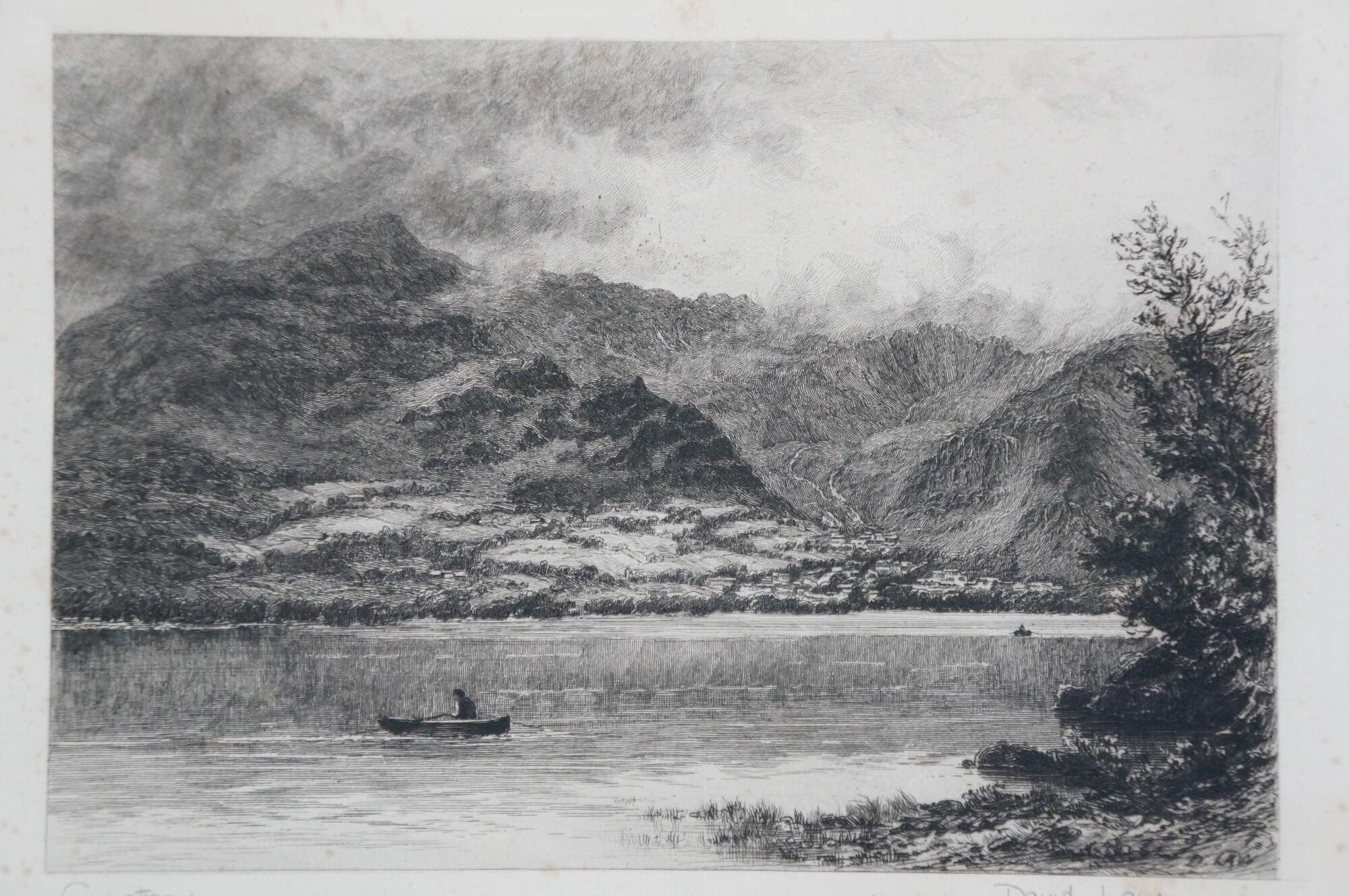 Late 19th century black and white etching titled "Consiton" by David Law. Landscape of a pair of rowboats on a wide mountain lake in Cumbria, UK. Pencil signed/titled along lower edge. Signed in plate, lower right. Paper; dark brown mat; unframed.