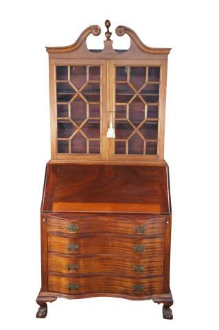 Antique Chippendale slant top secretary desk / bookcase. Made of mahogany featuring upper bookcase curio cabinet with fretwork doors and open pediment with finial, supported by a serpentine / oxbow secretary desk / dresser that opens to a writing surface with multiple cubbies and drawers. The piece is supported by carved ball and claw feet and also features hidden compartments inside the secretary. These desks are often referred to as Governor Winthrop desks. a style popularized during the Colonial Revival period.
