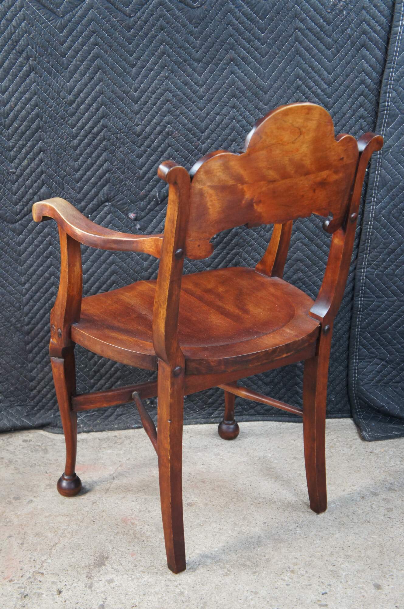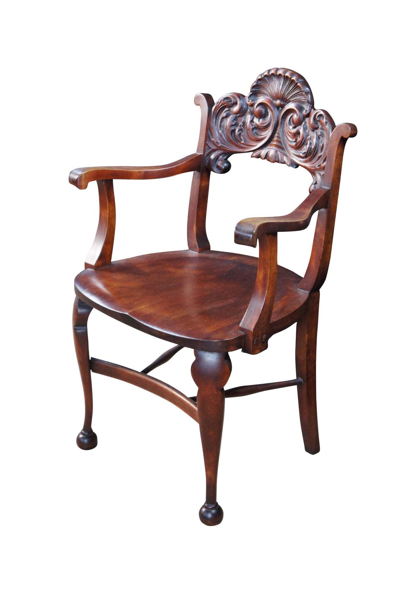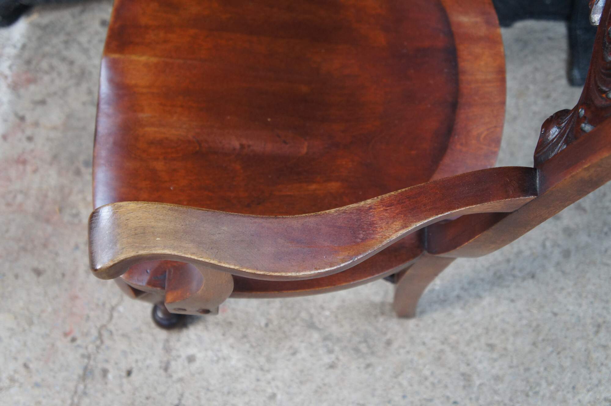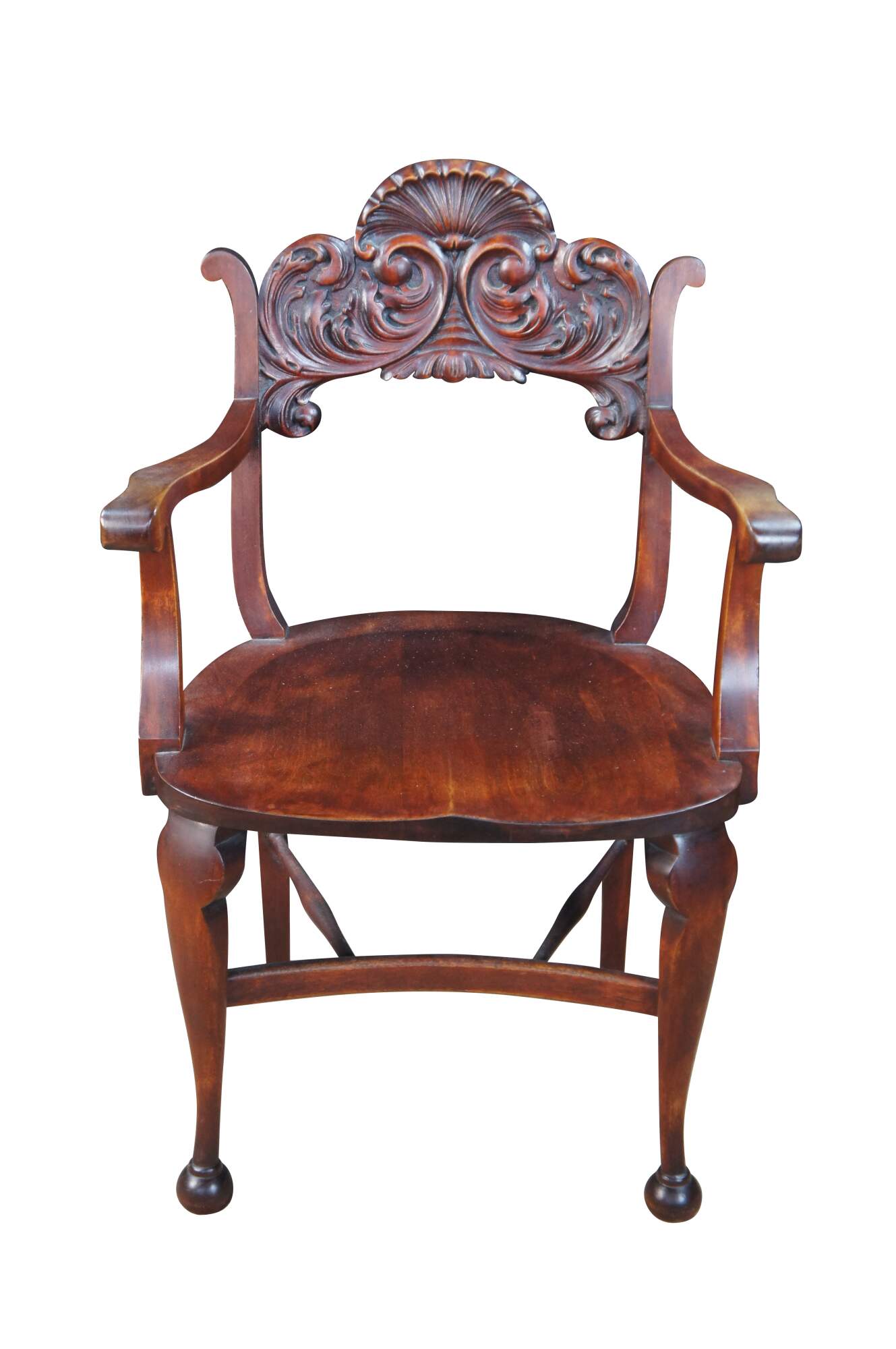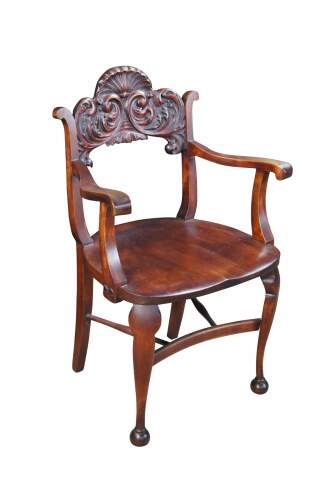Vintage walnut saddle seat style desk chair featuring Victorian Revival styling with carved acanthus and shell design, and ball feet. Possibly Stomps-Burkhardt.