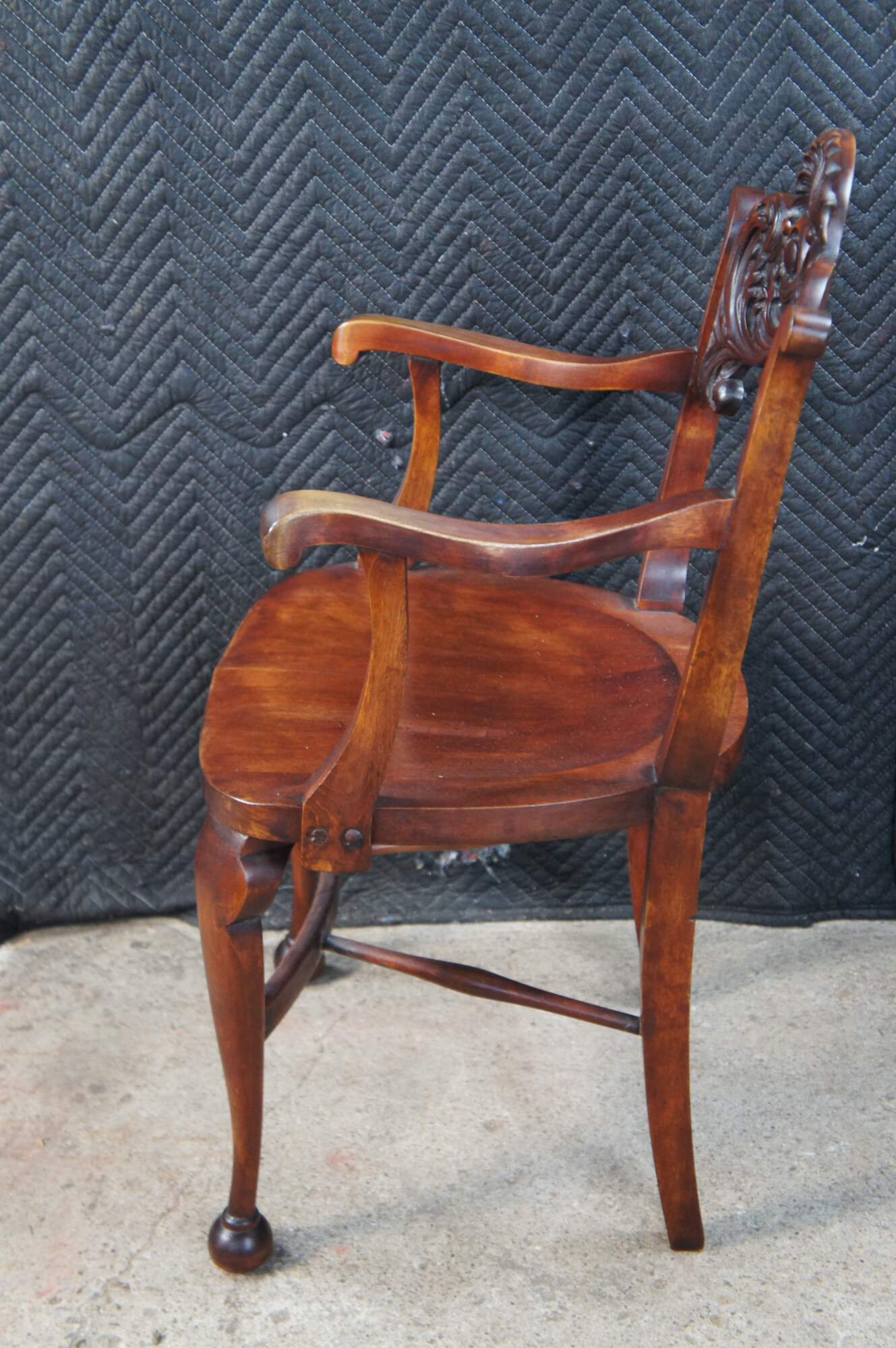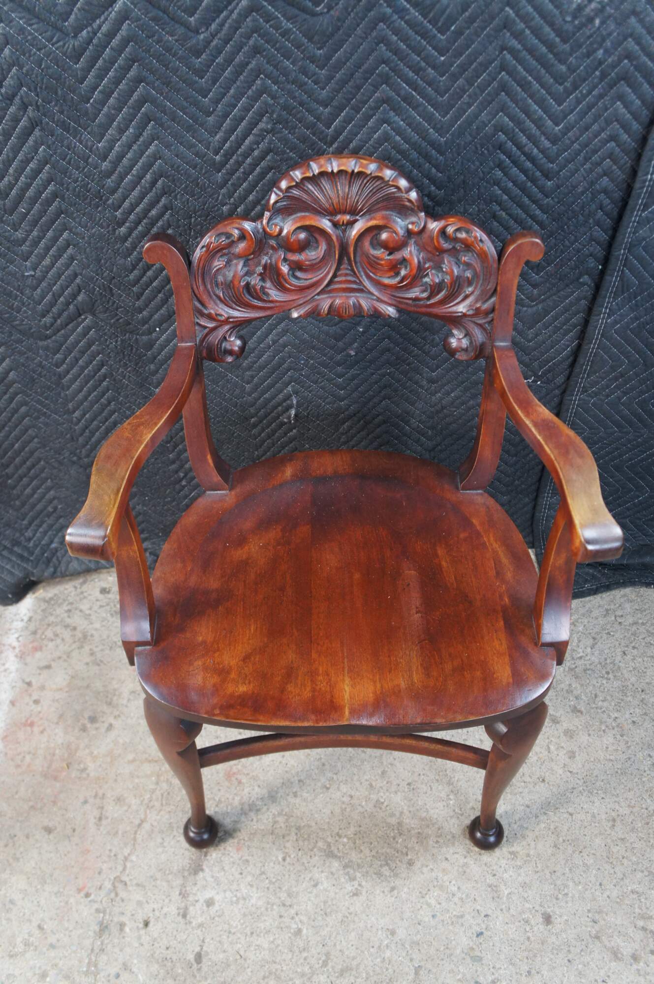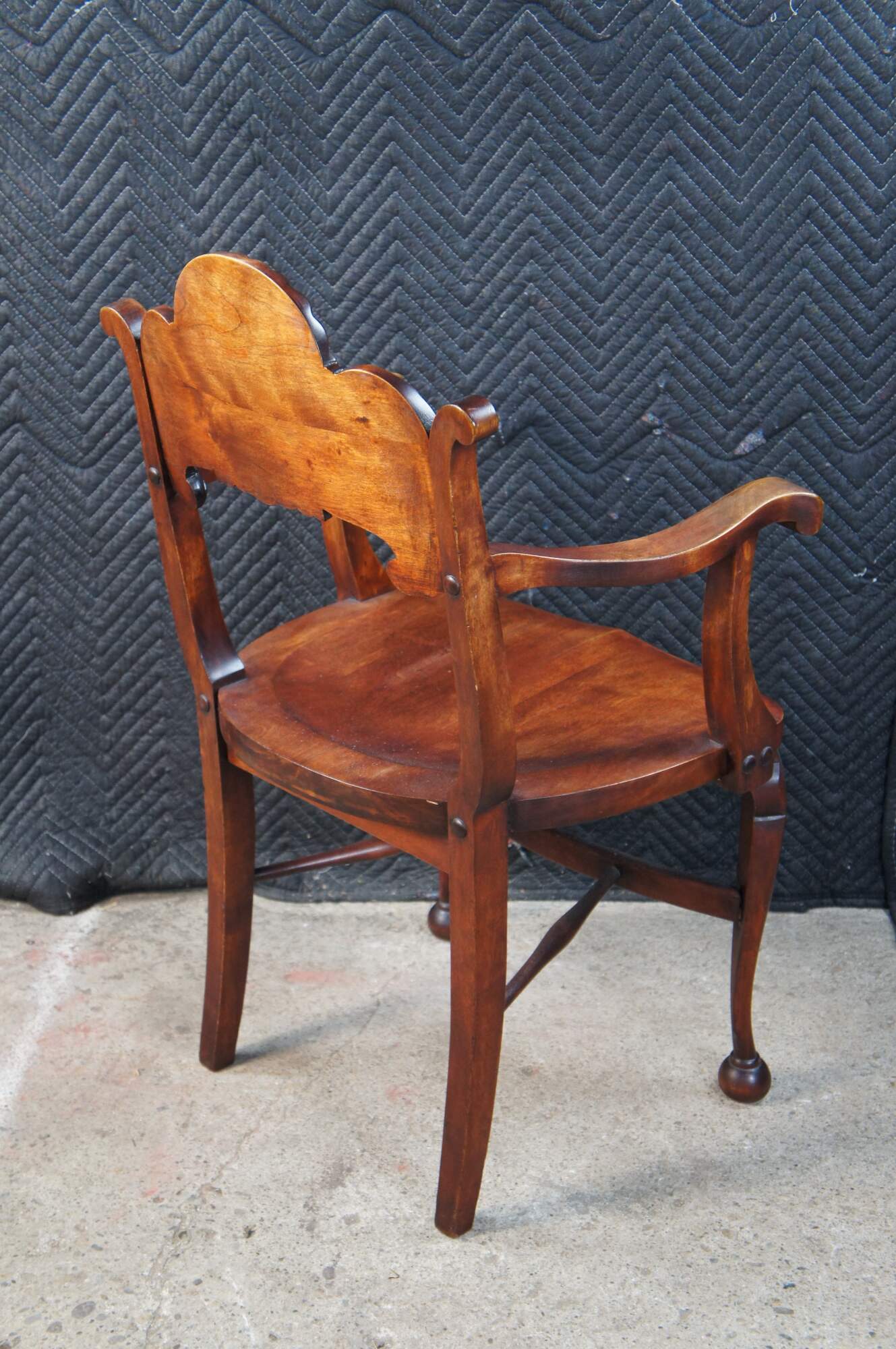 Vintage walnut saddle seat style desk chair featuring Victorian Revival styling with carved acanthus and shell design, and ball feet. Possibly Stomps-Burkhardt.