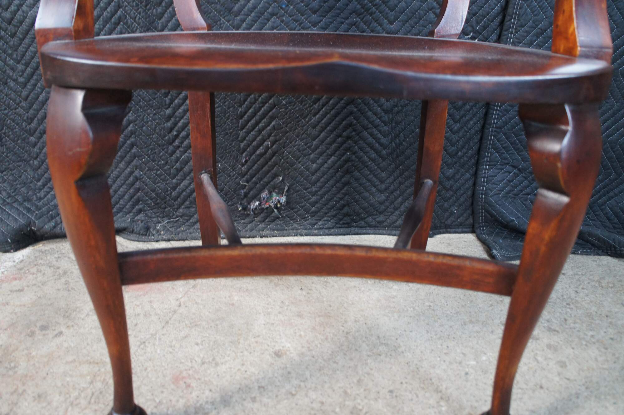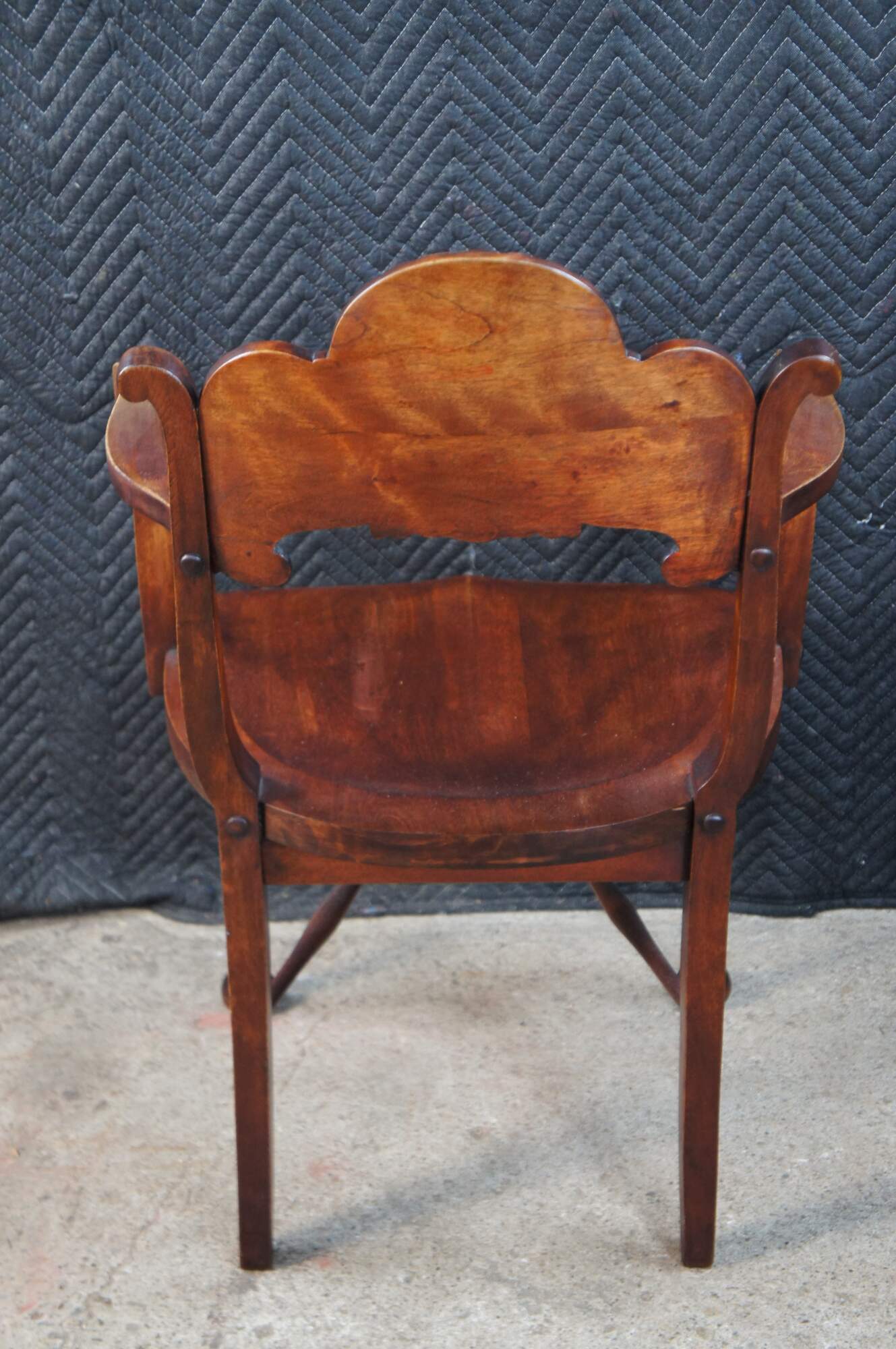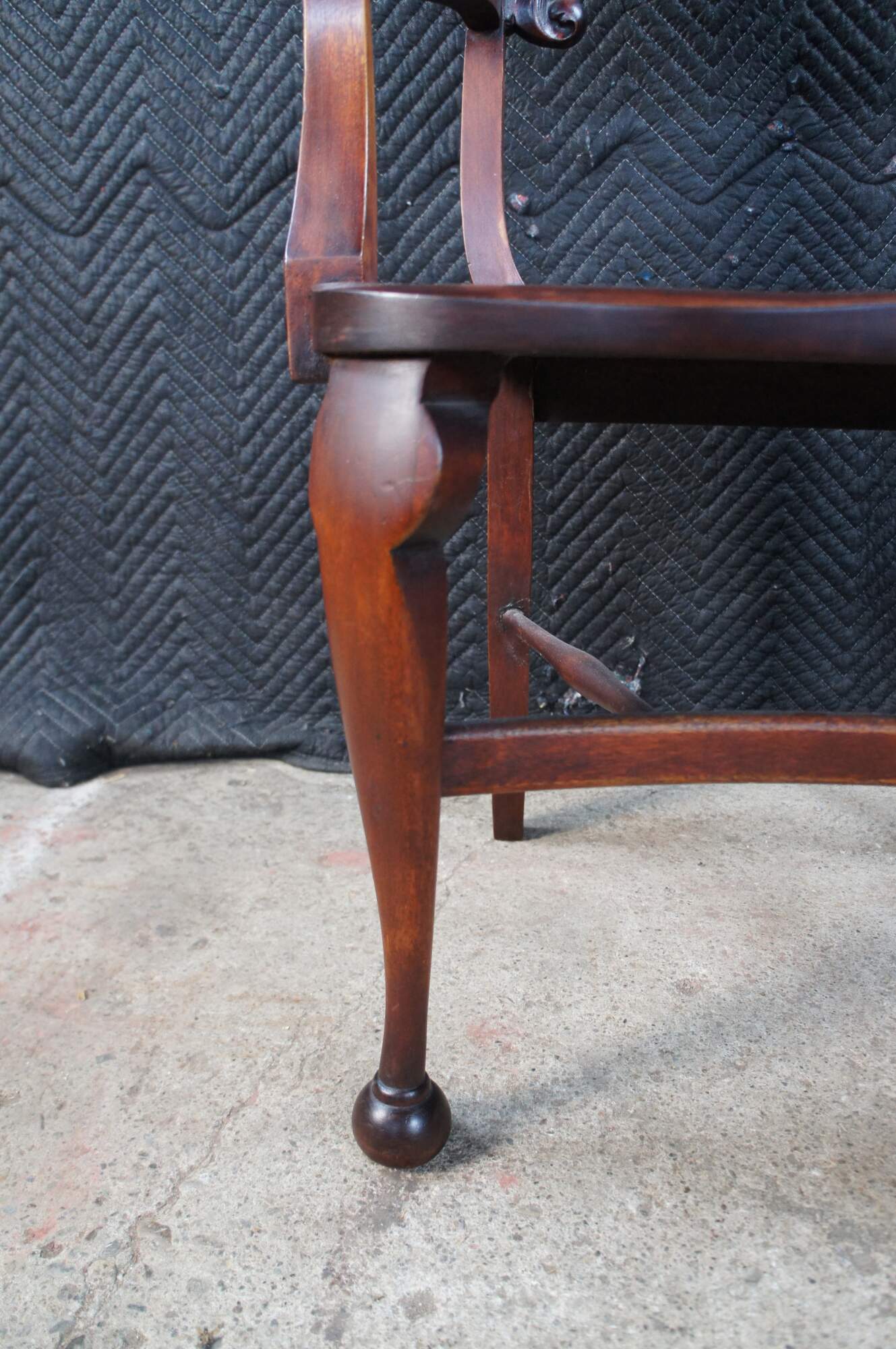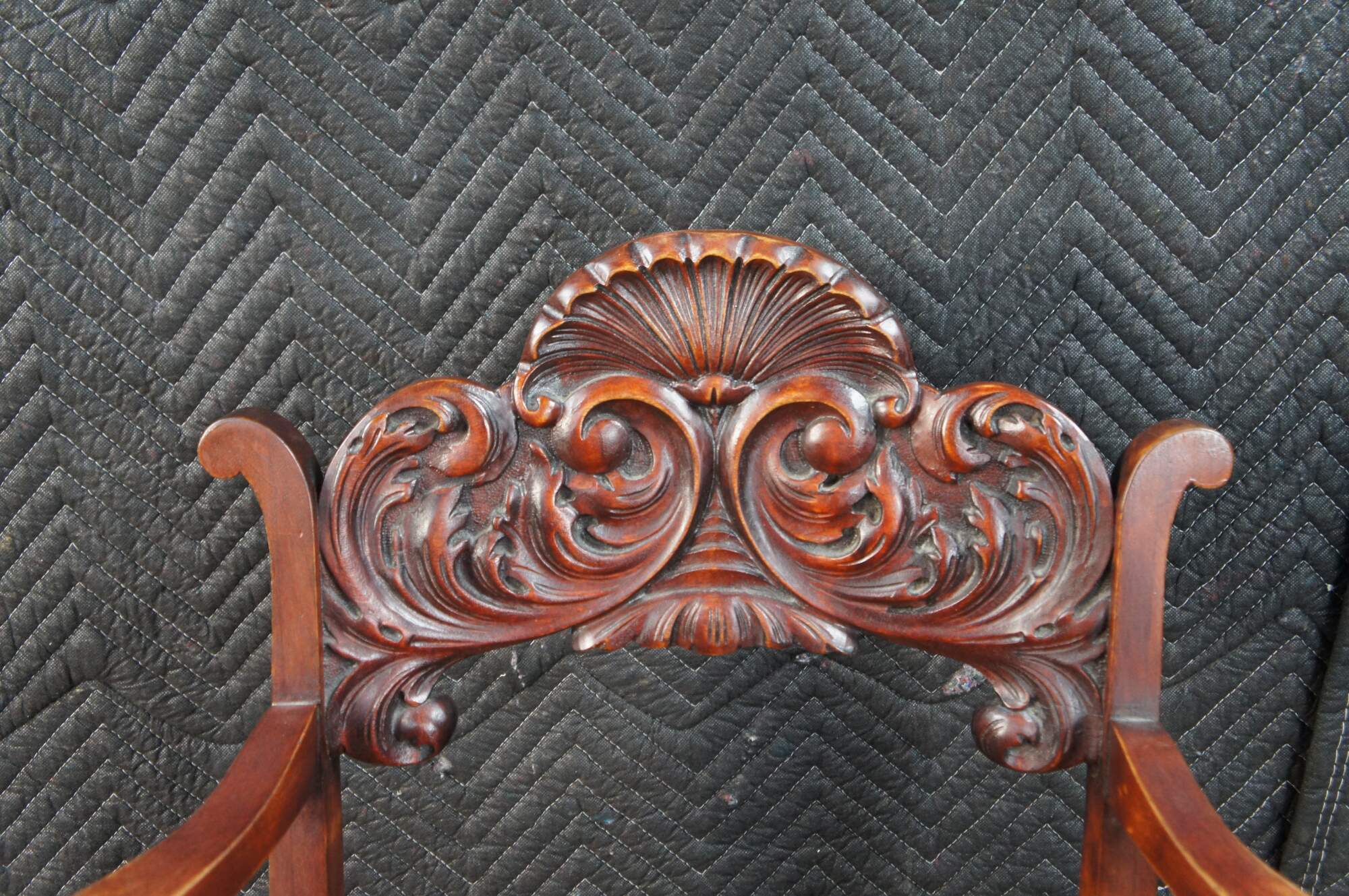Vintage walnut saddle seat style desk chair featuring Victorian Revival styling with carved acanthus and shell design, and ball feet. Possibly Stomps-Burkhardt.