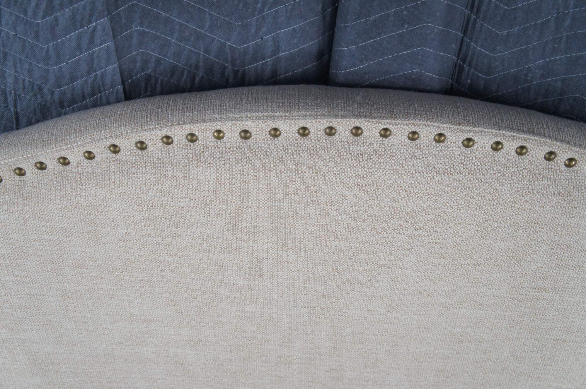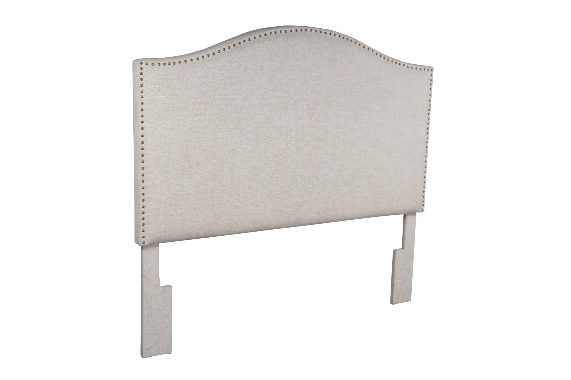 A modern upholstered camelback full size bed. Features nailhead trim. The bed has two settings and looks like it can be used with a double or a twin.