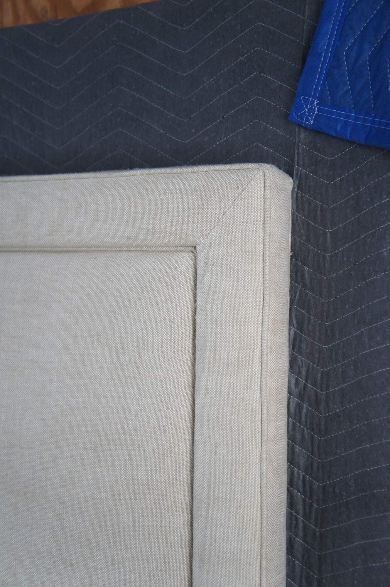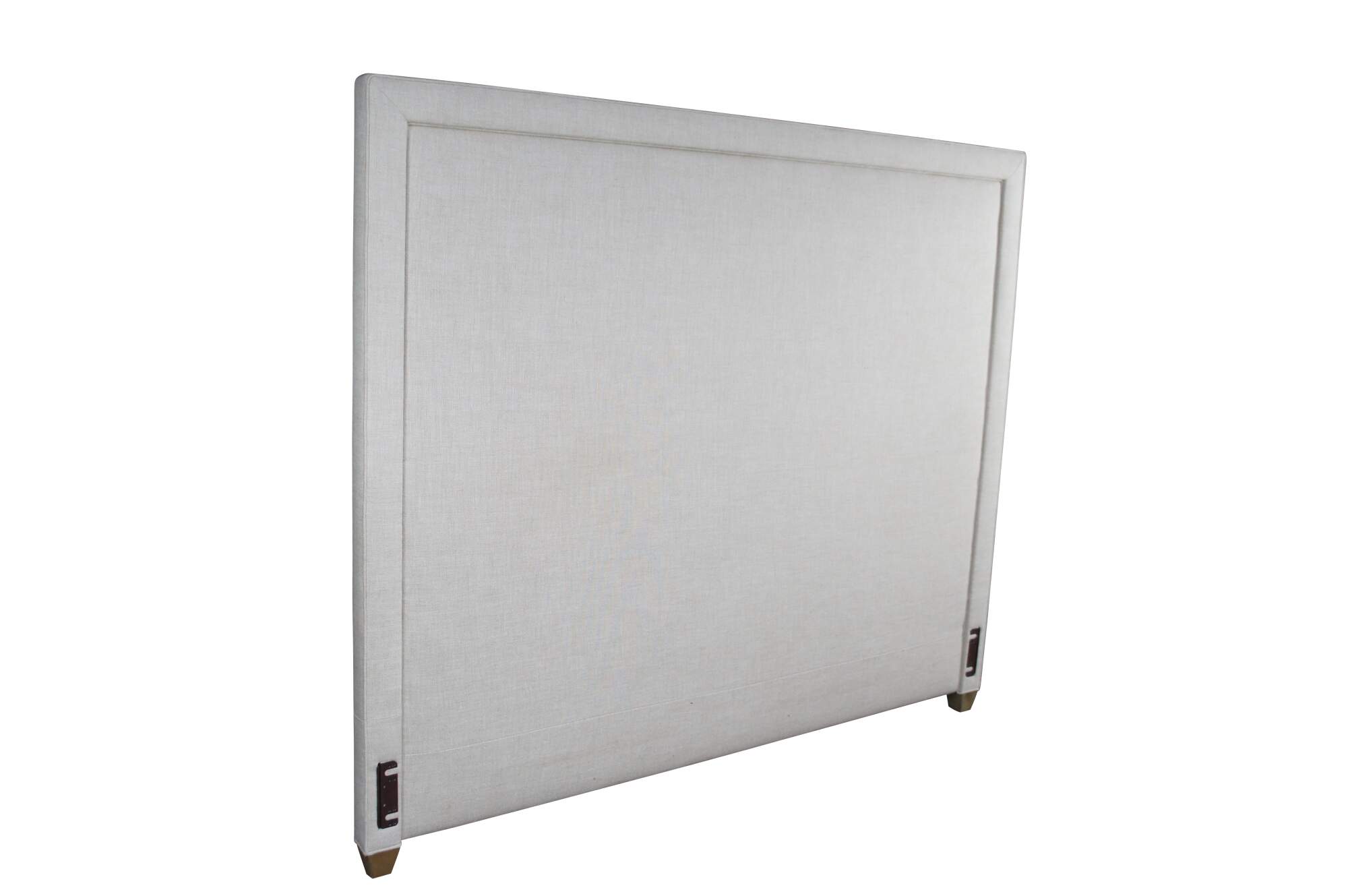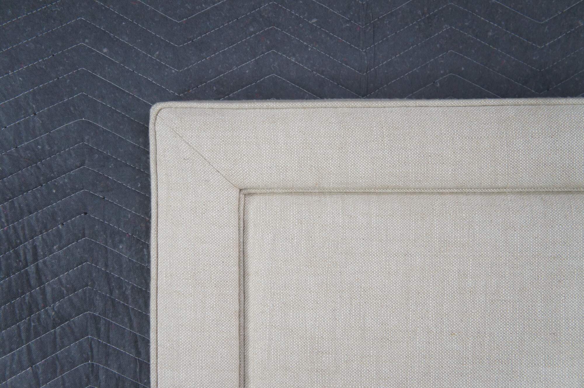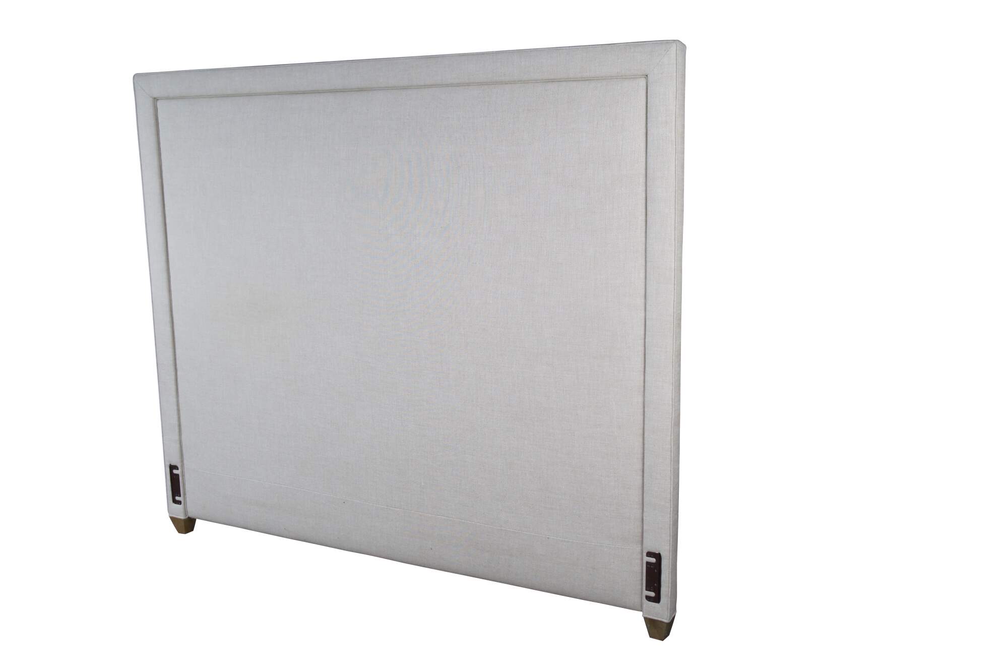 Restoration Hardware Wallace Upholstered Modern King Size Headboard. Circa 2015. Upholstered in linen with nailhead trim and wood tapered feet.