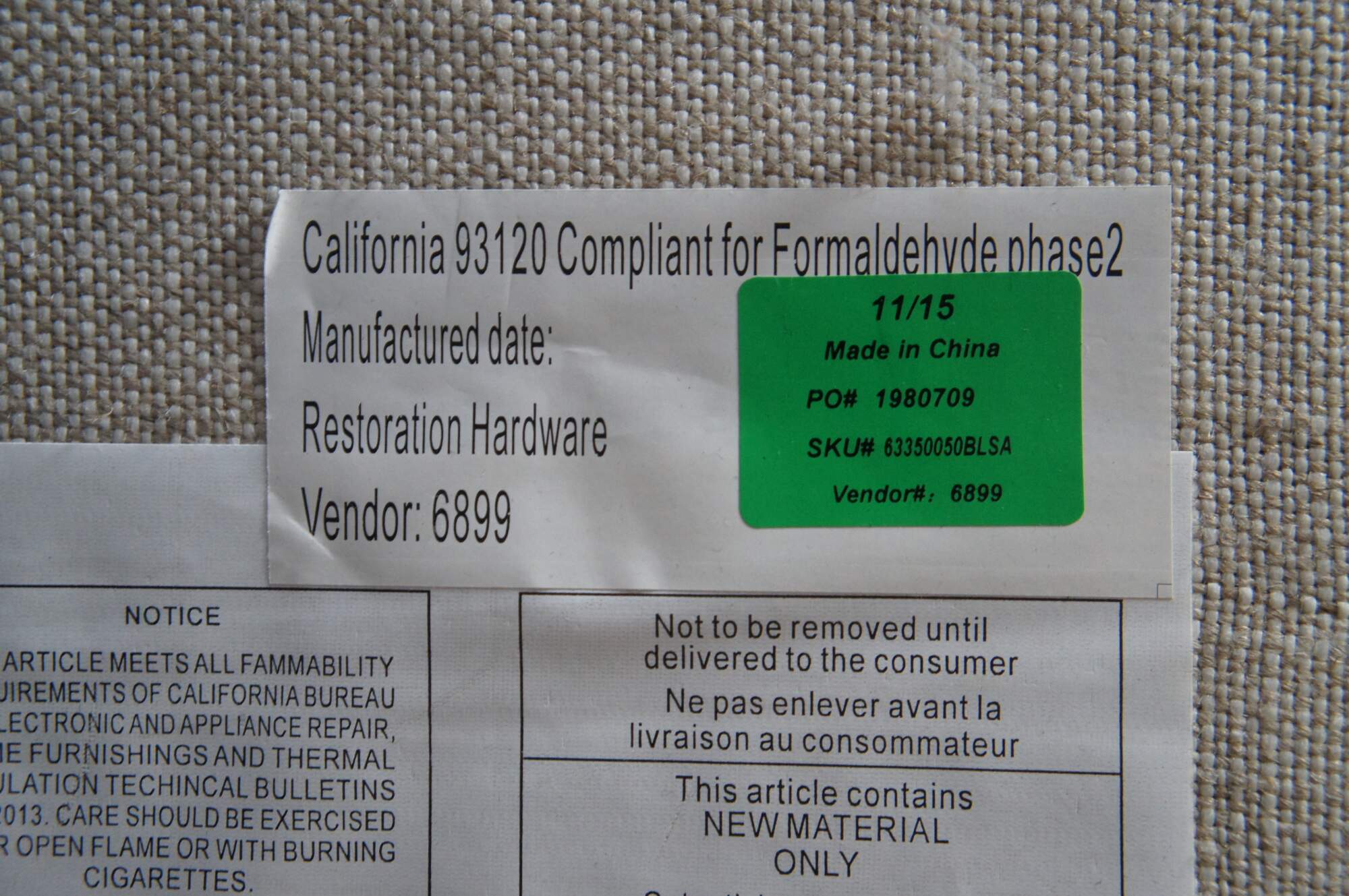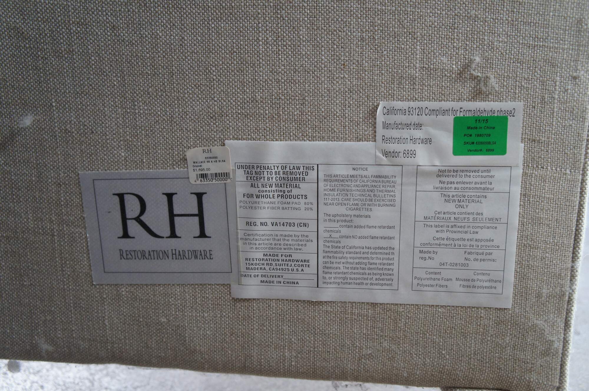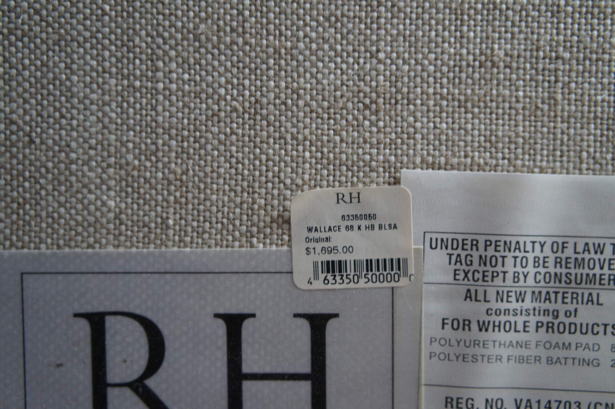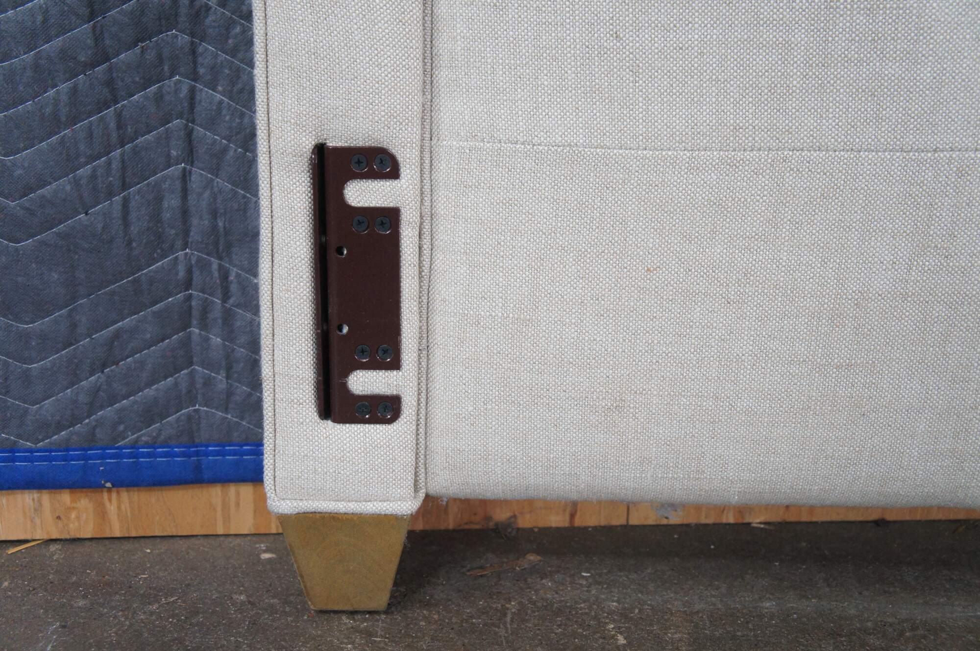 Restoration Hardware Wallace Upholstered Modern King Size Headboard. Circa 2015. Upholstered in linen with nailhead trim and wood tapered feet.